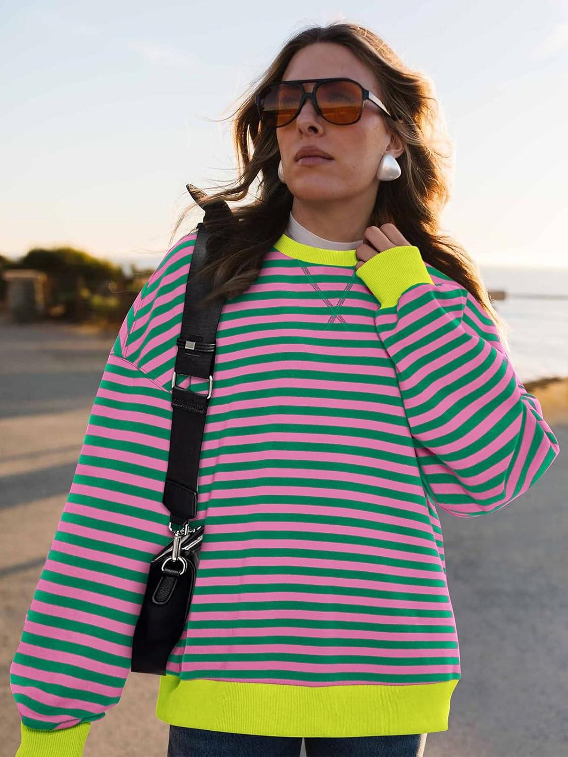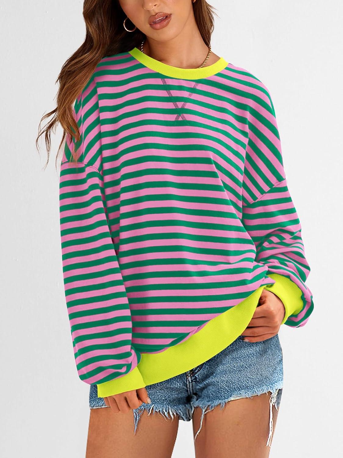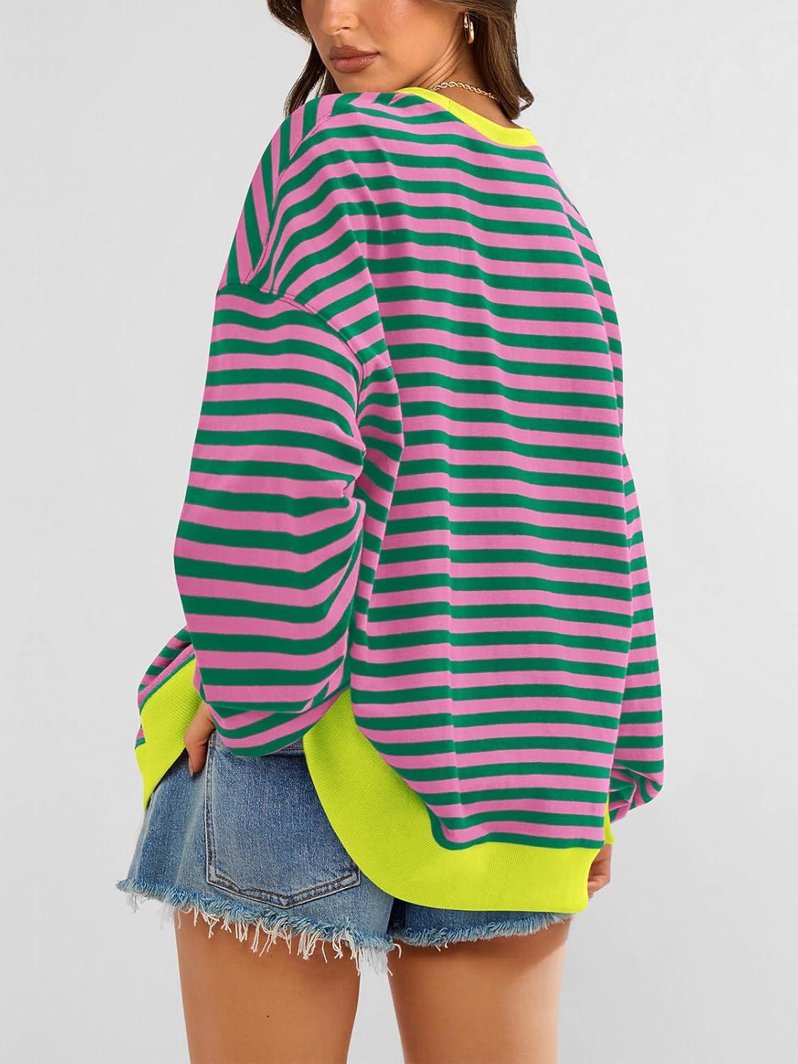 PRETTYGARDEN Womens Striped Oversized Sweatshirt Color Block Crew Neck Long Sleeve Casual Loose Pullover Top Y2K Clothes(Pink Green)