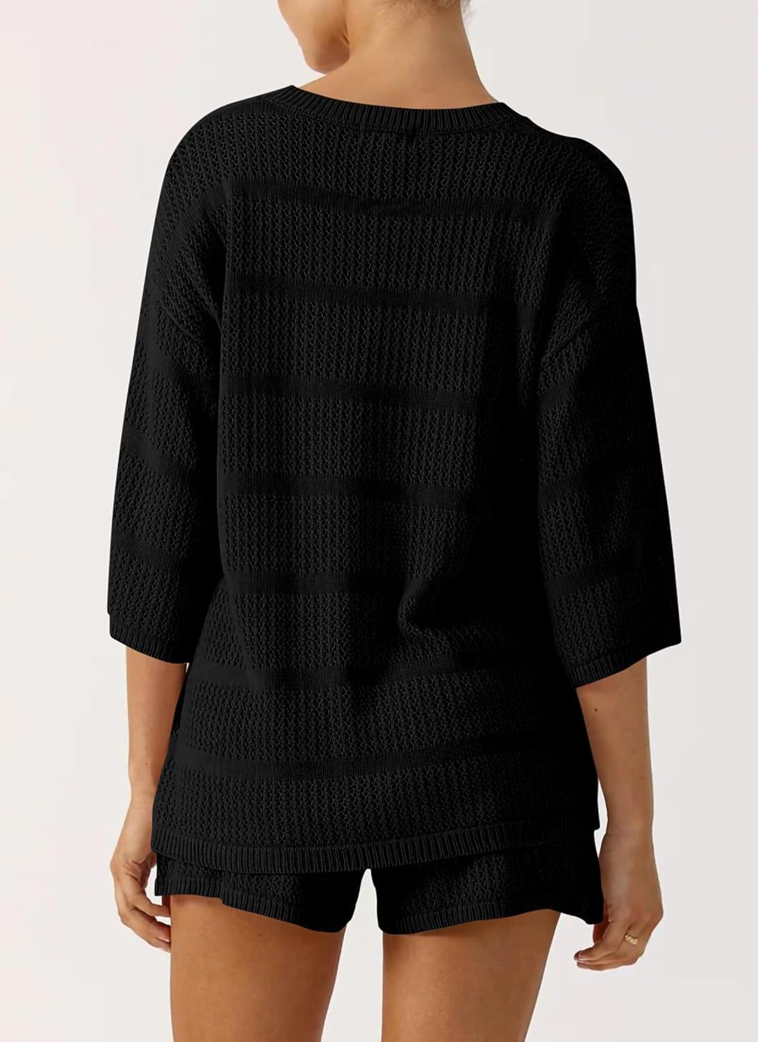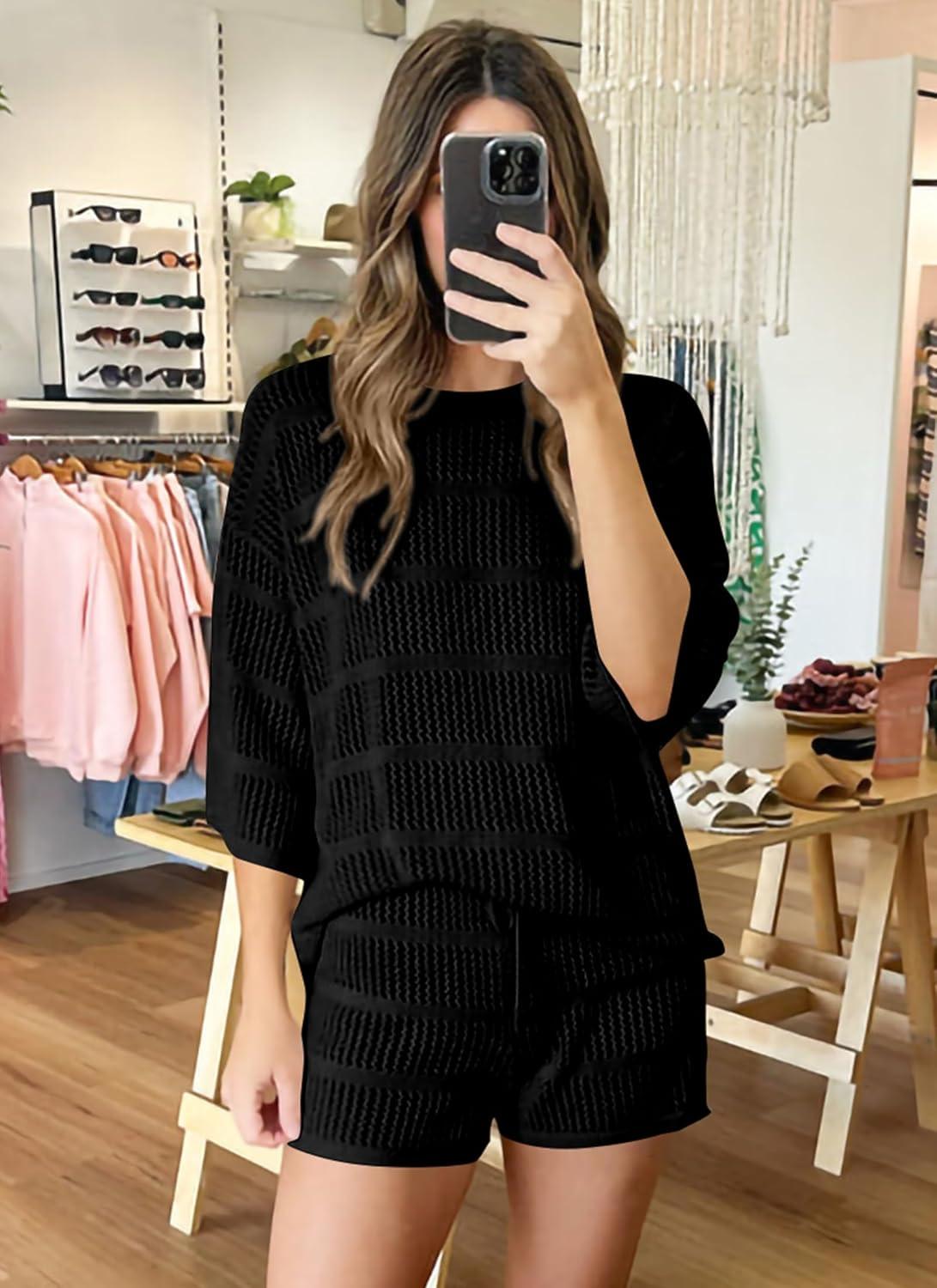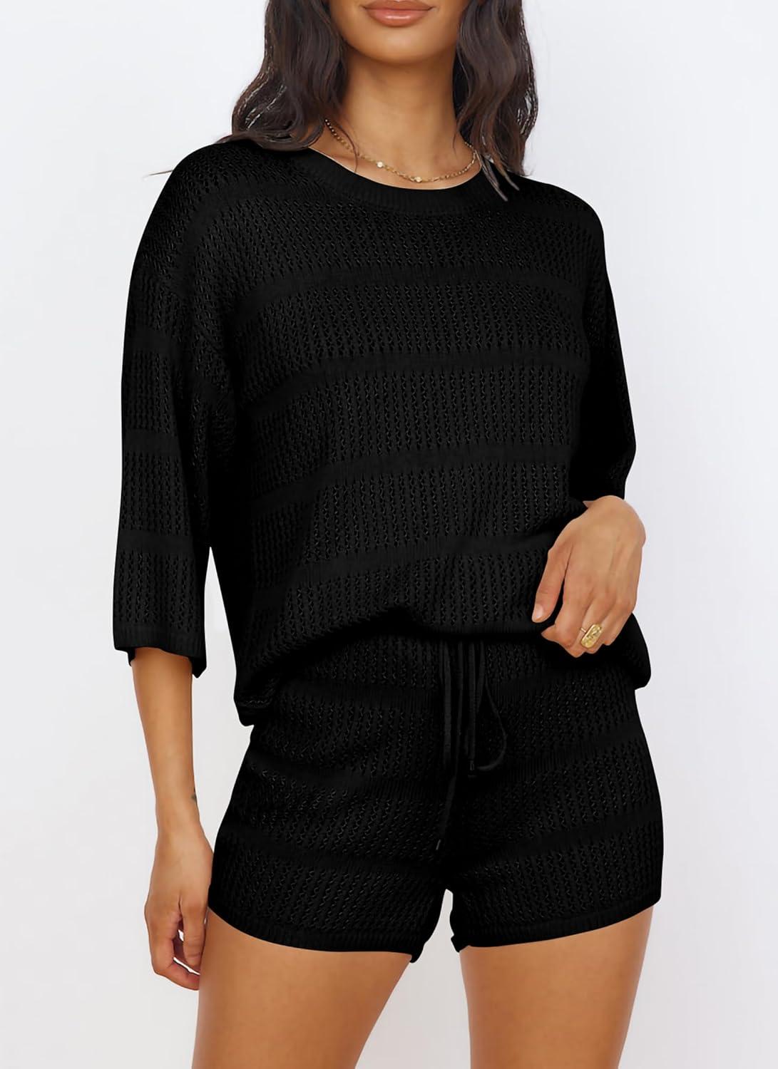 PRETTYGARDEN Women's Summer 2 Piece Cover up Knit Swimsuit Short Sleeve Tops Shorts Sets Bathing Suit Beach Outfits(Black)