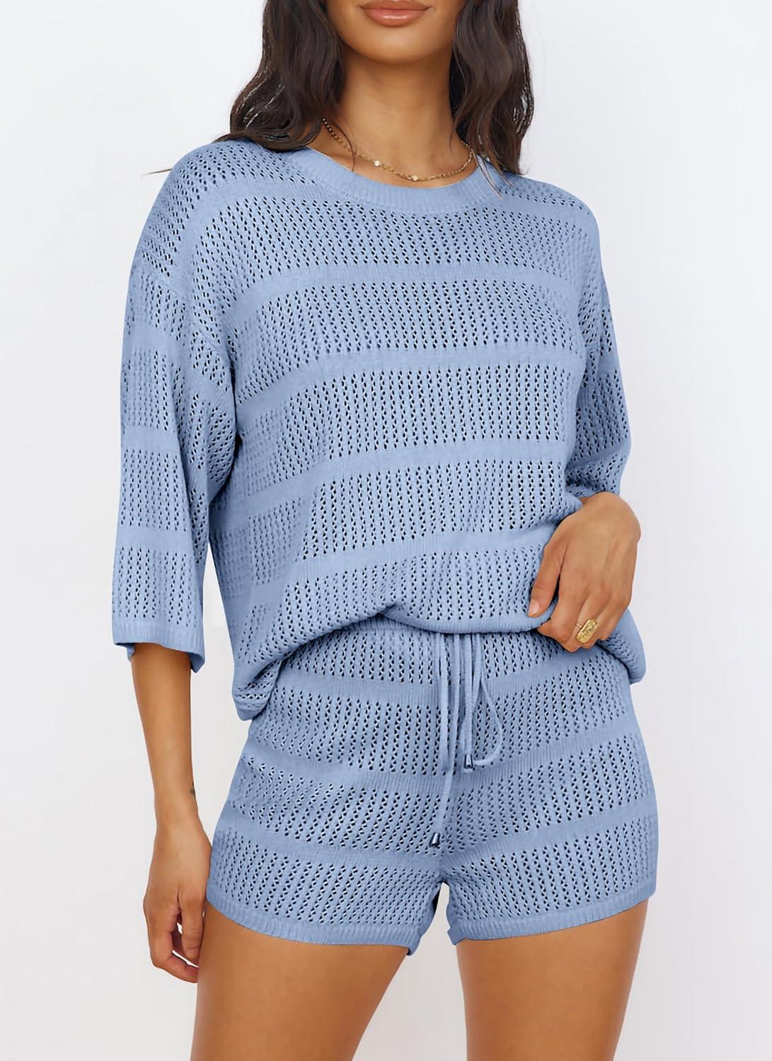 imagePRETTYGARDEN Womens Summer 2 Piece Cover up Knit Swimsuit Short Sleeve Tops Shorts Sets Bathing Suit Beach OutfitsLight Blue