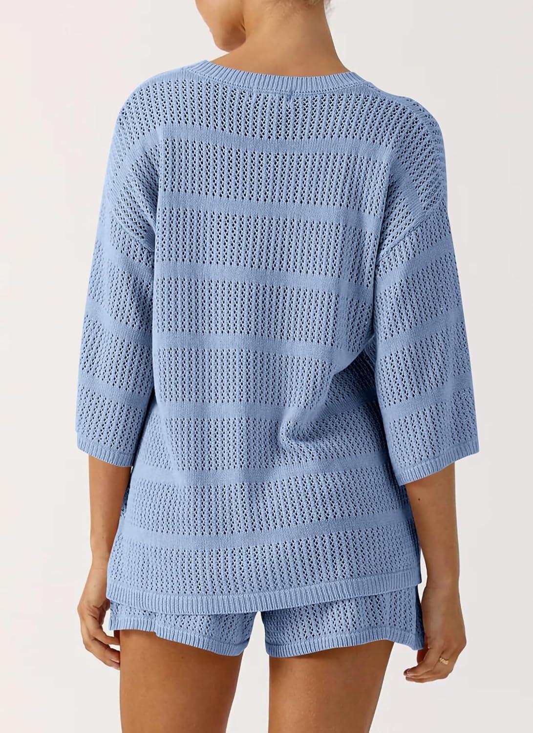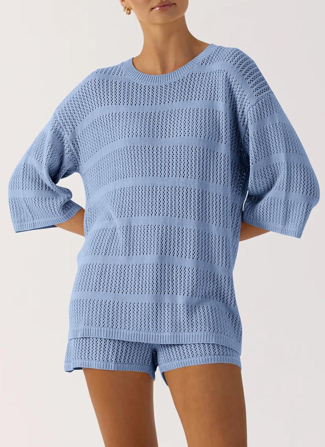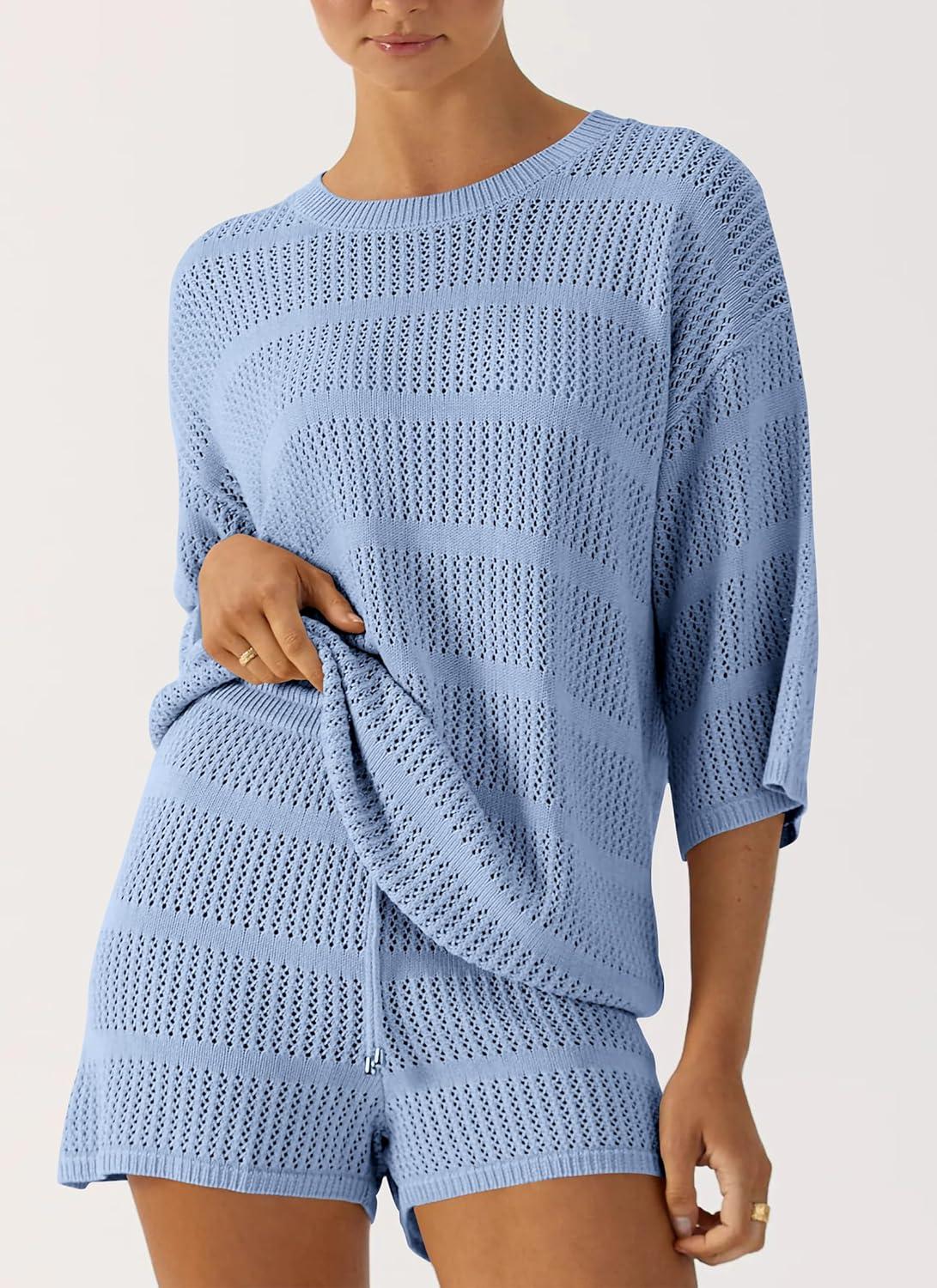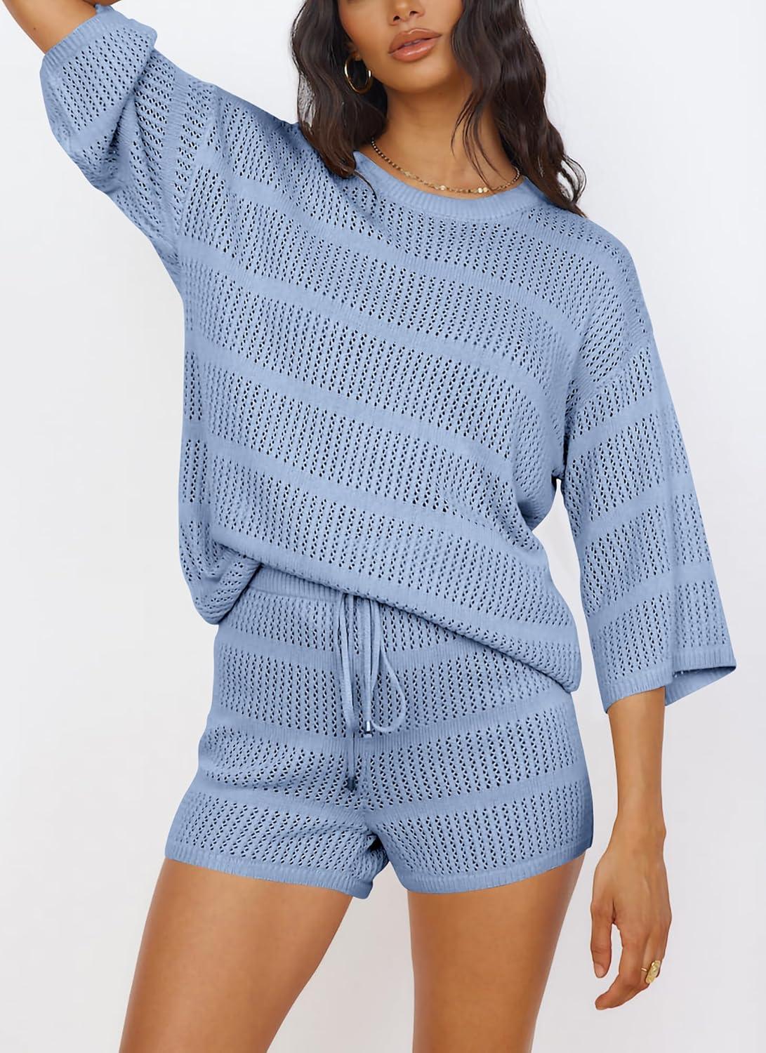 PRETTYGARDEN Women's Summer 2 Piece Cover up Knit Swimsuit Short Sleeve Tops Shorts Sets Bathing Suit Beach Outfits(Light Blue)