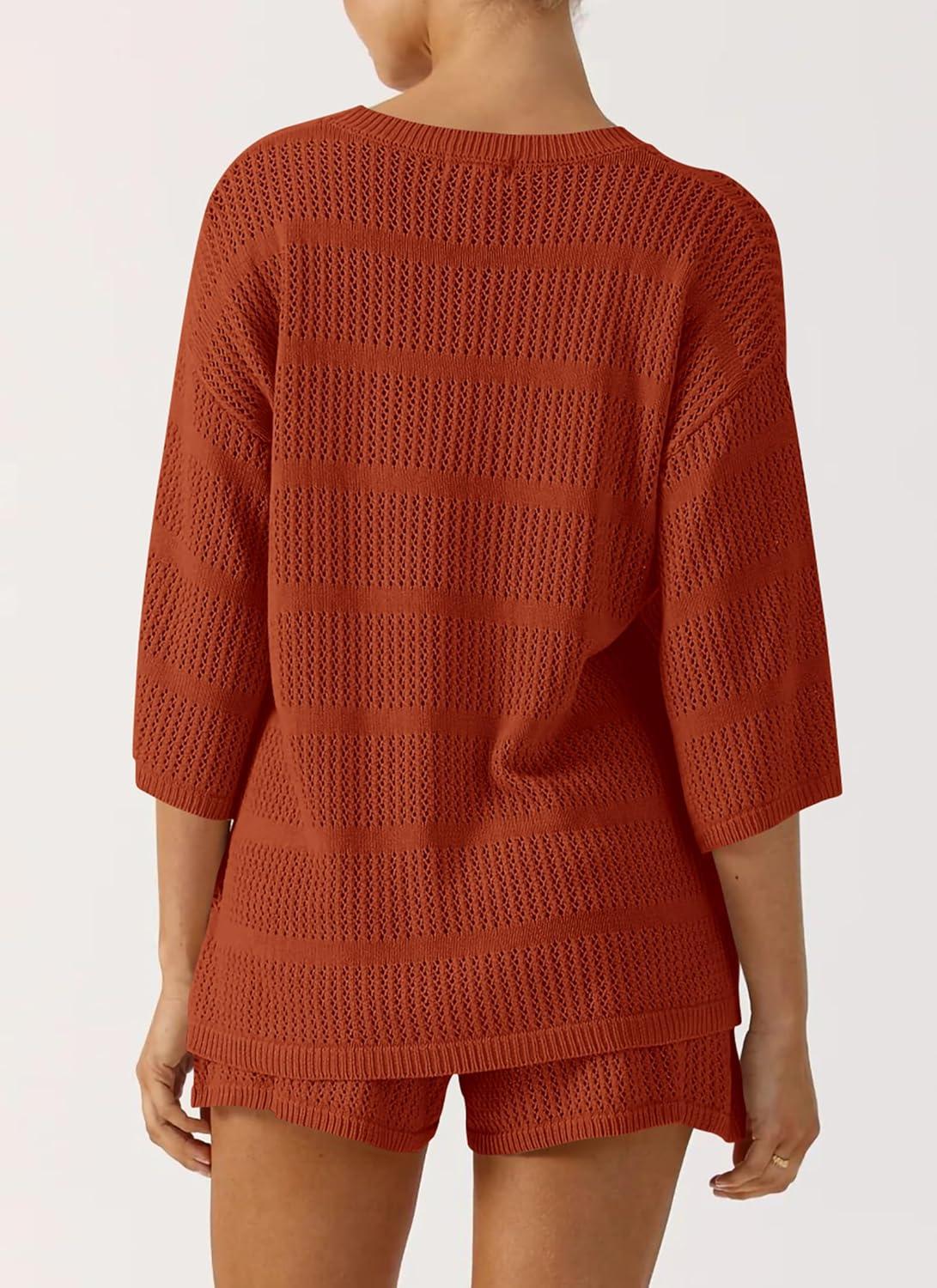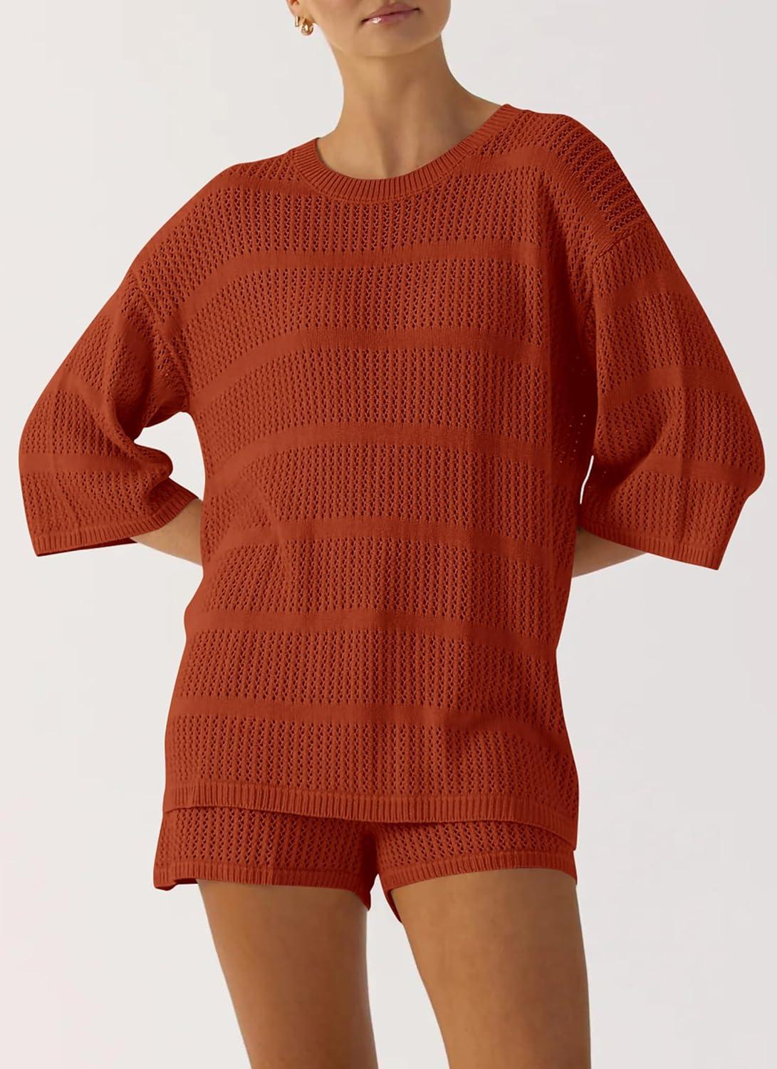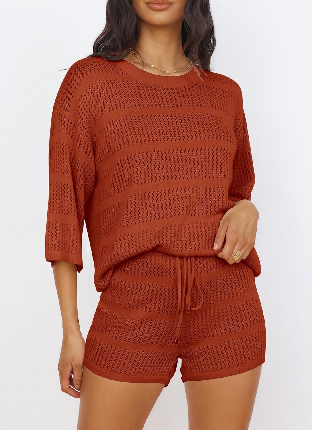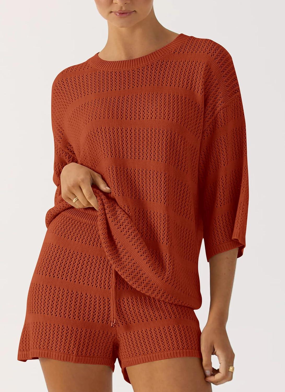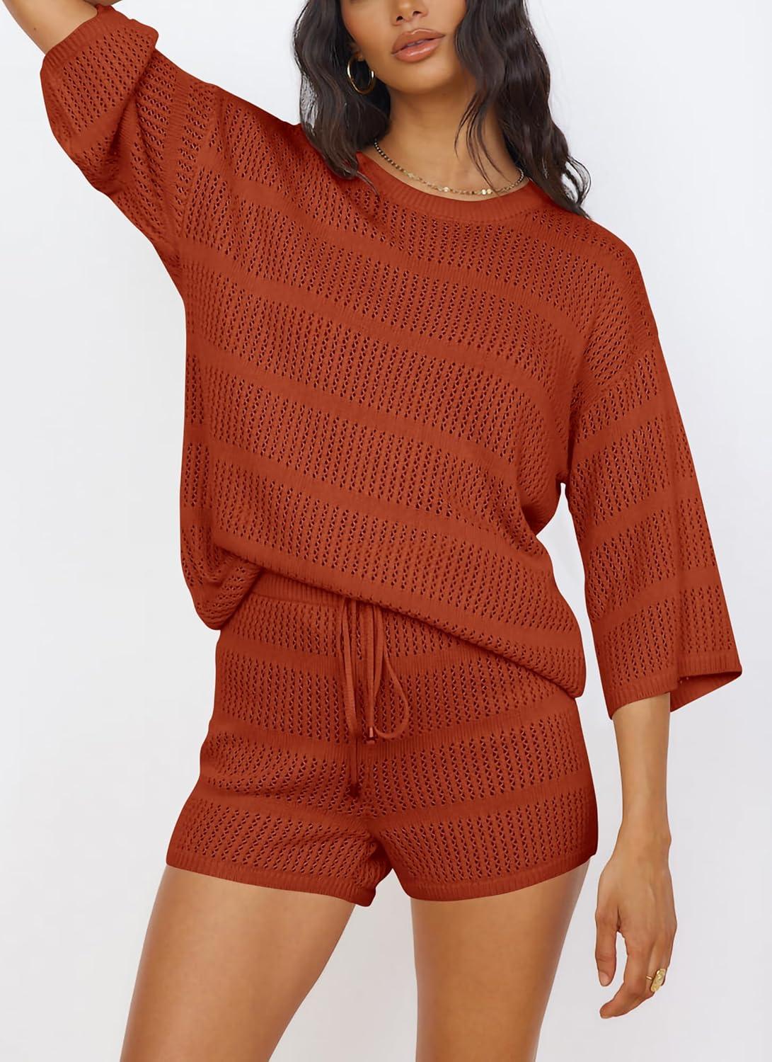 PRETTYGARDEN Women's Summer 2 Piece Cover up Knit Swimsuit Short Sleeve Tops Shorts Sets Bathing Suit Beach Outfits(Orange)