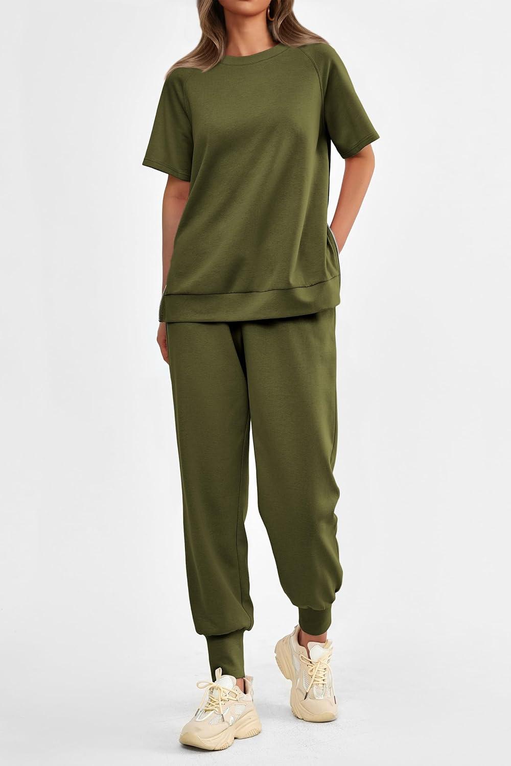 PRETTYGARDEN Women's Summer 2 Piece Outfit Tracksuits Casual Short Sleeve Tops High Waisted Sweatpants Set(Army Green)