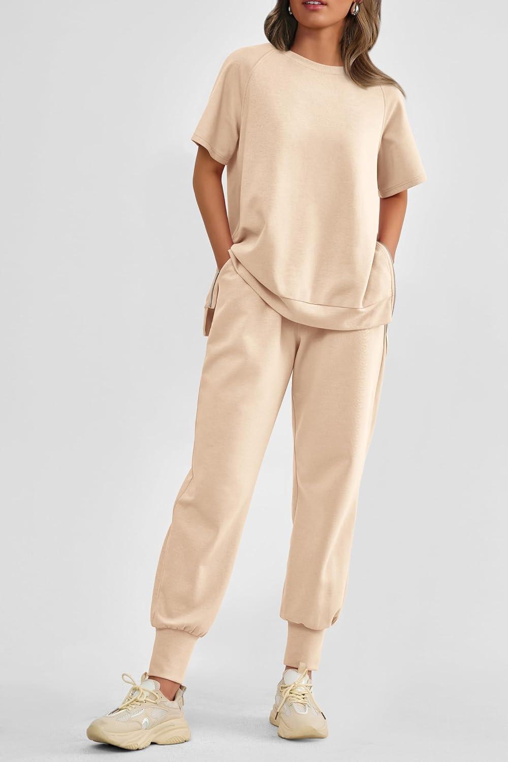 PRETTYGARDEN Women's Summer 2 Piece Outfit Tracksuits Casual Short Sleeve Tops High Waisted Sweatpants Set(Beige)