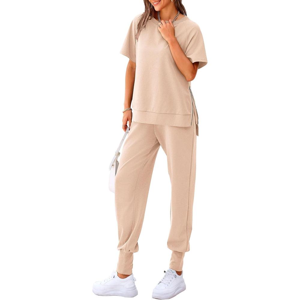 PRETTYGARDEN Women’s Summer 2 Piece Outfit Tracksuits Casual Short Sleeve Tops High Waisted Sweatpants Set(Beige)