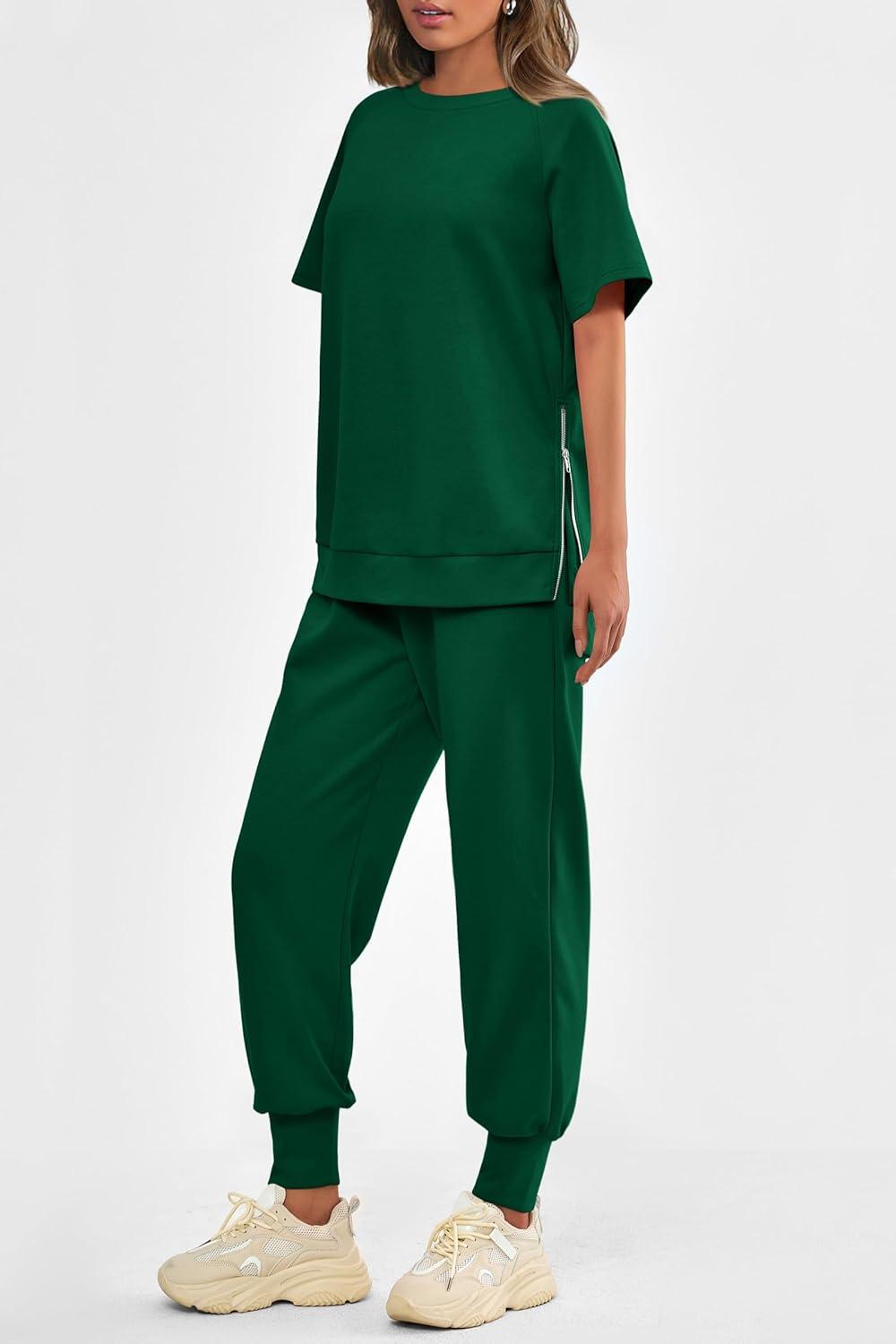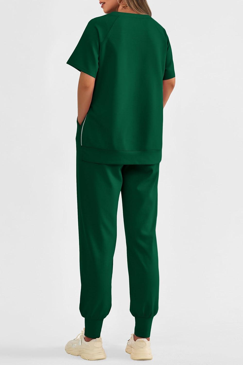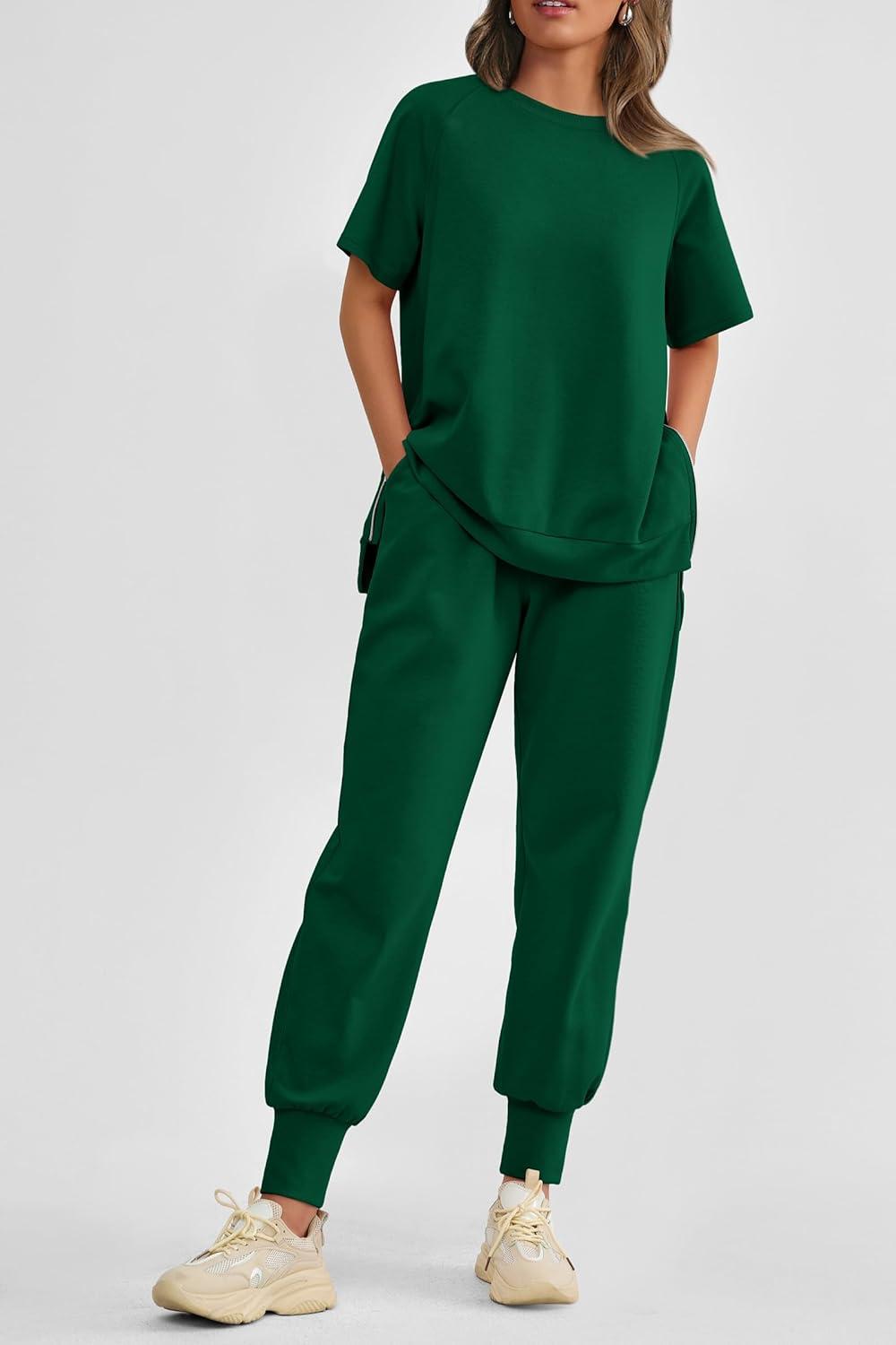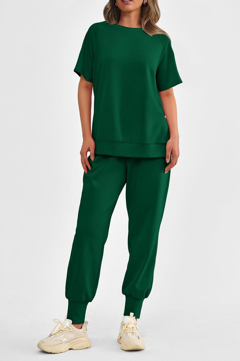 PRETTYGARDEN Women's Summer 2 Piece Outfit Tracksuits Casual Short Sleeve Tops High Waisted Sweatpants Set(Dark Green)
