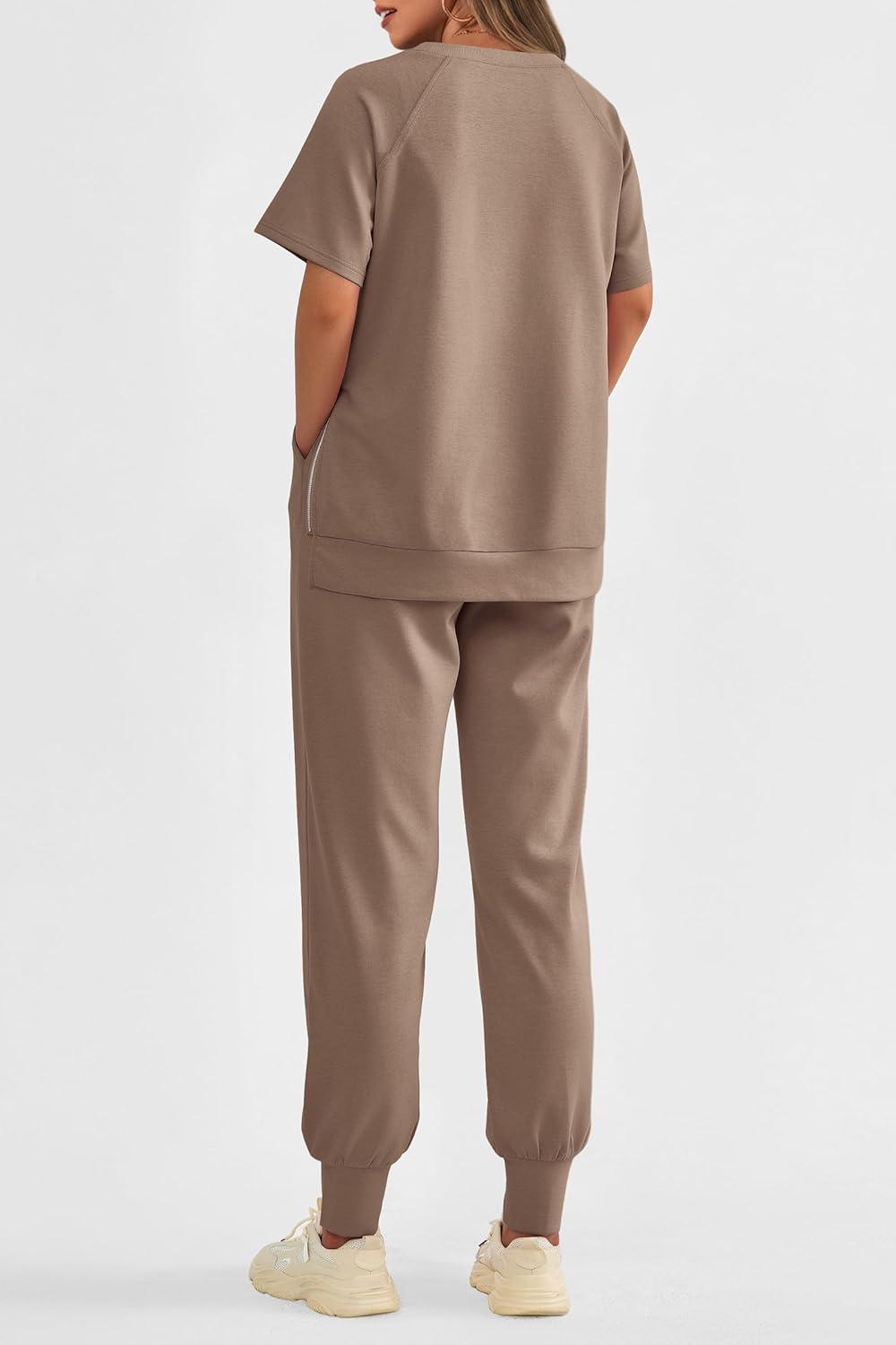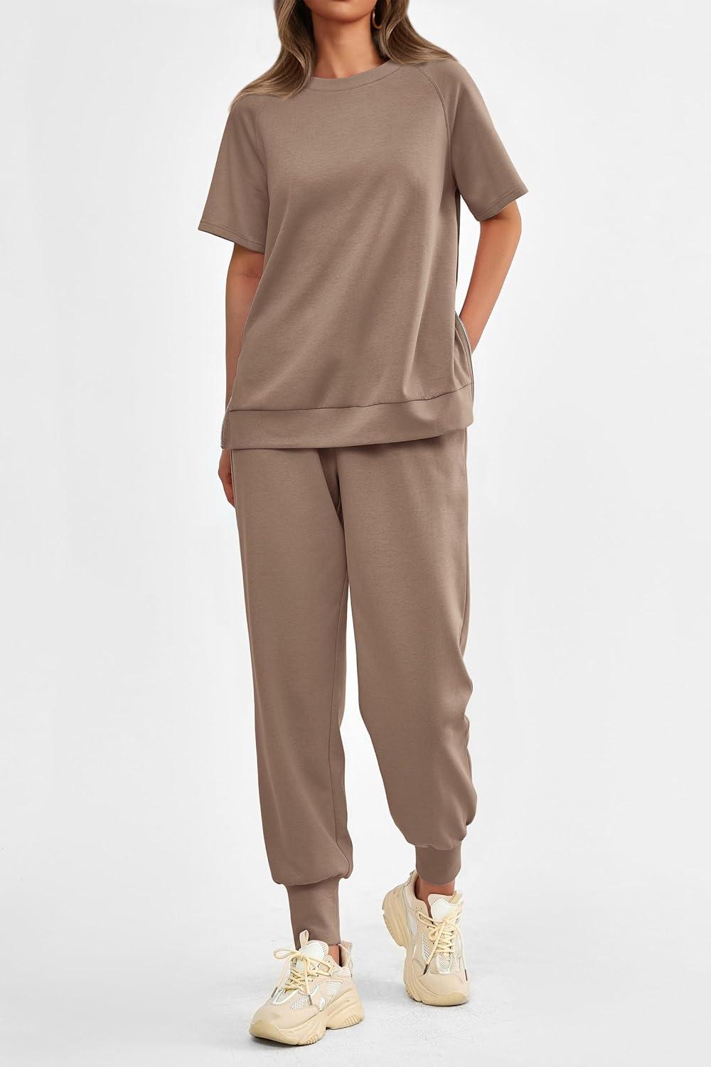 PRETTYGARDEN Women’s Summer 2 Piece Outfit Tracksuits Casual Short Sleeve Tops High Waisted Sweatpants Set(Khaki)
