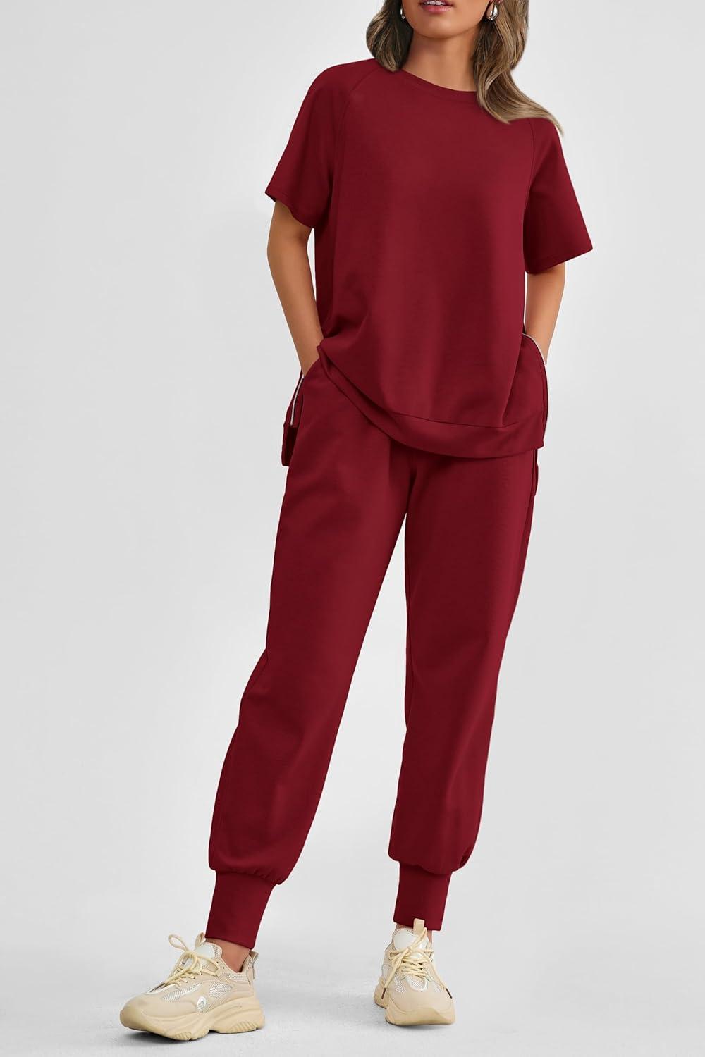 PRETTYGARDEN Women's Summer 2 Piece Outfit Tracksuits Casual Short Sleeve Tops High Waisted Sweatpants Set(Wine Red)
