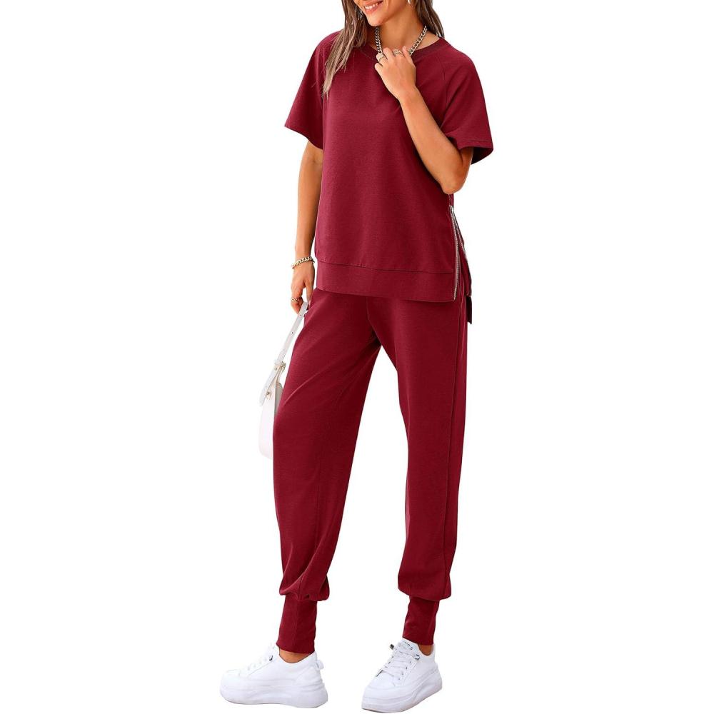 imagePRETTYGARDEN Womens Summer 2 Piece Outfit Tracksuits Casual Short Sleeve Tops High Waisted Sweatpants SetWine Red