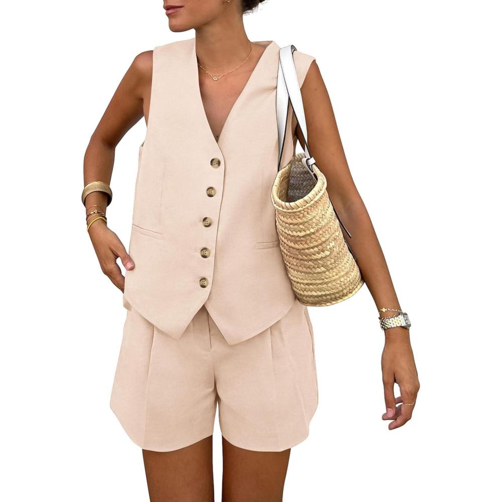 PRETTYGARDEN Women’s Summer 2 Piece Outfits Sleeveless Matching Sets Button Down V Neck Vest Waistcoat and Pockets Shorts(Beige)