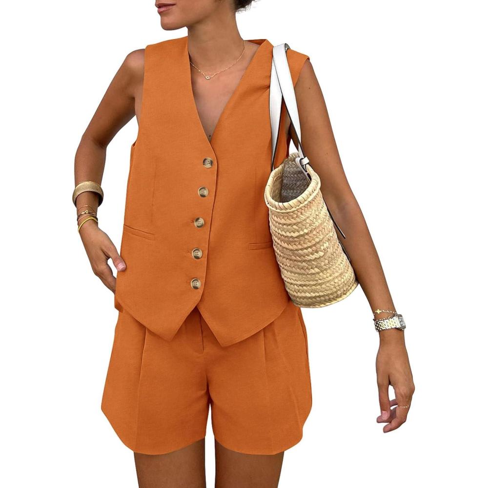 imagePRETTYGARDEN Womens Summer 2 Piece Outfits Sleeveless Matching Sets Button Down V Neck Vest Waistcoat and Pockets ShortsBrown Orange