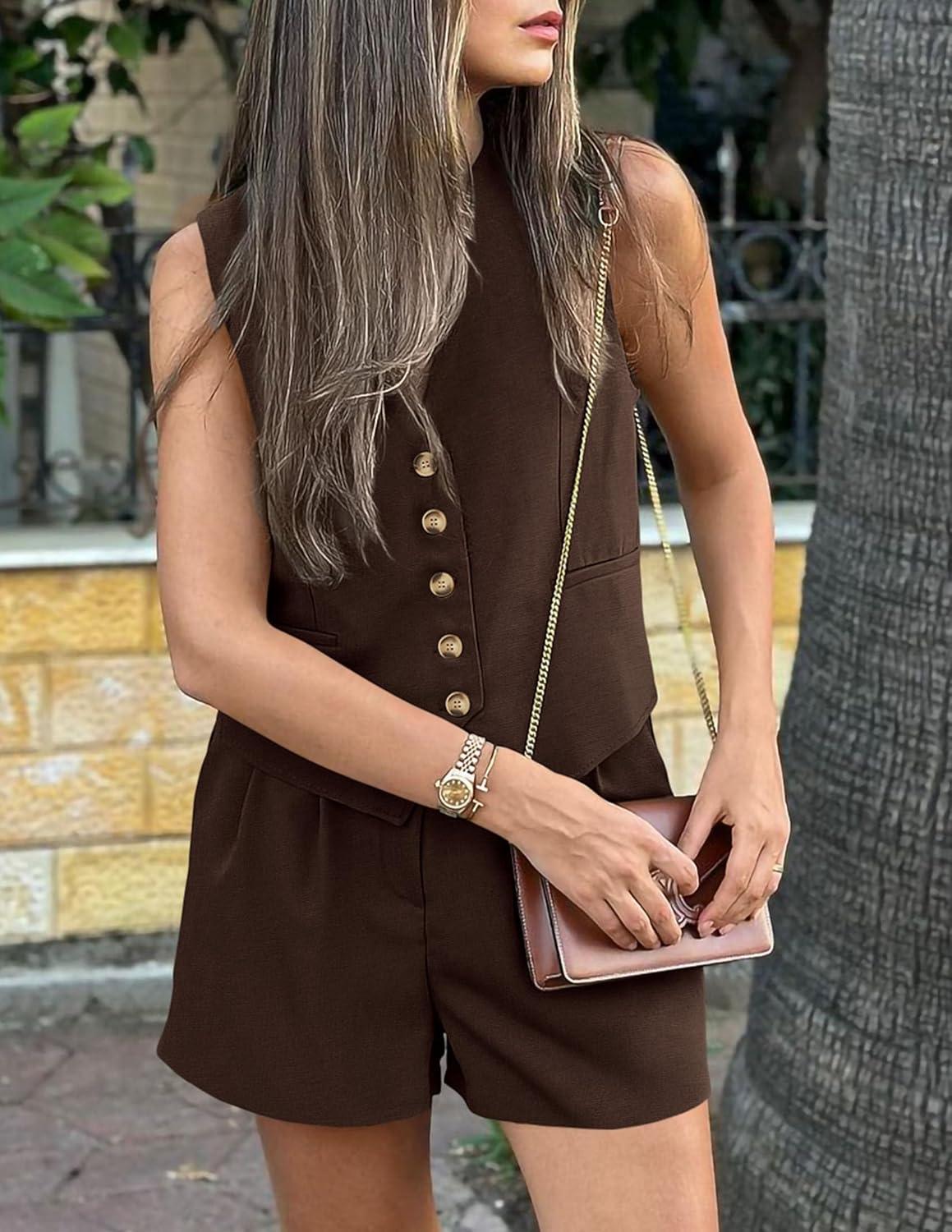 PRETTYGARDEN Women’s Summer 2 Piece Outfits Sleeveless Matching Sets Button Down V Neck Vest Waistcoat and Pockets Shorts(Dark Coffee)
