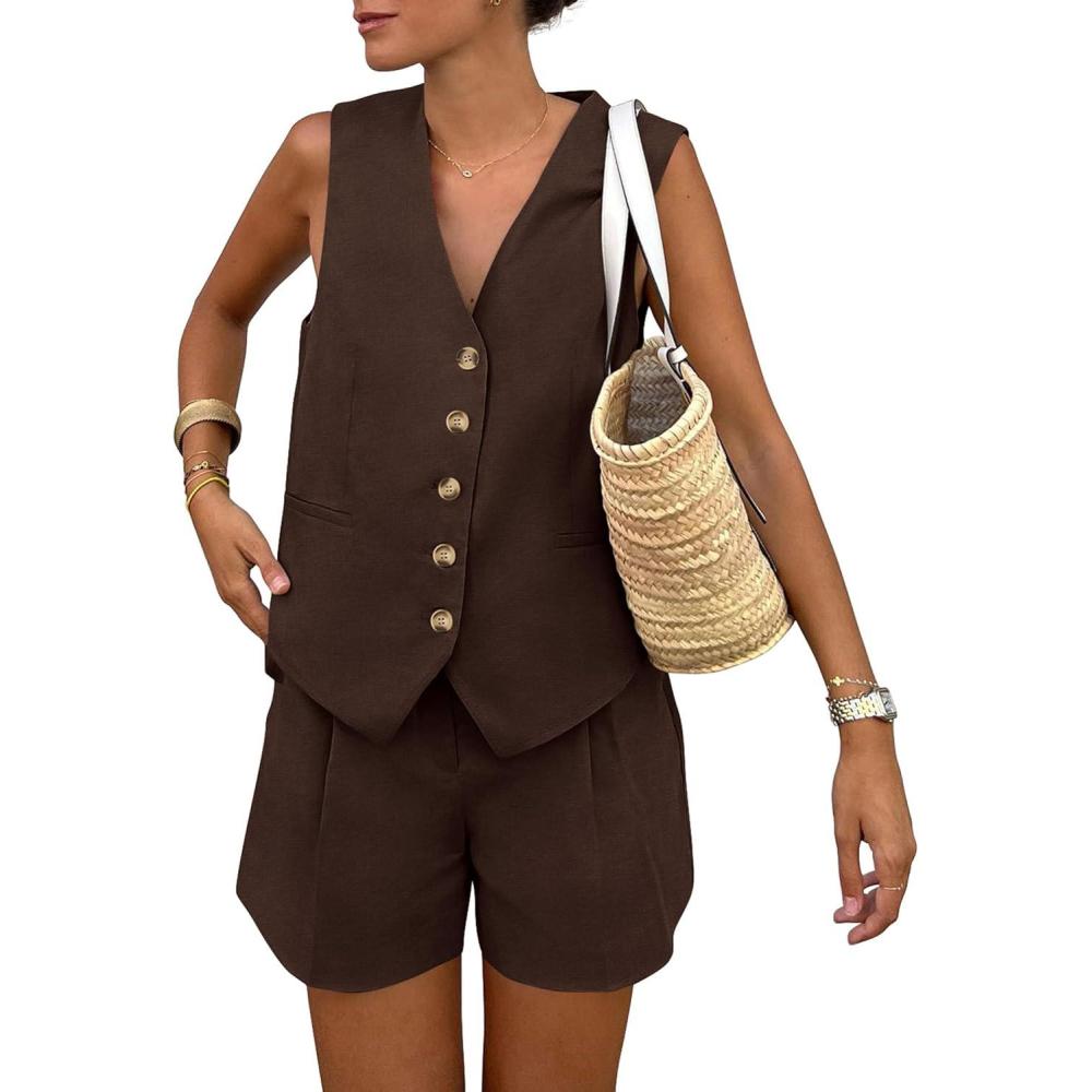 imagePRETTYGARDEN Womens Summer 2 Piece Outfits Sleeveless Matching Sets Button Down V Neck Vest Waistcoat and Pockets ShortsDark Coffee