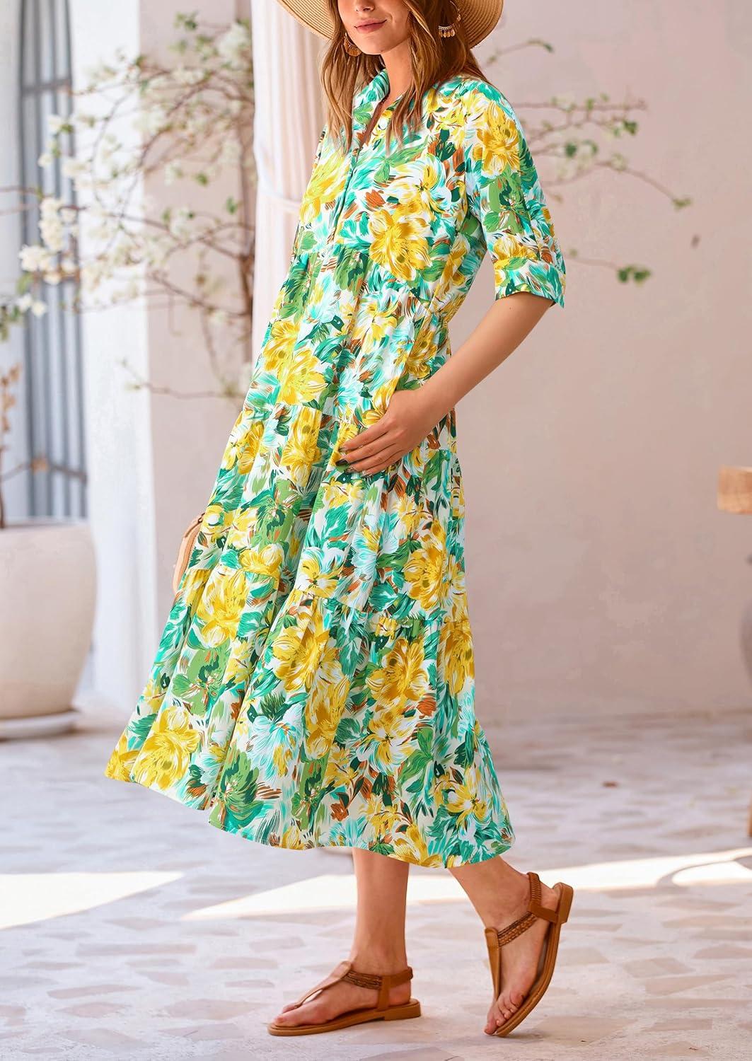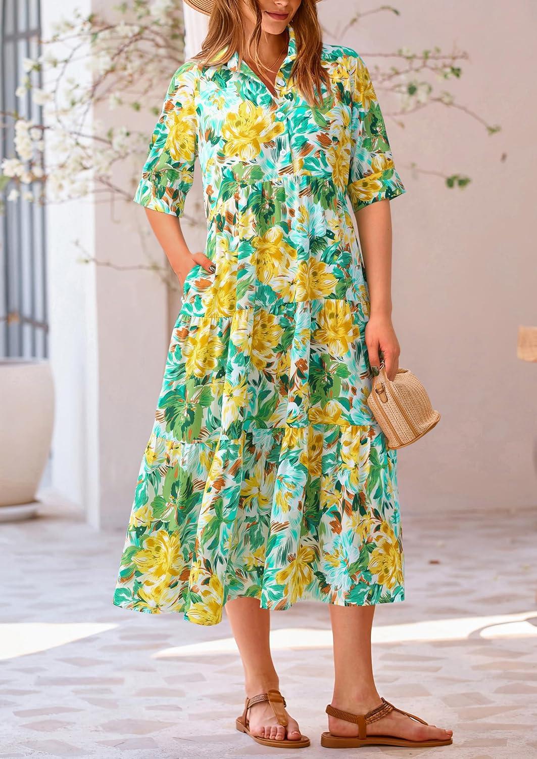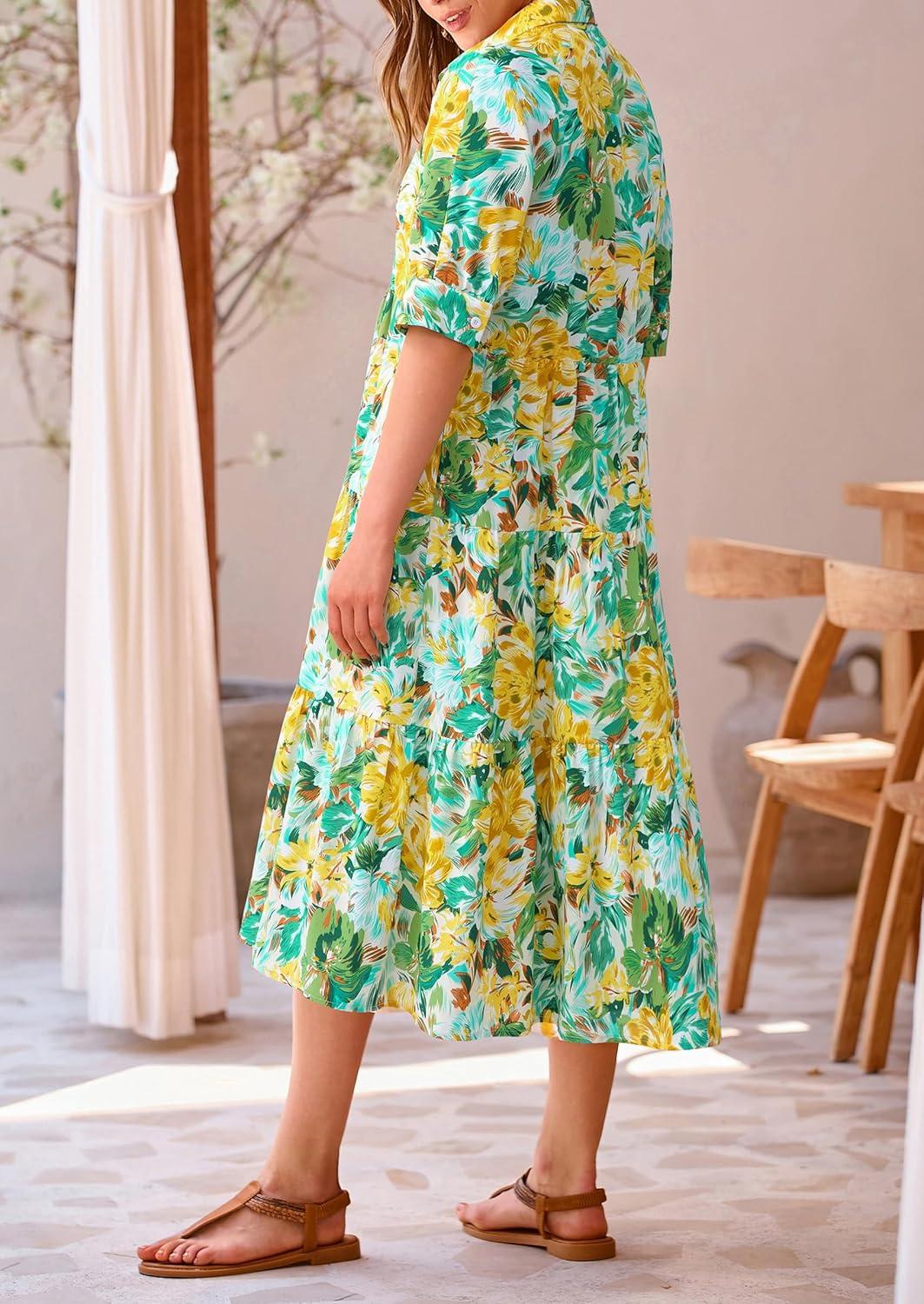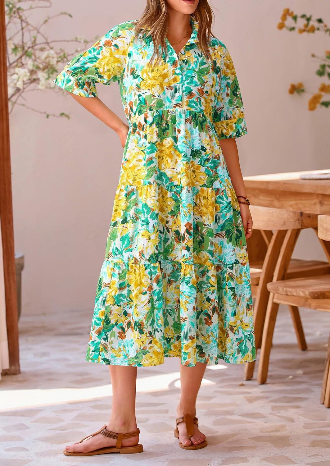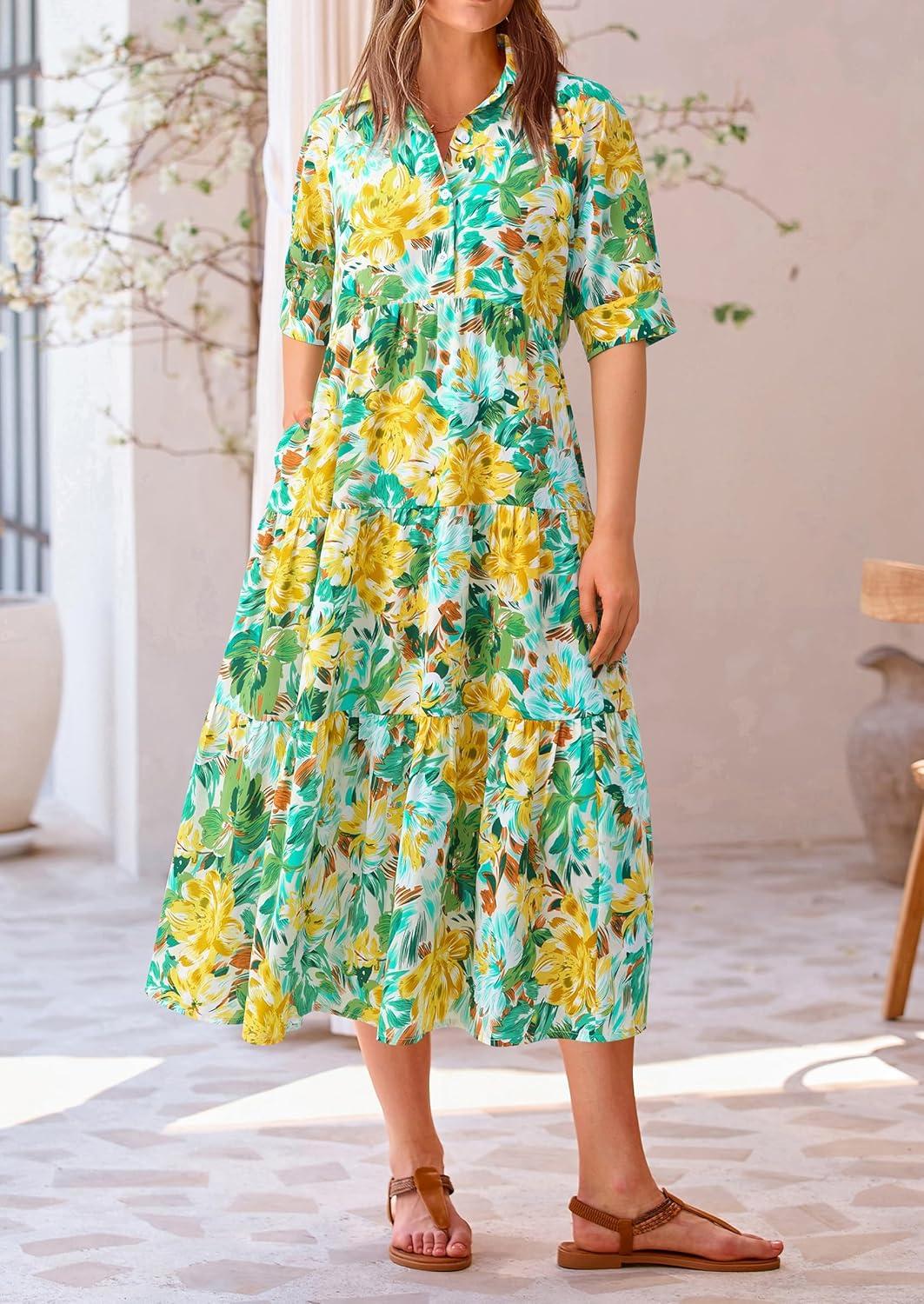 PRETTYGARDEN Women's Summer Beach Maxi Dress Short Sleeve Buttons Tiered Ruffle A Line Swing Dresses(Floral White Yellow)