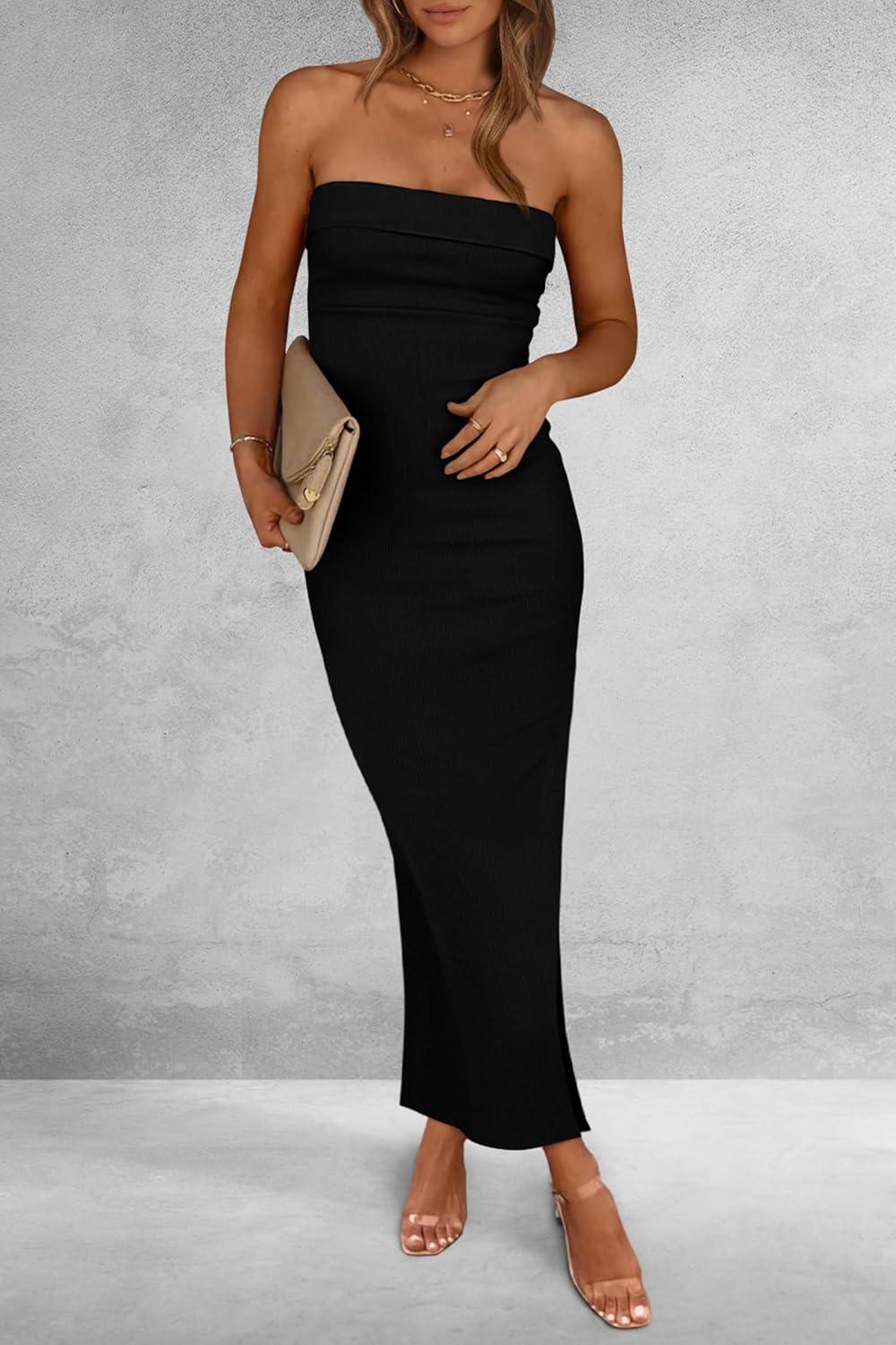 PRETTYGARDEN Women's Summer Bodycon Maxi Tube Dress Ribbed Strapless Side Slit Long Going Out Casual Elegant Party Dresses(Black)