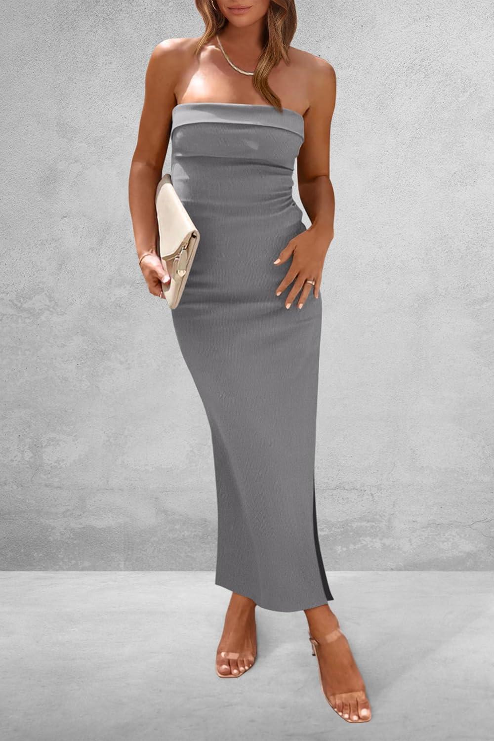 PRETTYGARDEN Women's Summer Bodycon Maxi Tube Dress Ribbed Strapless Side Slit Long Going Out Casual Elegant Party Dresses(Grey)