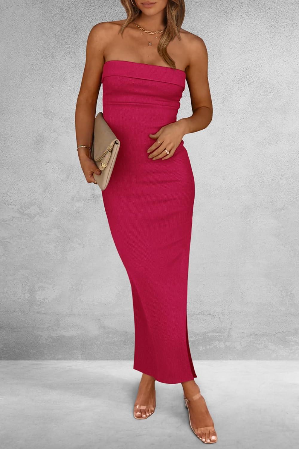 PRETTYGARDEN Women's Summer Bodycon Maxi Tube Dress Ribbed Strapless Side Slit Long Going Out Casual Elegant Party Dresses(Rose Red)