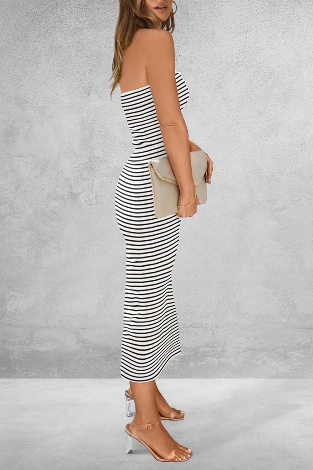 PRETTYGARDEN Women's Summer Bodycon Maxi Tube Dress Ribbed Strapless Side Slit Long Going Out Casual Elegant Party Dresses(Striped White Black)
