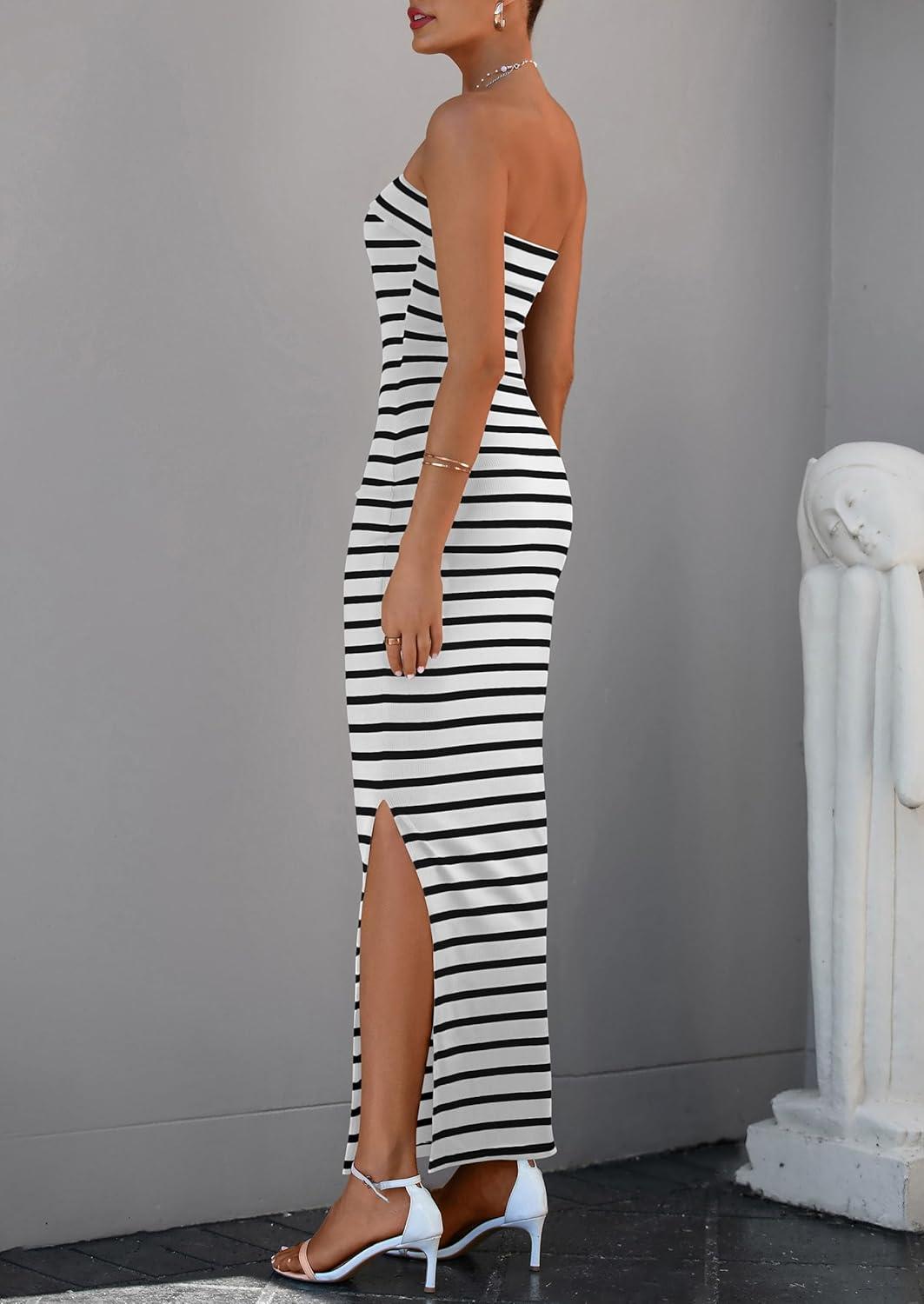 PRETTYGARDEN Women's Summer Bodycon Maxi Tube Dress Ribbed Strapless Side Slit Long Going Out Casual Elegant Party Dresses(Wide Striped Black White)