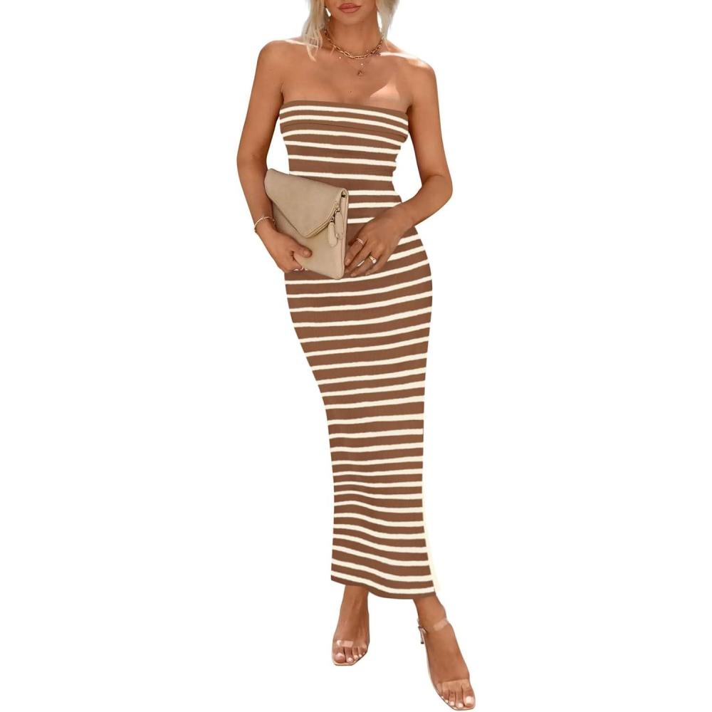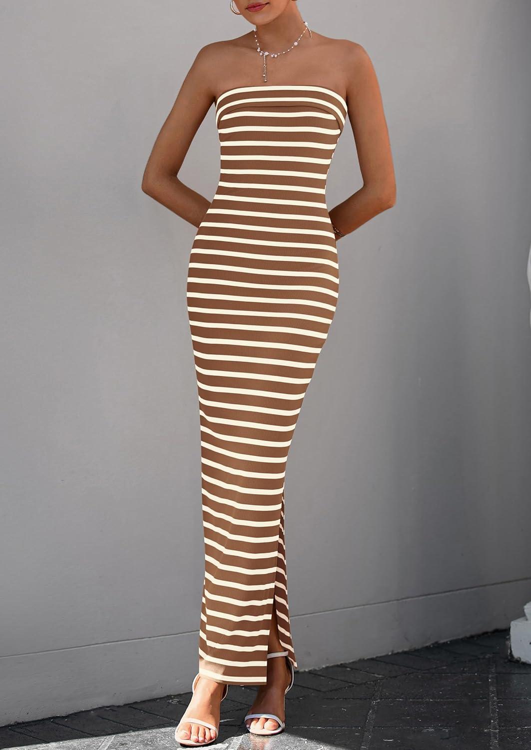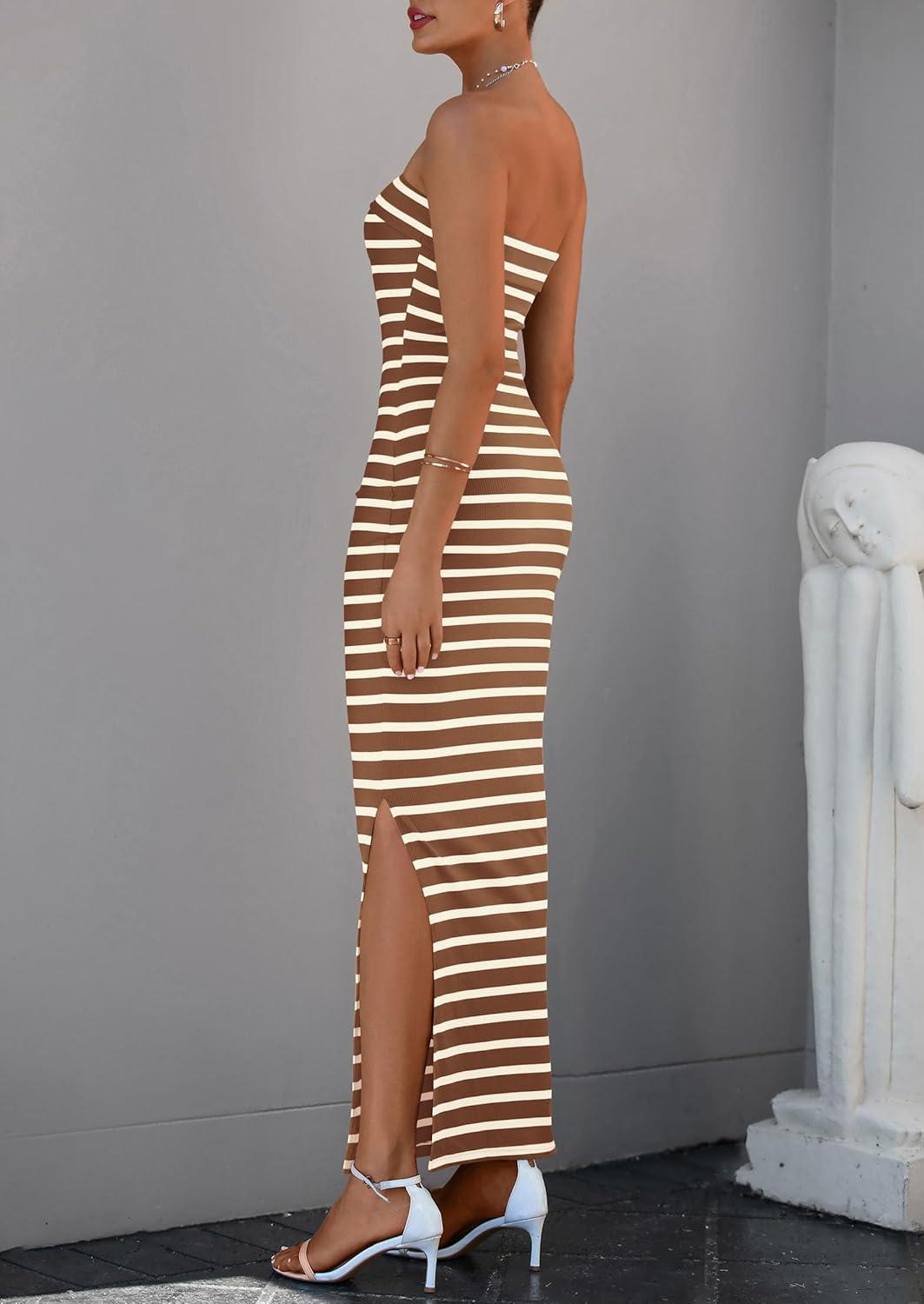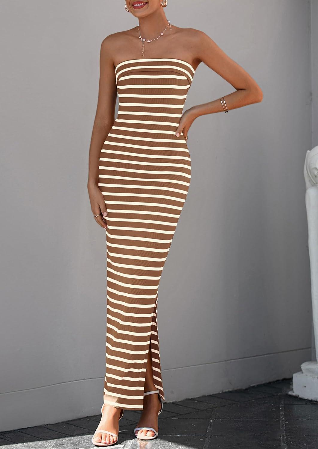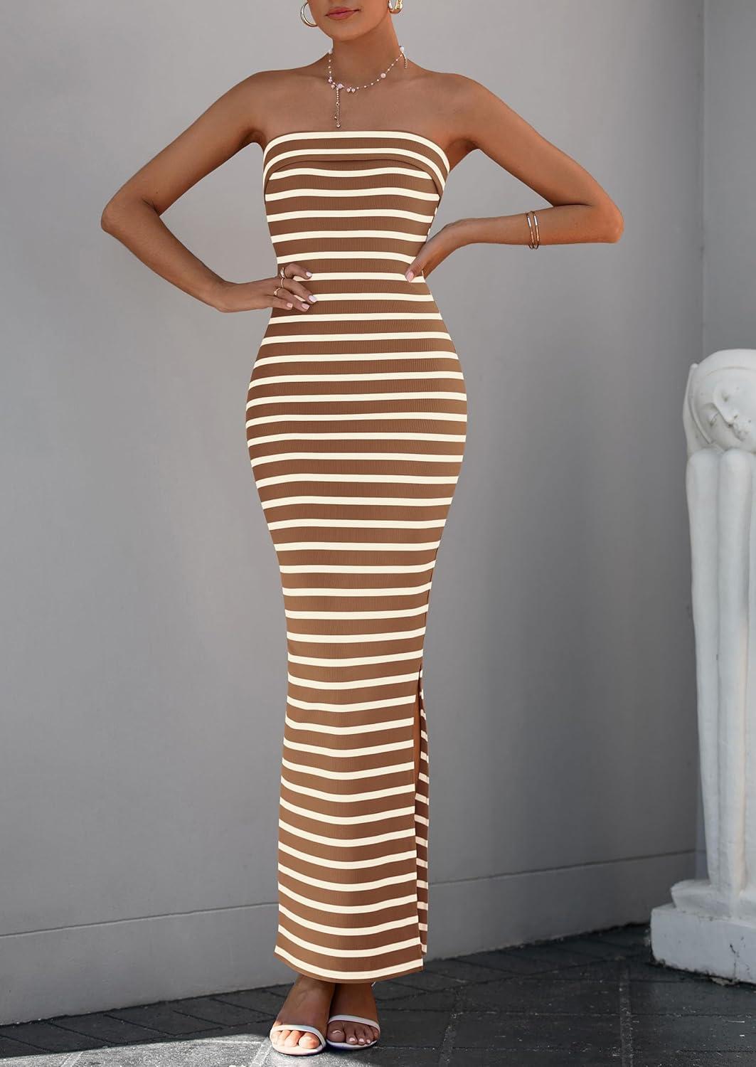 PRETTYGARDEN Women's Summer Bodycon Maxi Tube Dress Ribbed Strapless Side Slit Long Going Out Casual Elegant Party Dresses(Wide Striped Brown White)