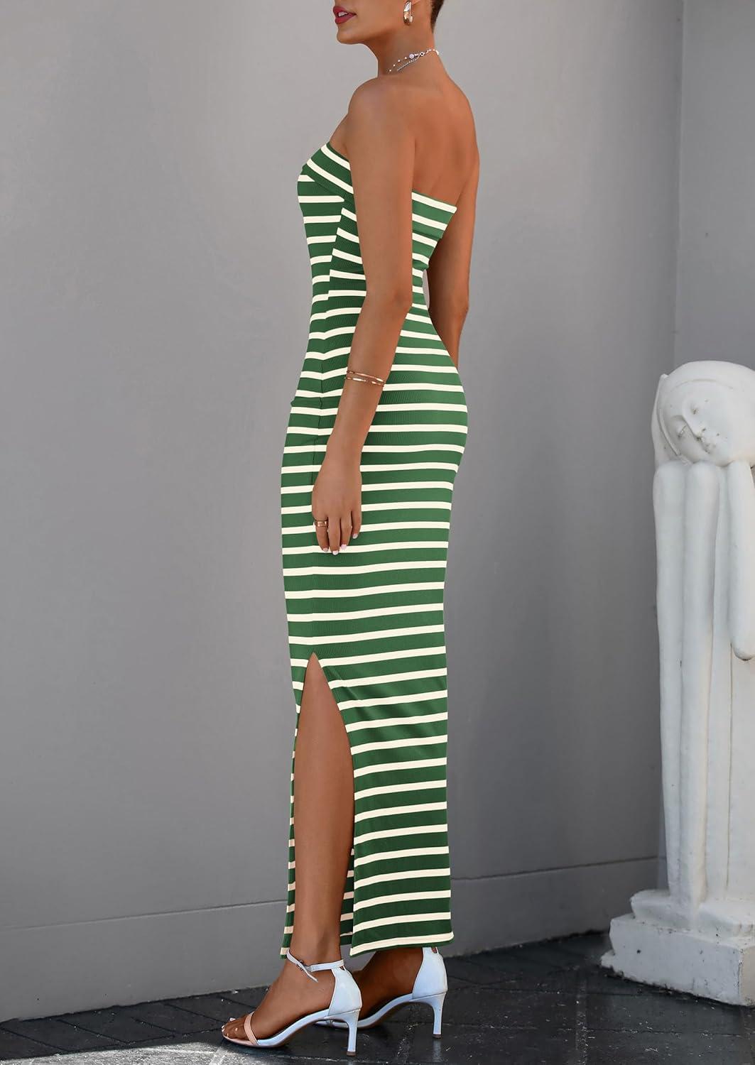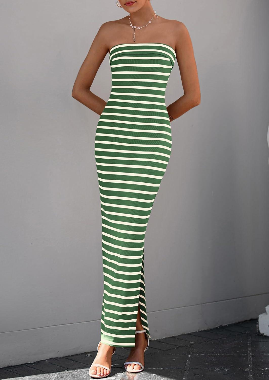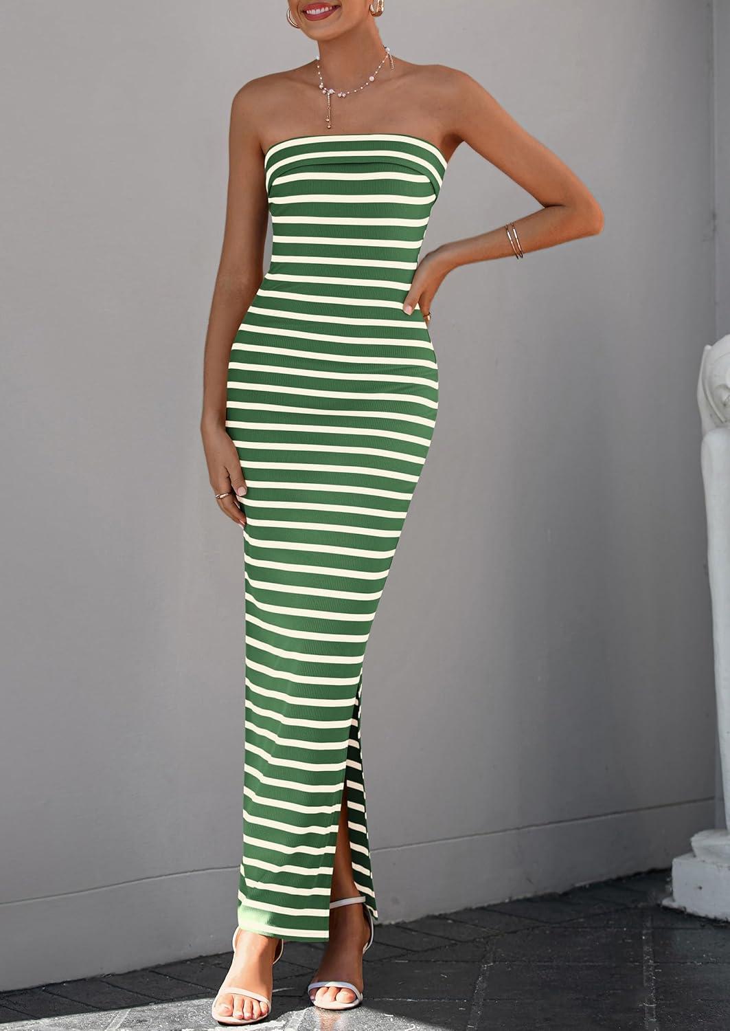 PRETTYGARDEN Women's Summer Bodycon Maxi Tube Dress Ribbed Strapless Side Slit Long Going Out Casual Elegant Party Dresses(Wide Striped Green White)