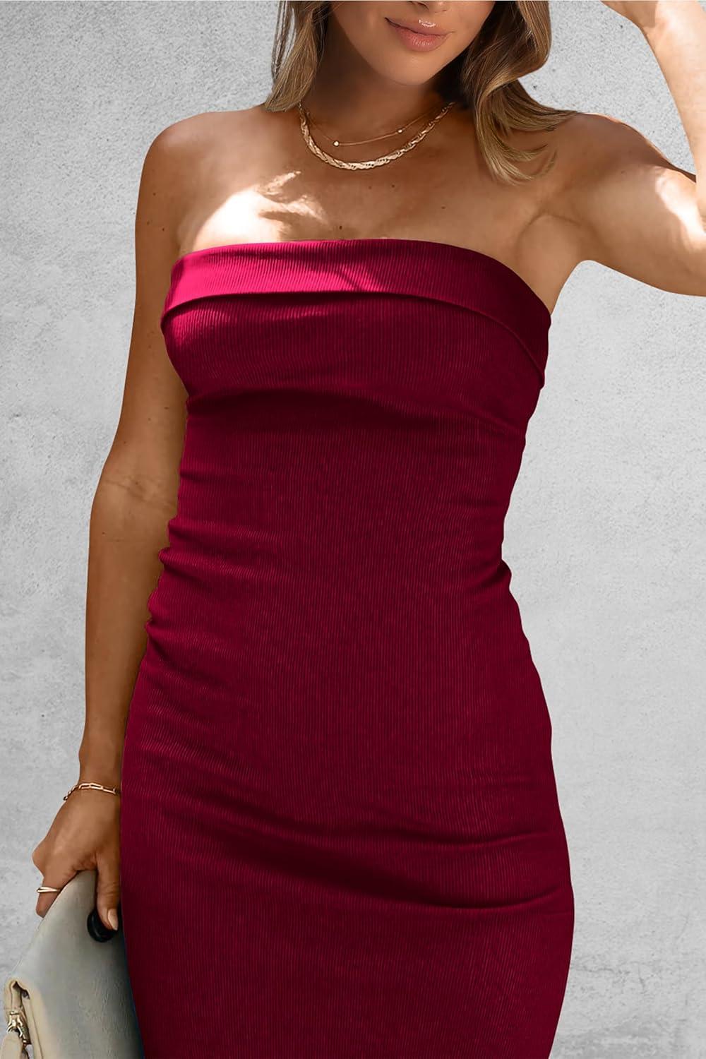 PRETTYGARDEN Women's Summer Bodycon Maxi Tube Dress Ribbed Strapless Side Slit Long Going Out Casual Elegant Party Dresses(Wine Red)