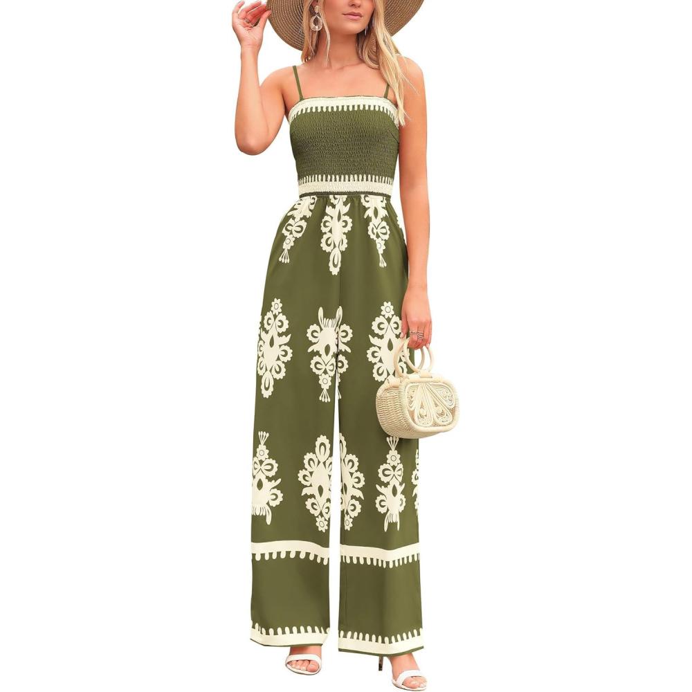 PRETTYGARDEN Women’s Summer Boho Jumpsuits One Piece Beach Vacation Outfits Spaghetti Strap Wide Leg Pants Rompers(Army Green)