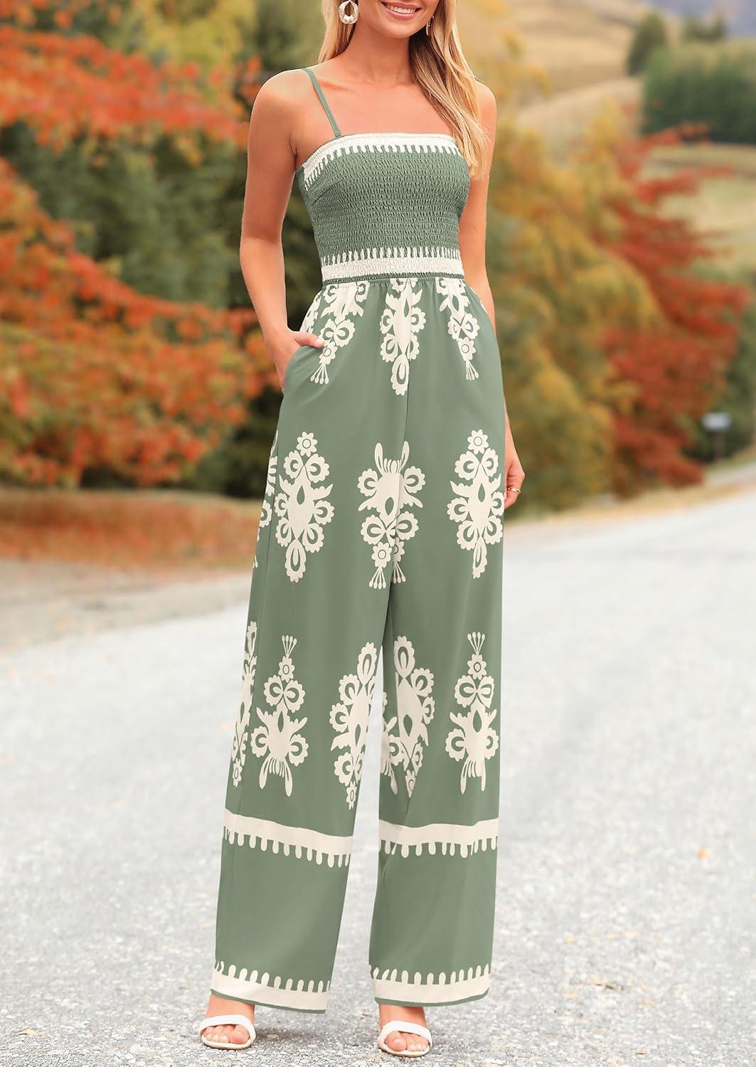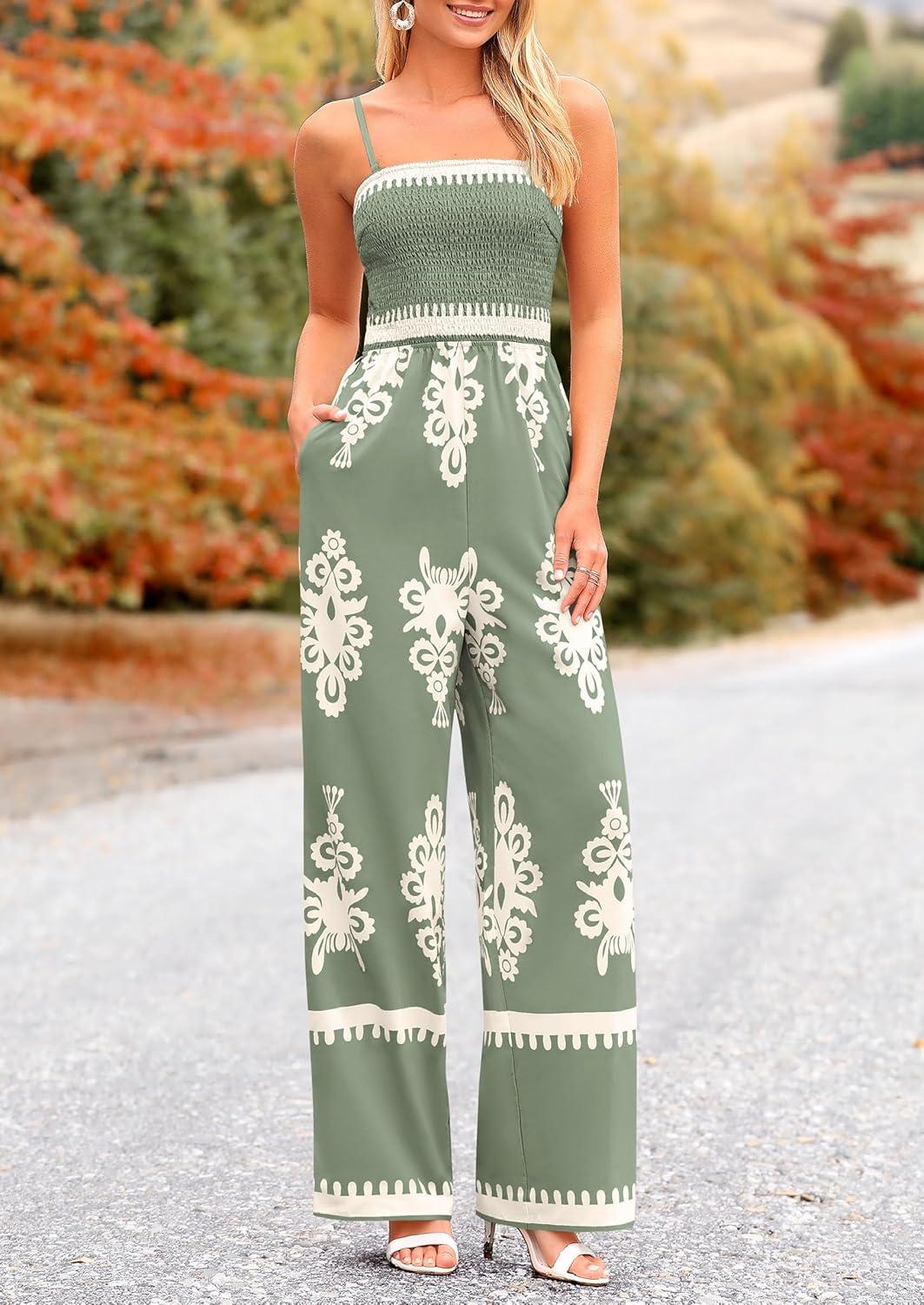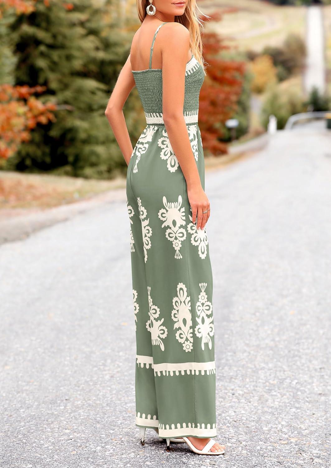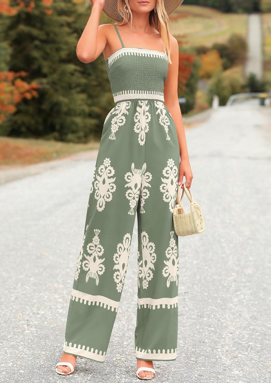 PRETTYGARDEN Women's Summer Boho Jumpsuits One Piece Beach Vacation Outfits Spaghetti Strap Wide Leg Pants Rompers(Grey Green Apricot Floral)