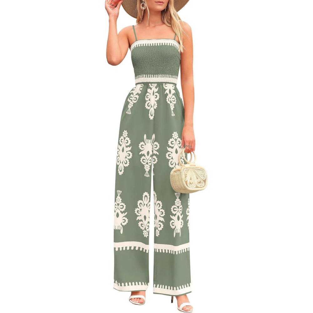 PRETTYGARDEN Women’s Summer Boho Jumpsuits One Piece Beach Vacation Outfits Spaghetti Strap Wide Leg Pants Rompers(Grey Green Apricot Floral)