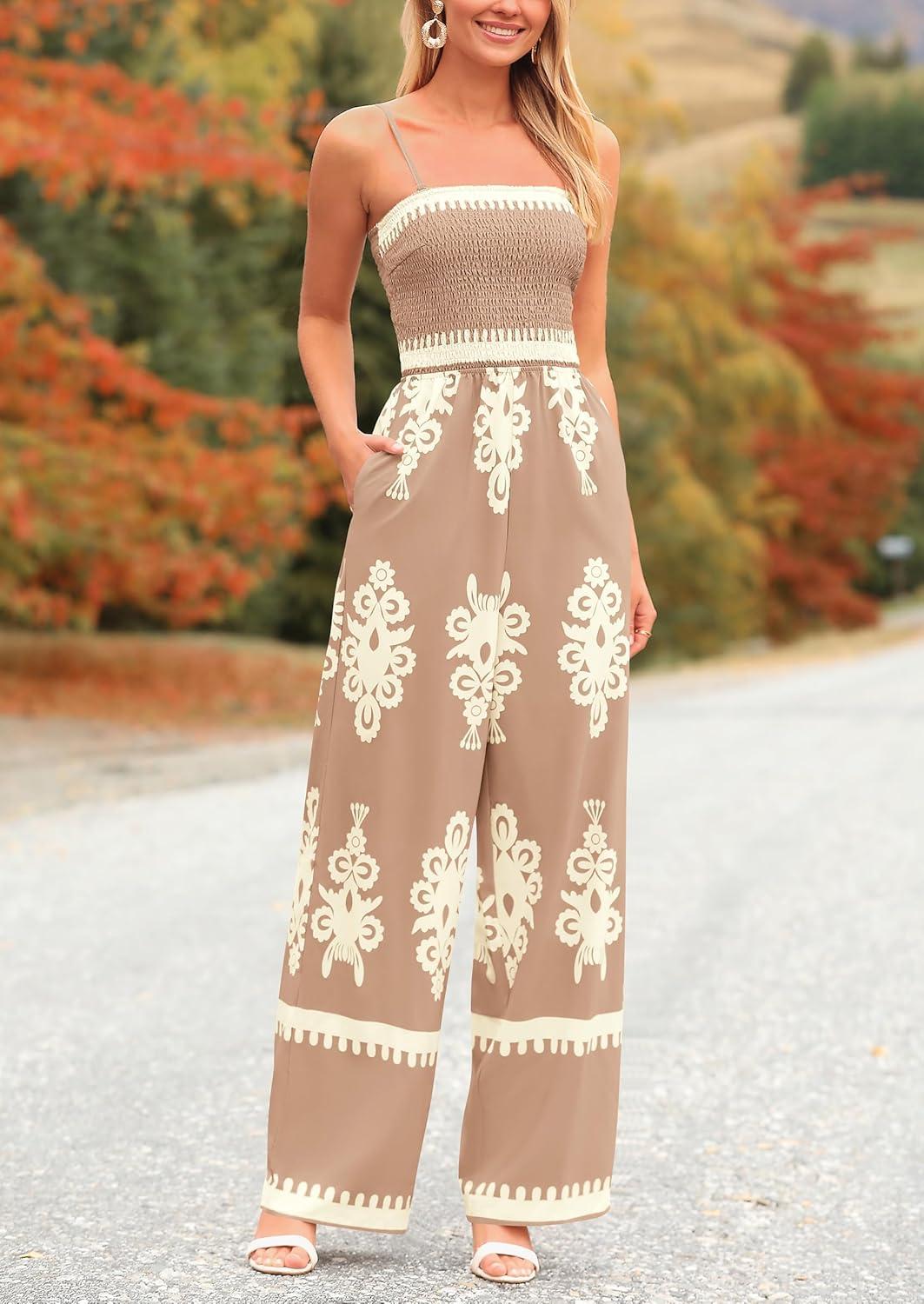 PRETTYGARDEN Women’s Summer Boho Jumpsuits One Piece Beach Vacation Outfits Spaghetti Strap Wide Leg Pants Rompers(Khaki Black Floral)