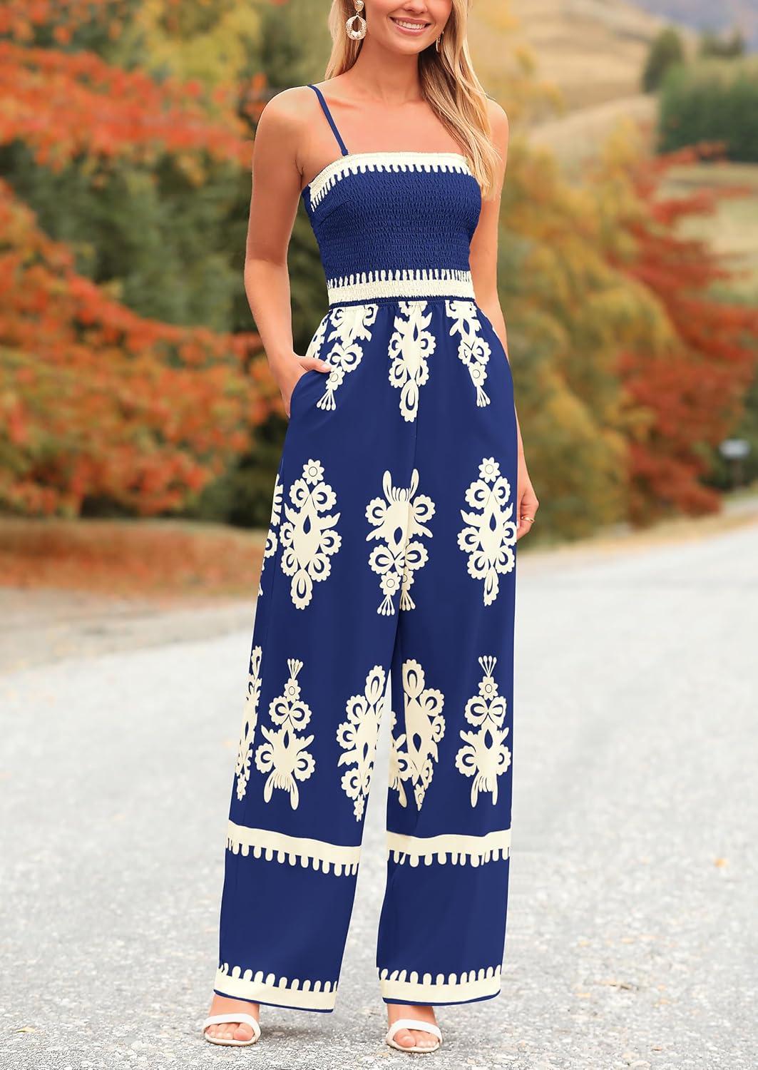 PRETTYGARDEN Women’s Summer Boho Jumpsuits One Piece Beach Vacation Outfits Spaghetti Strap Wide Leg Pants Rompers(Navy)