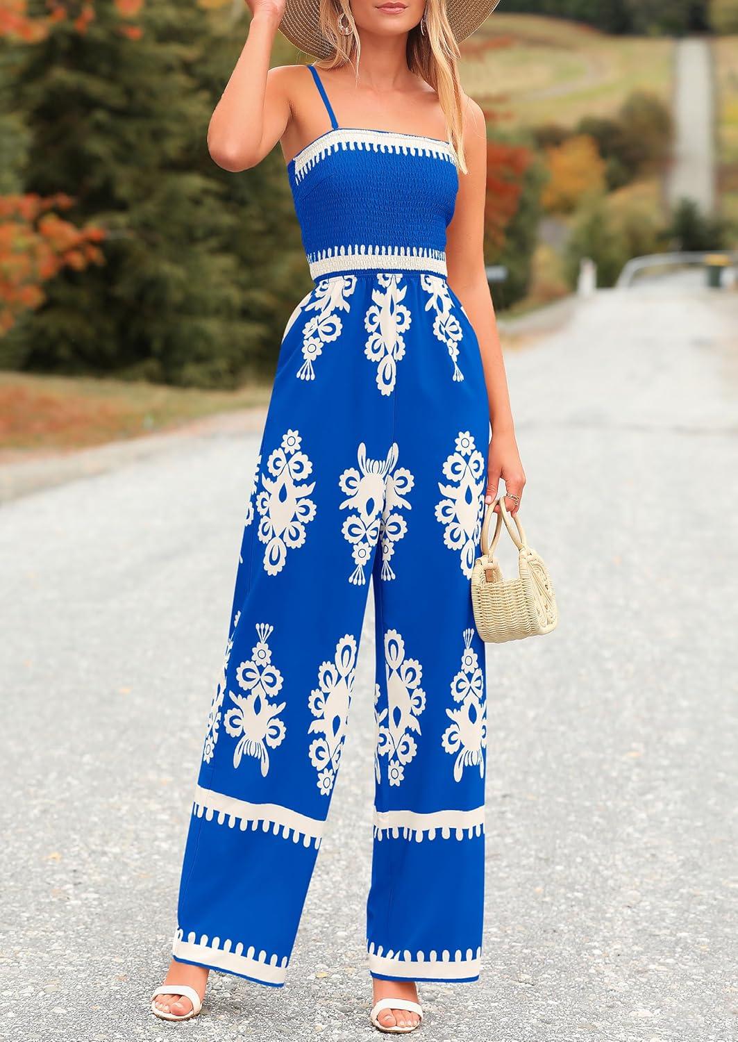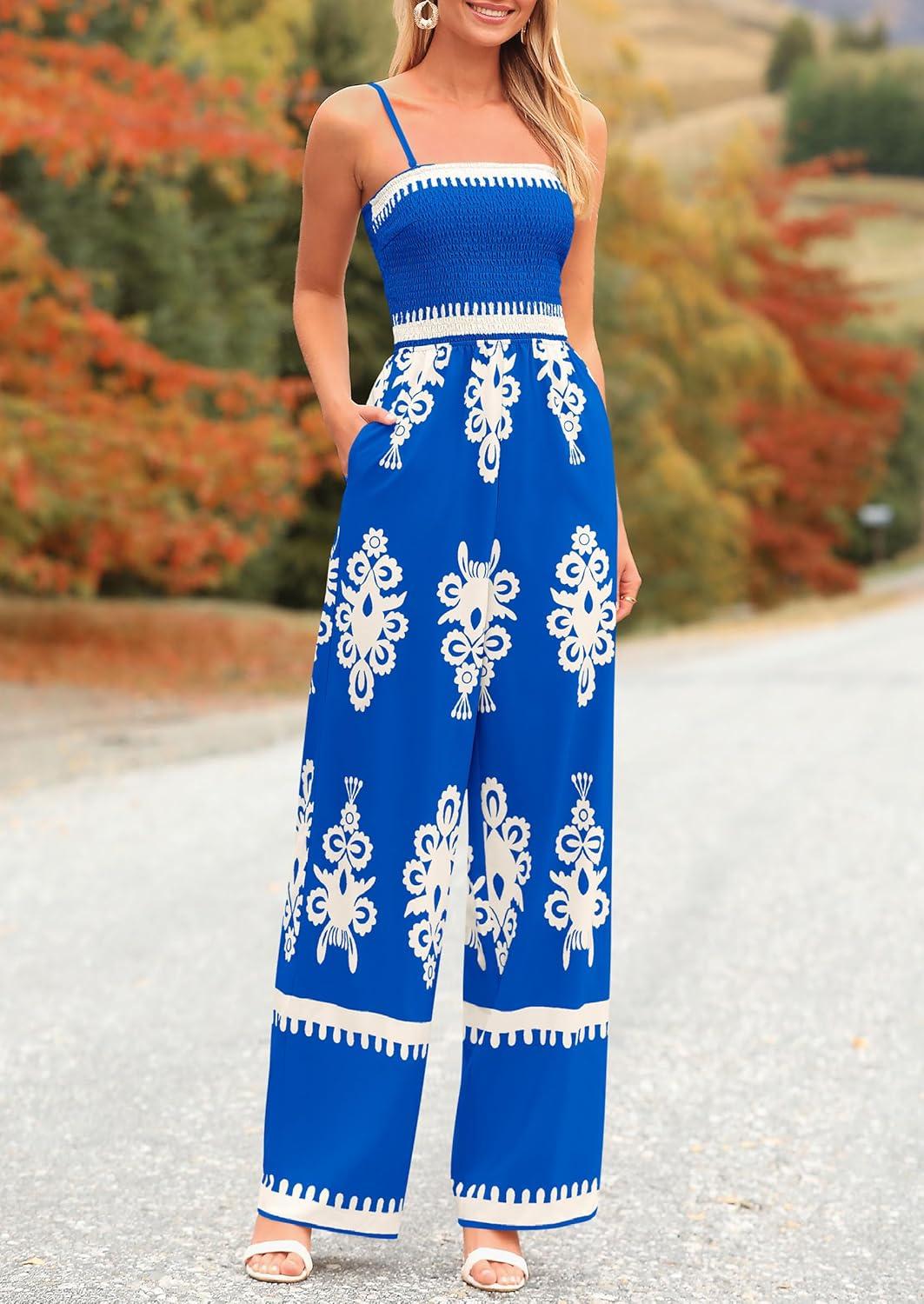 PRETTYGARDEN Women’s Summer Boho Jumpsuits One Piece Beach Vacation Outfits Spaghetti Strap Wide Leg Pants Rompers(Royal Blue White Floral)