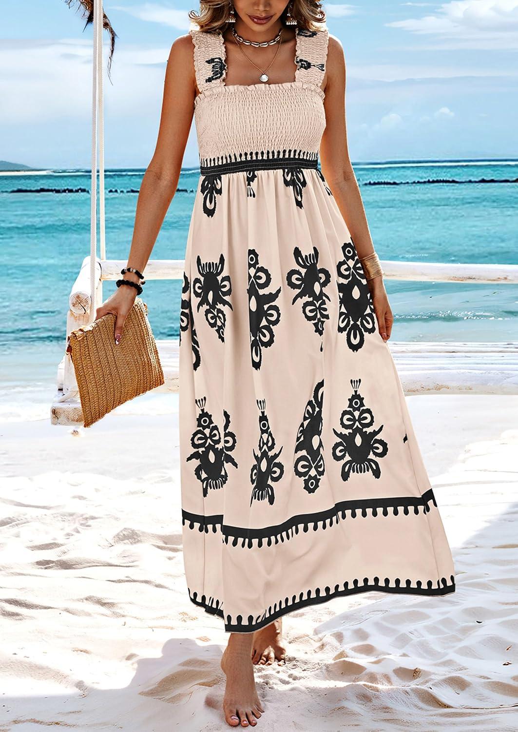 PRETTYGARDEN Womens Summer Boho Maxi Dress 2025 Casual Sleeveless Square Neck Floral Aline Smocked Beach Dresses with Pockets(Floral Apricot Black)