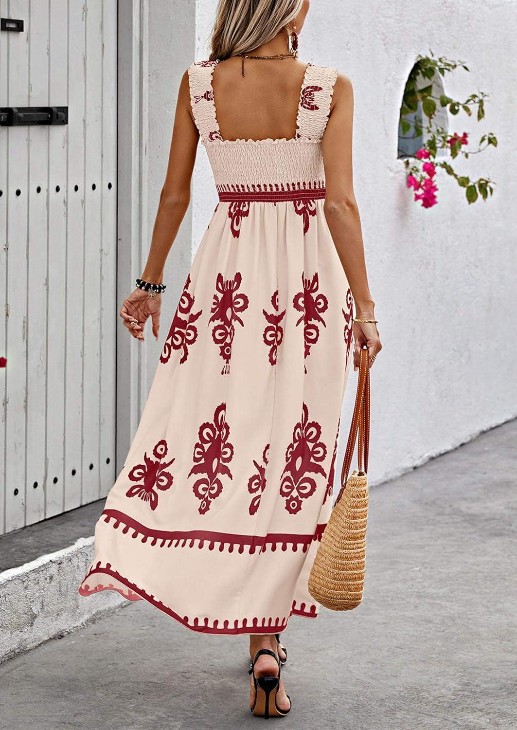 PRETTYGARDEN Womens Summer Boho Maxi Dress 2025 Casual Sleeveless Square Neck Floral Aline Smocked Beach Dresses with Pockets(Floral Apricot Wine Red)