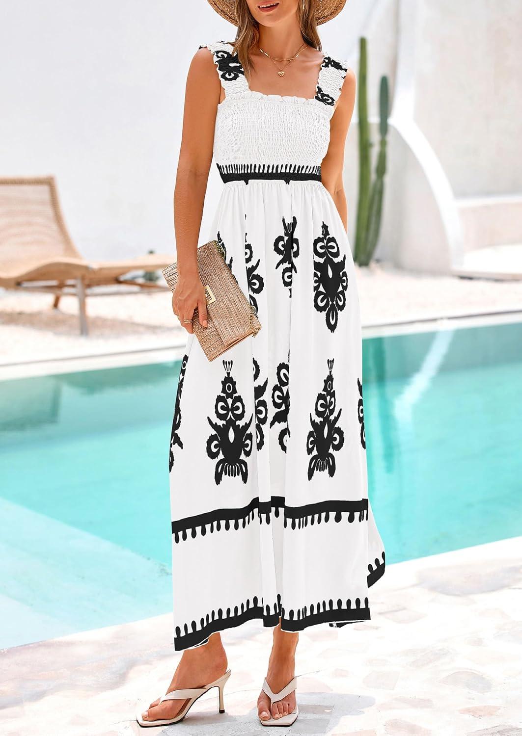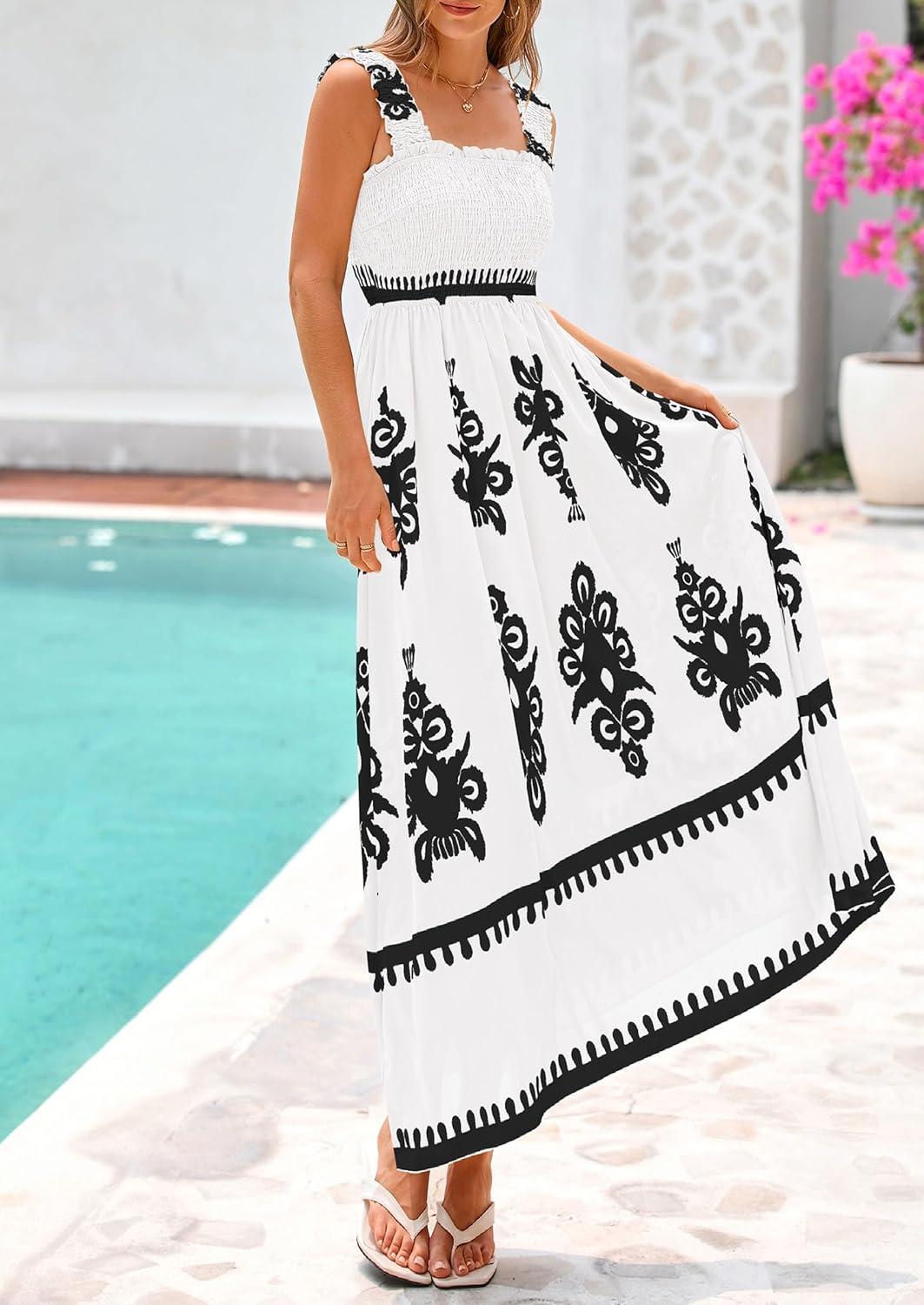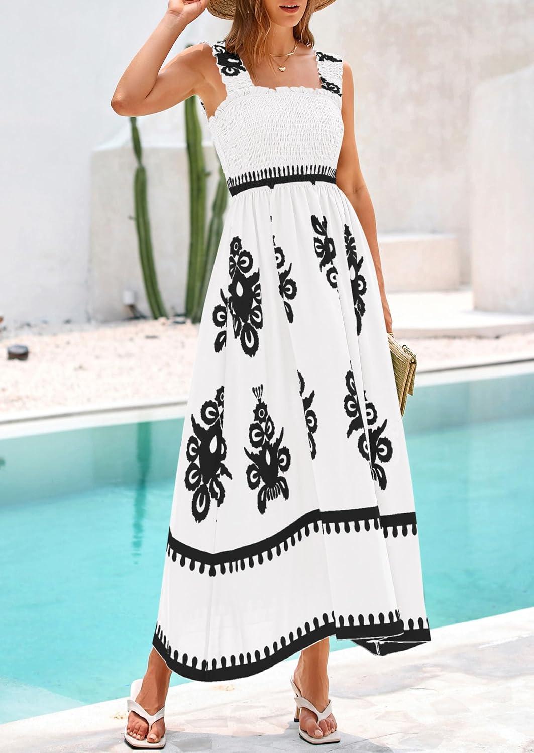 PRETTYGARDEN Womens Summer Boho Maxi Dress 2025 Casual Sleeveless Square Neck Floral Aline Smocked Beach Dresses with Pockets(Floral White Black)