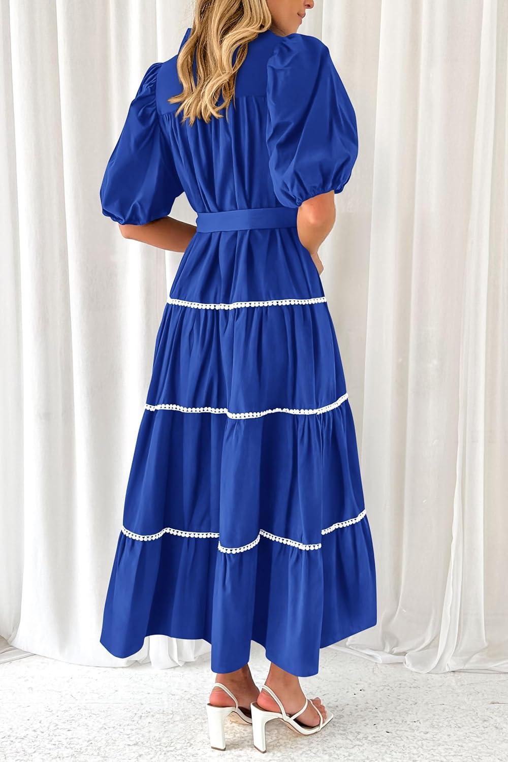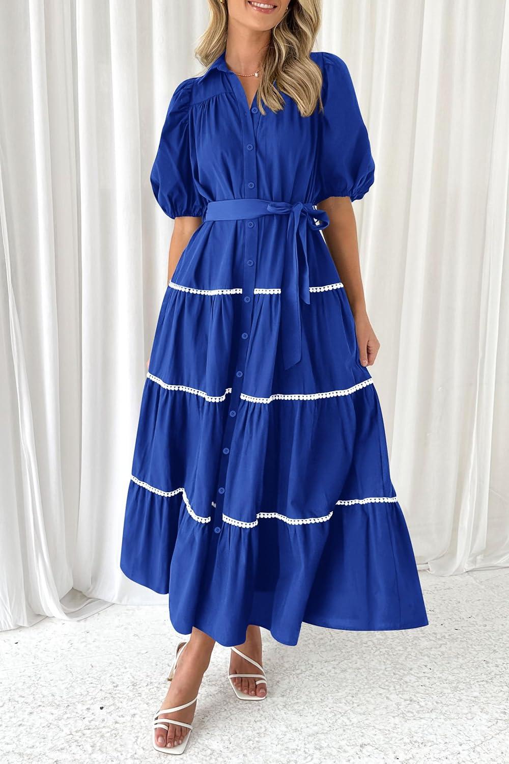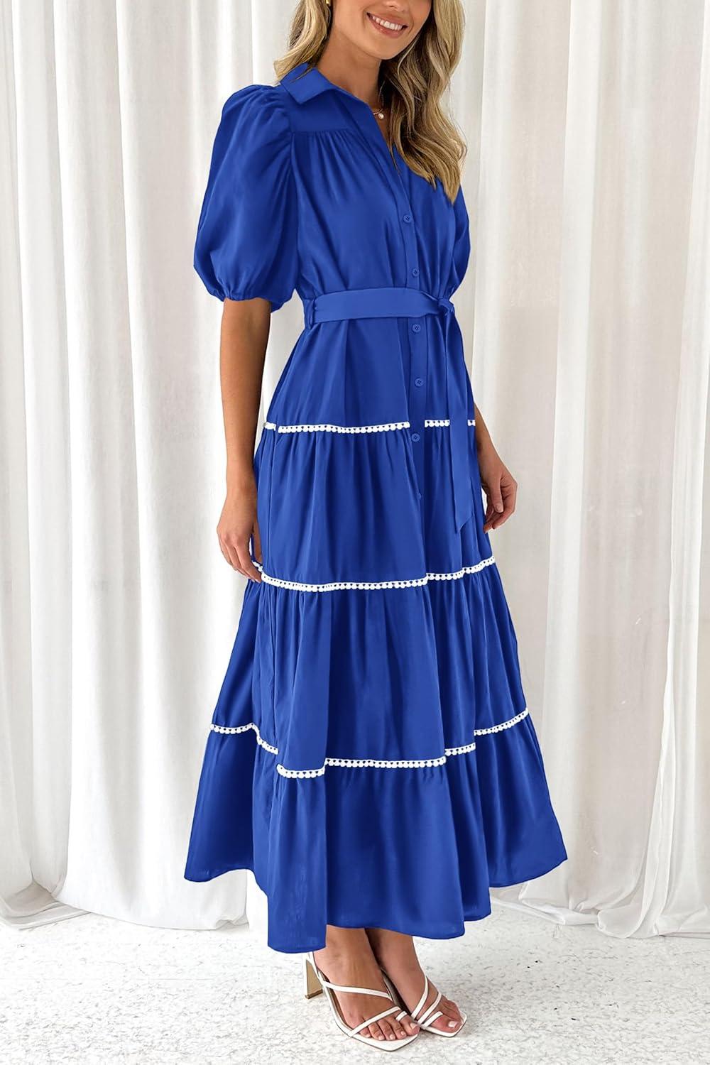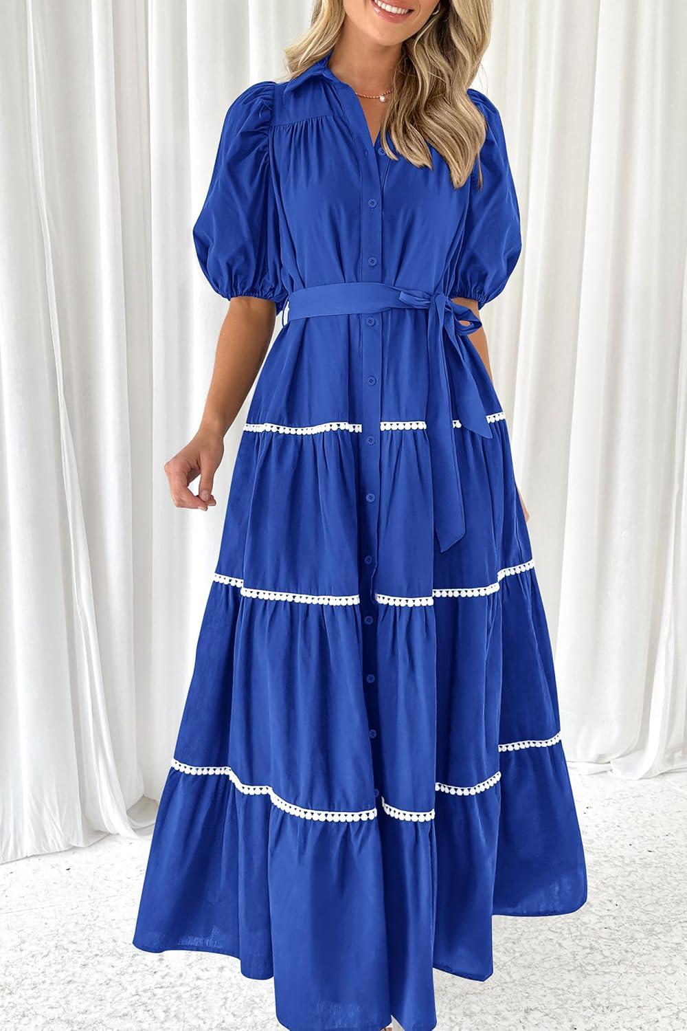 PRETTYGARDEN Women’s Summer Button Down Shirt Dress Short Puffy Sleeve Tiered Ruffle Flowy Long Maxi Dresses(Blue)