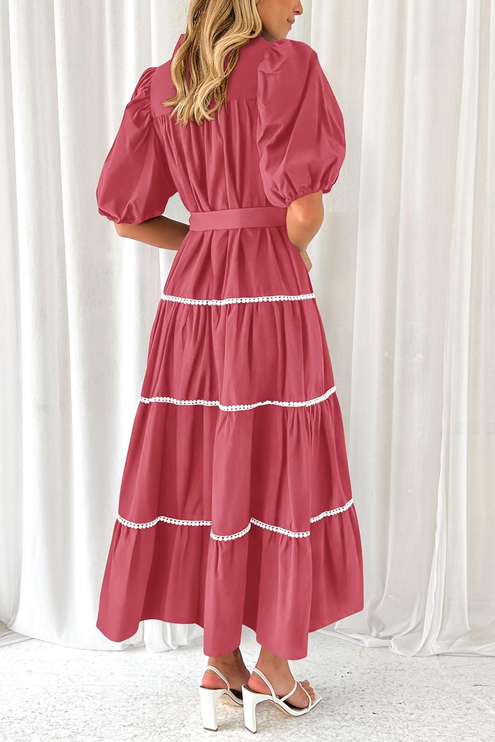 PRETTYGARDEN Women’s Summer Button Down Shirt Dress Short Puffy Sleeve Tiered Ruffle Flowy Long Maxi Dresses(Dusty Pink)
