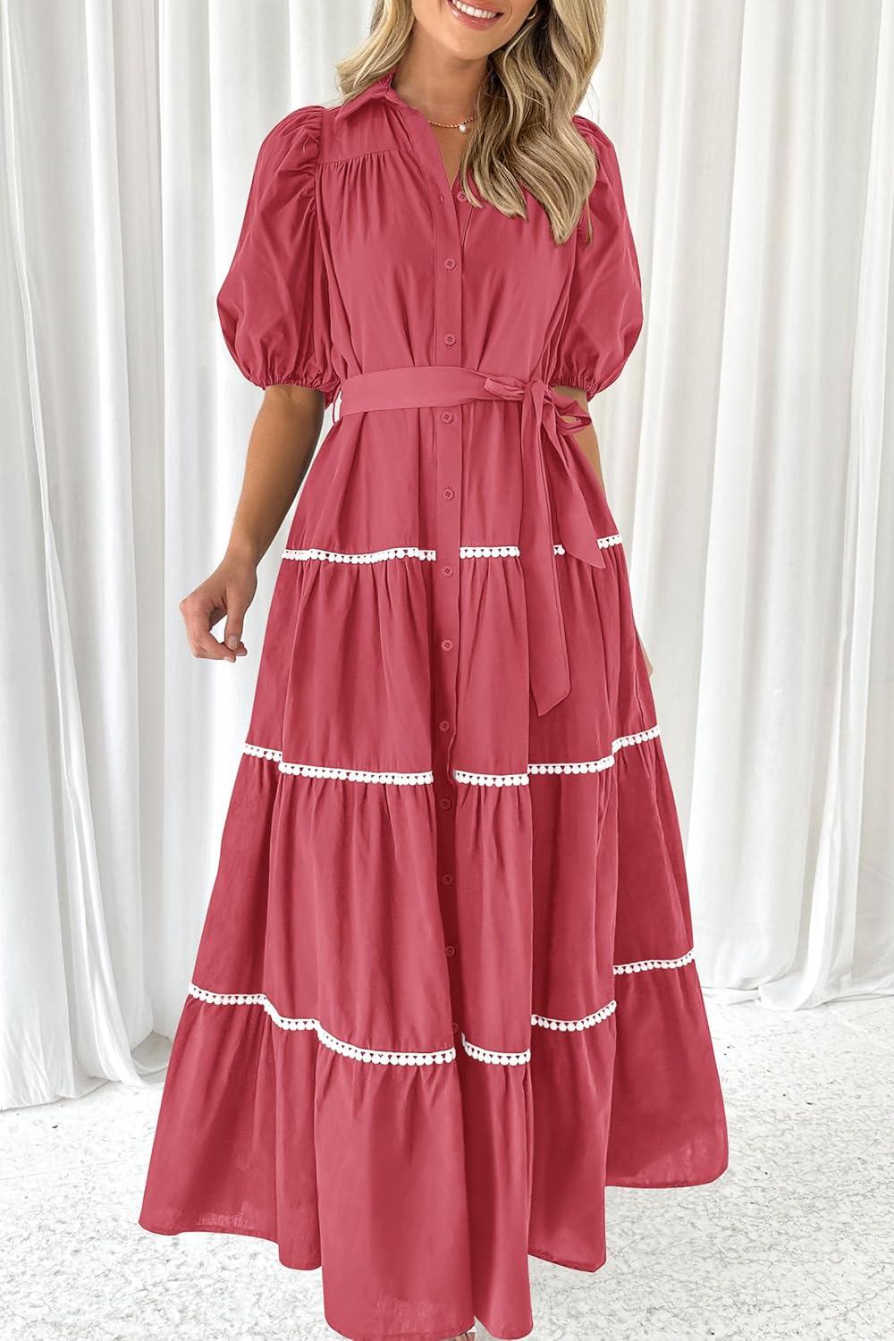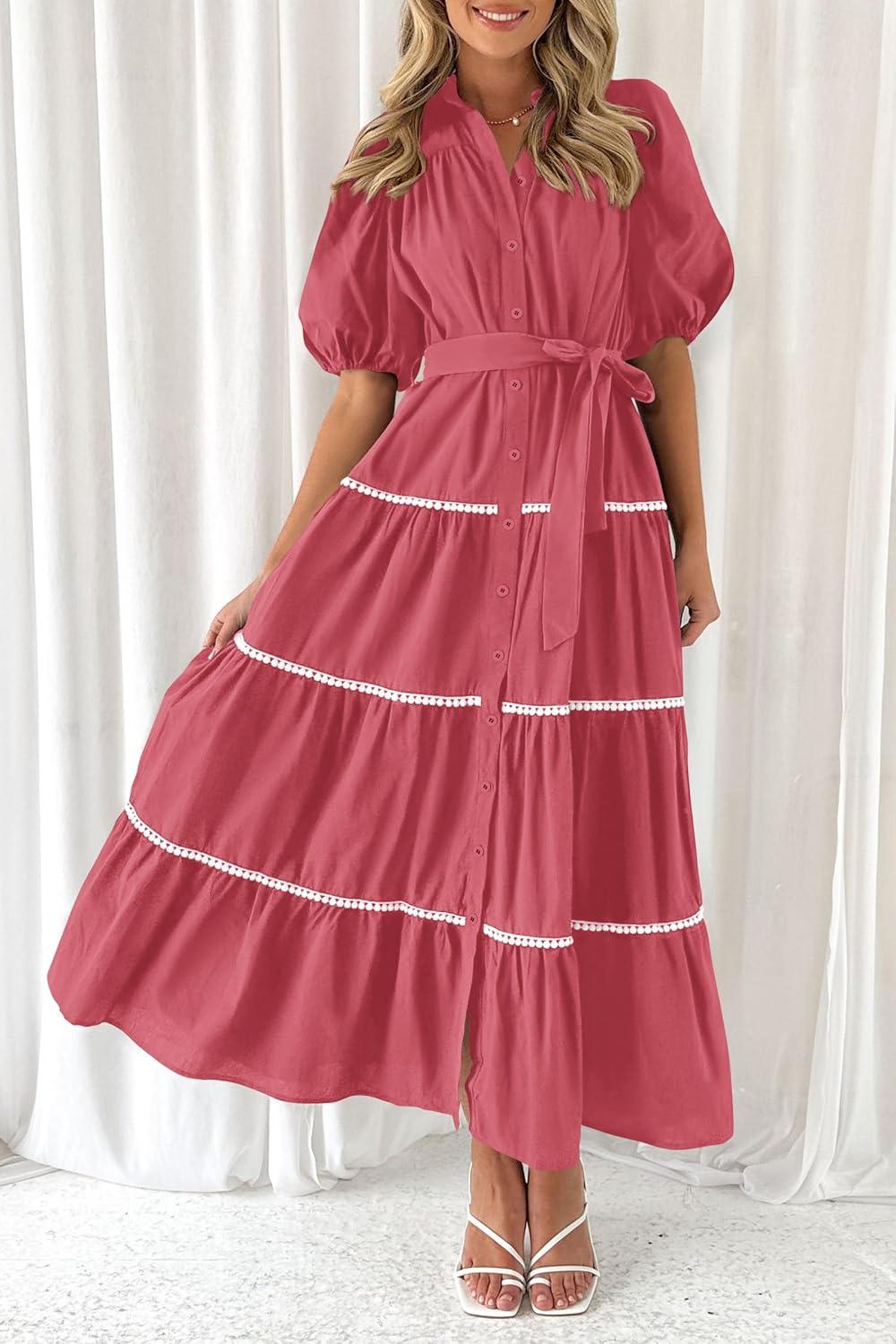 PRETTYGARDEN Women's Summer Button Down Shirt Dress Short Puffy Sleeve Tiered Ruffle Flowy Long Maxi Dresses(Dusty Pink)