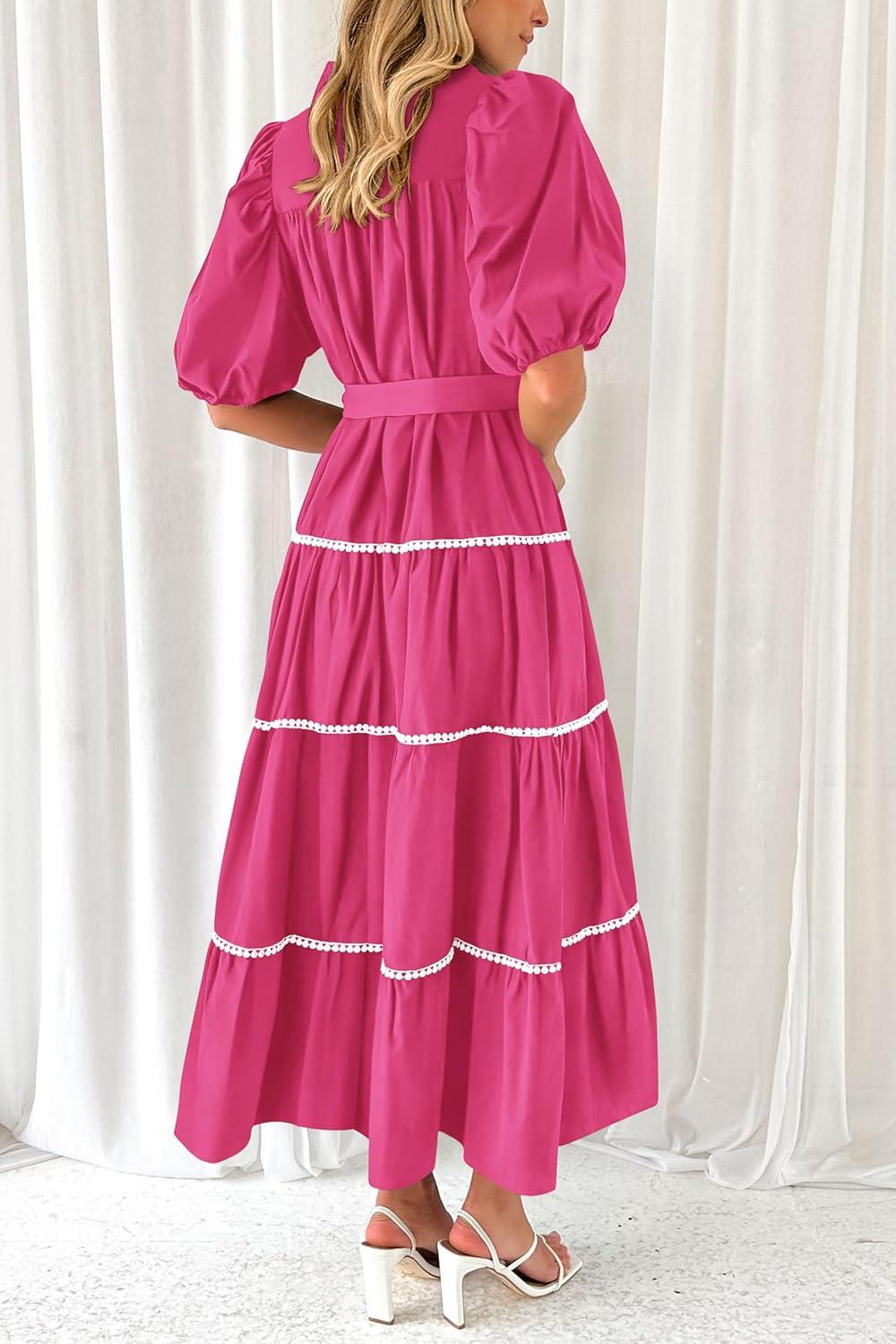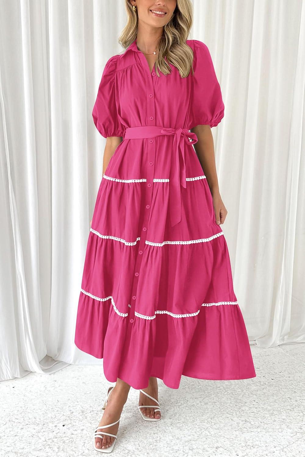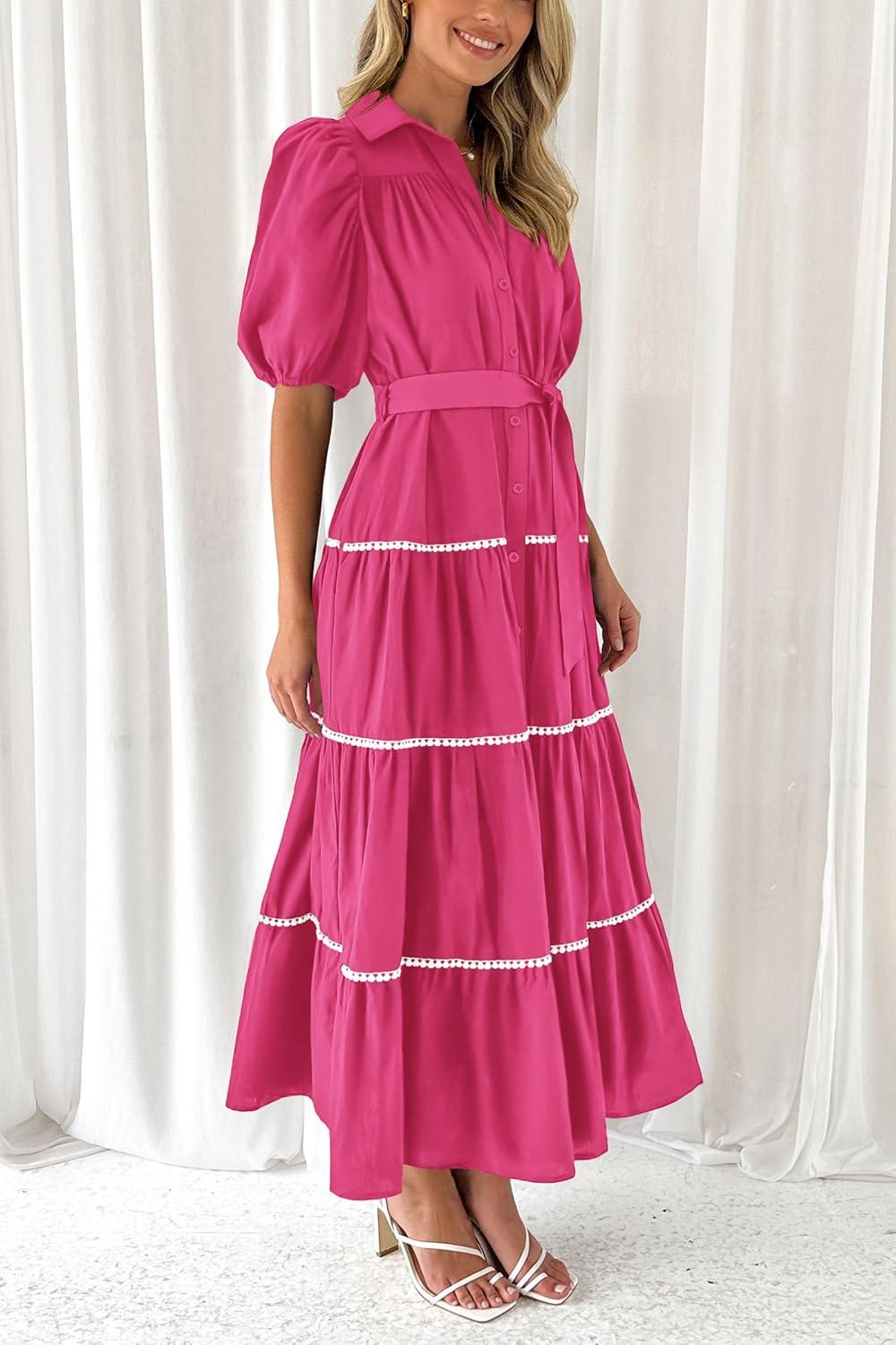 PRETTYGARDEN Women's Summer Button Down Shirt Dress Short Puffy Sleeve Tiered Ruffle Flowy Long Maxi Dresses(Rose Red)