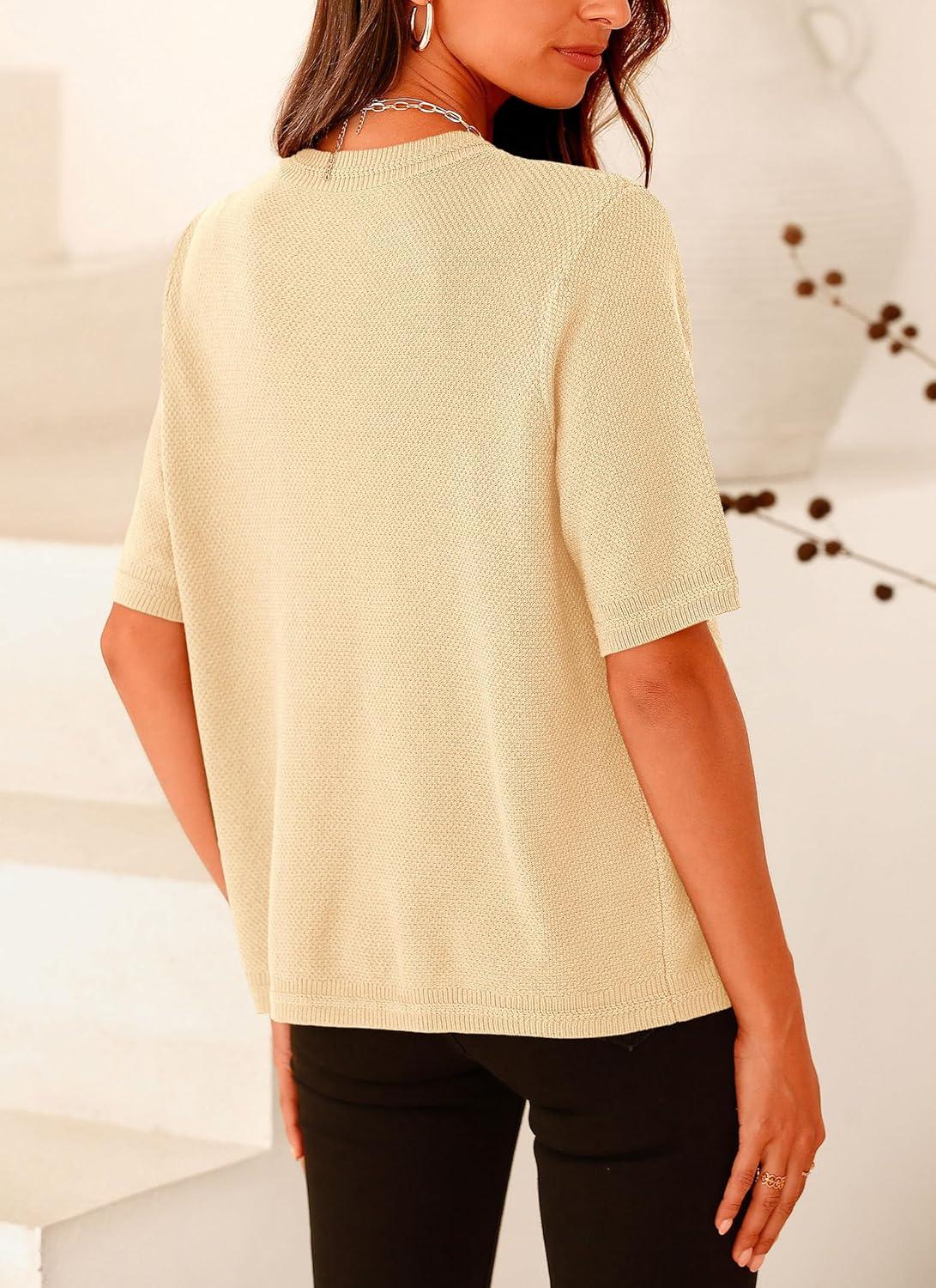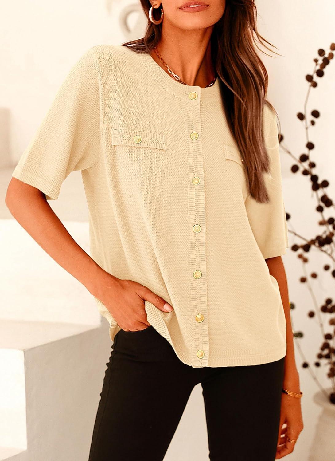 PRETTYGARDEN Women's Summer Button Down Shirts Casual Short Sleeve Crew Neck Ribbed Knit Blouse Top Cardigans(Beige)