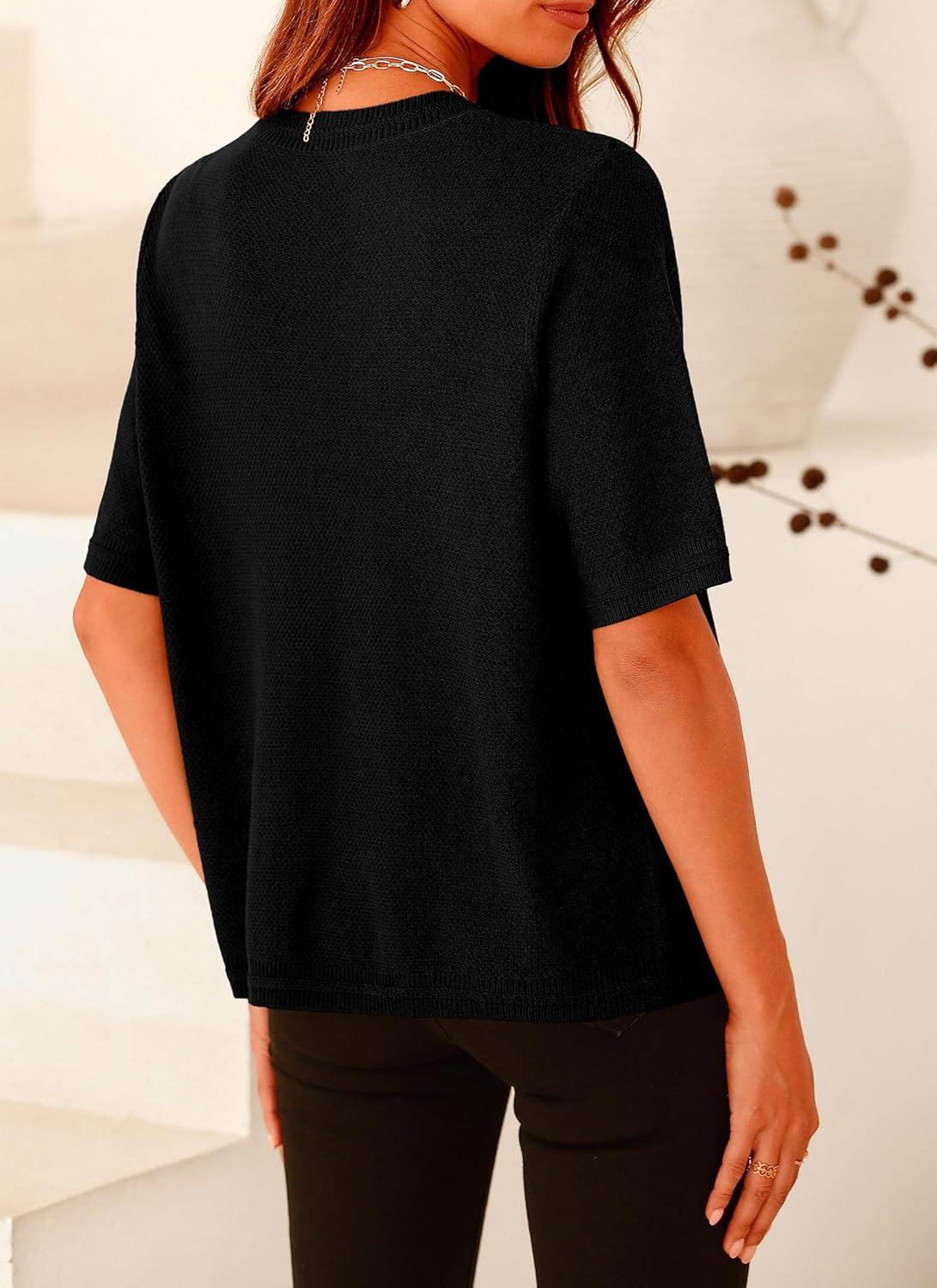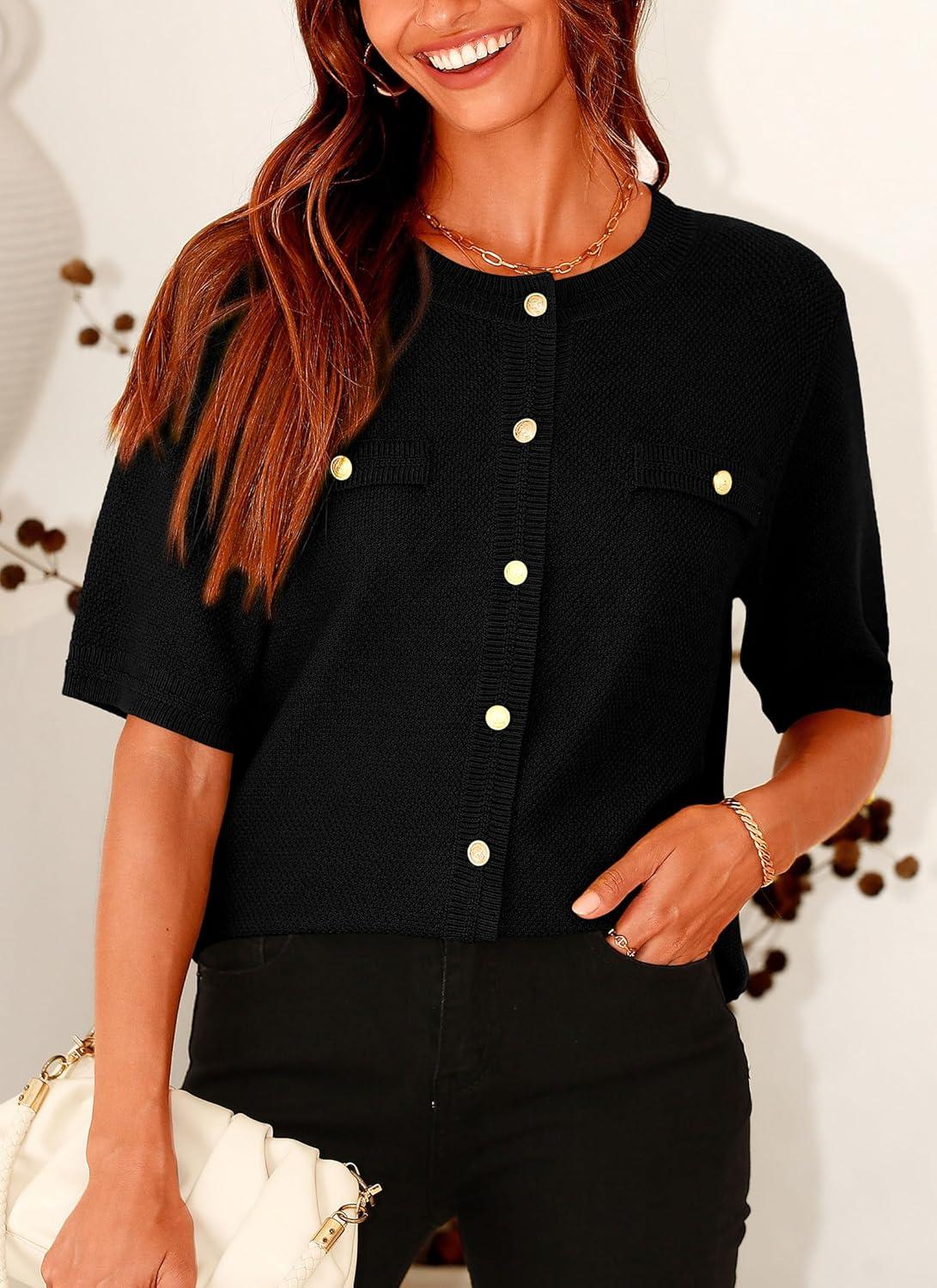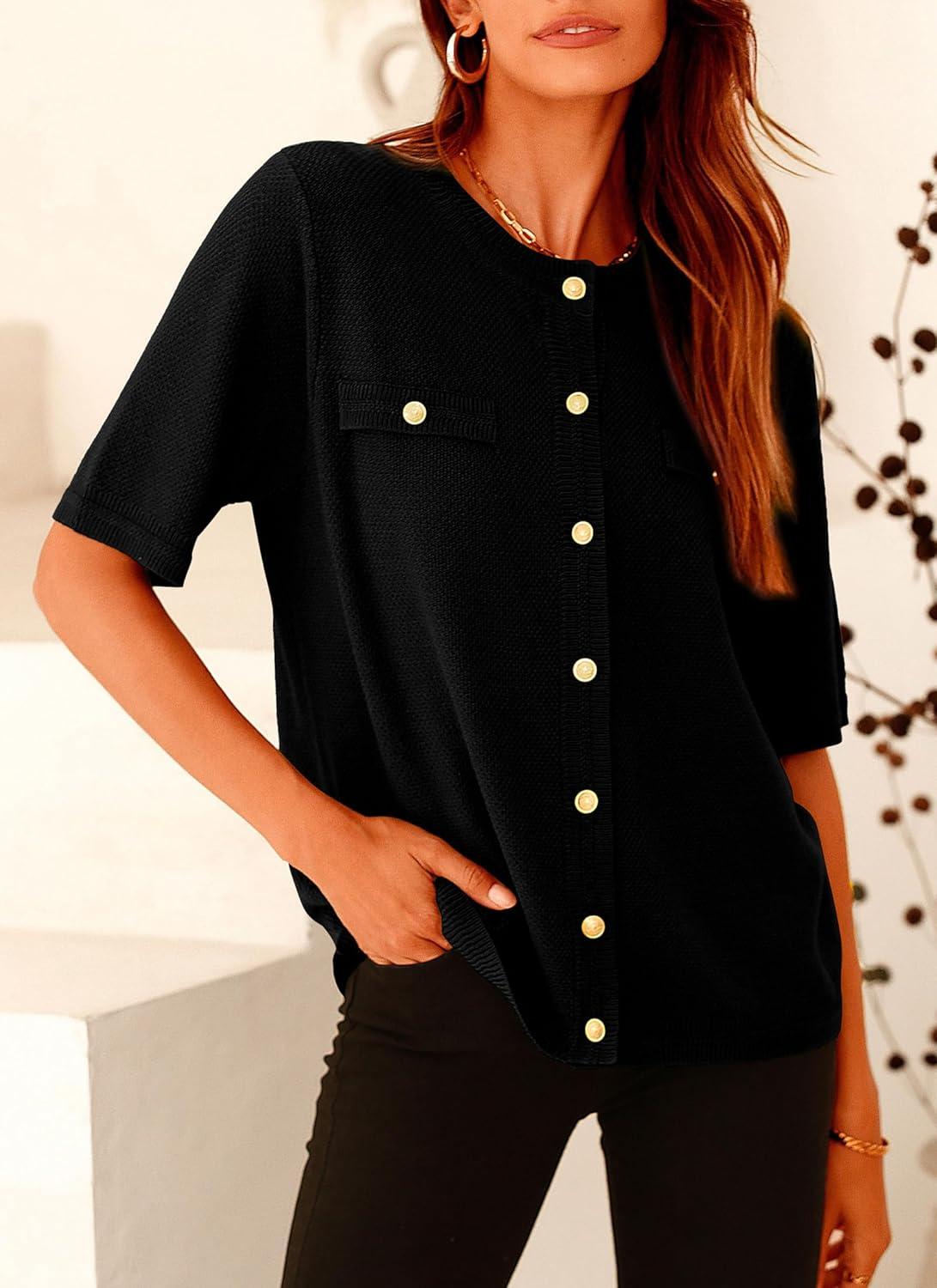 PRETTYGARDEN Women's Summer Button Down Shirts Casual Short Sleeve Crew Neck Ribbed Knit Blouse Top Cardigans(Black)