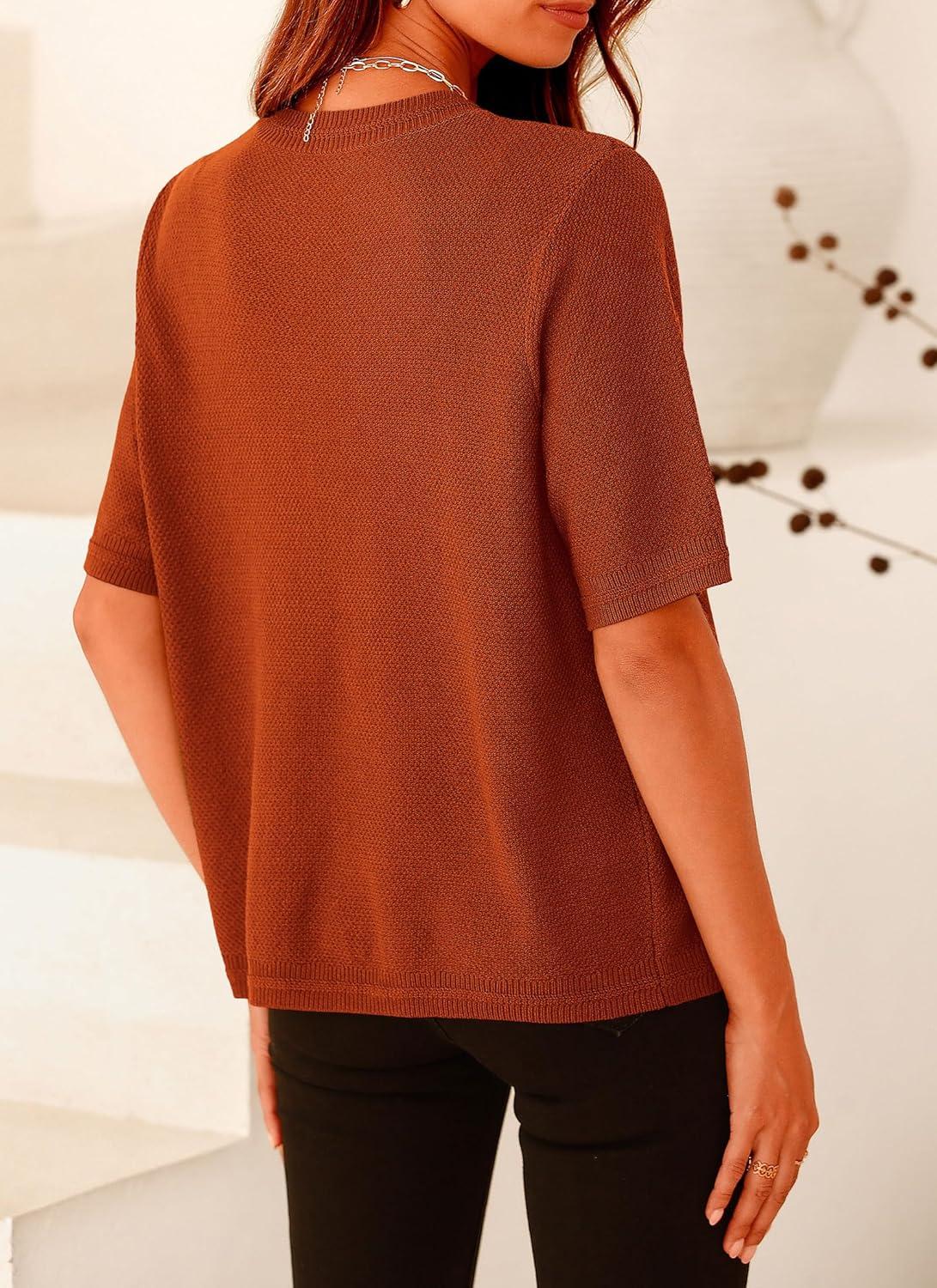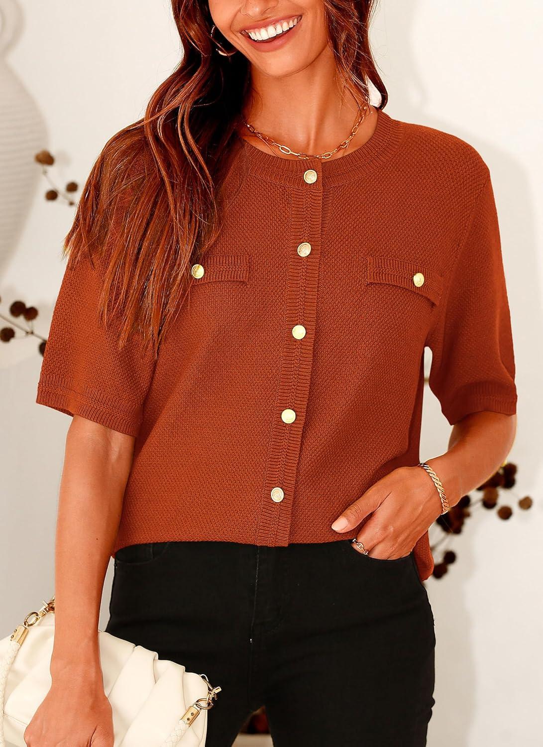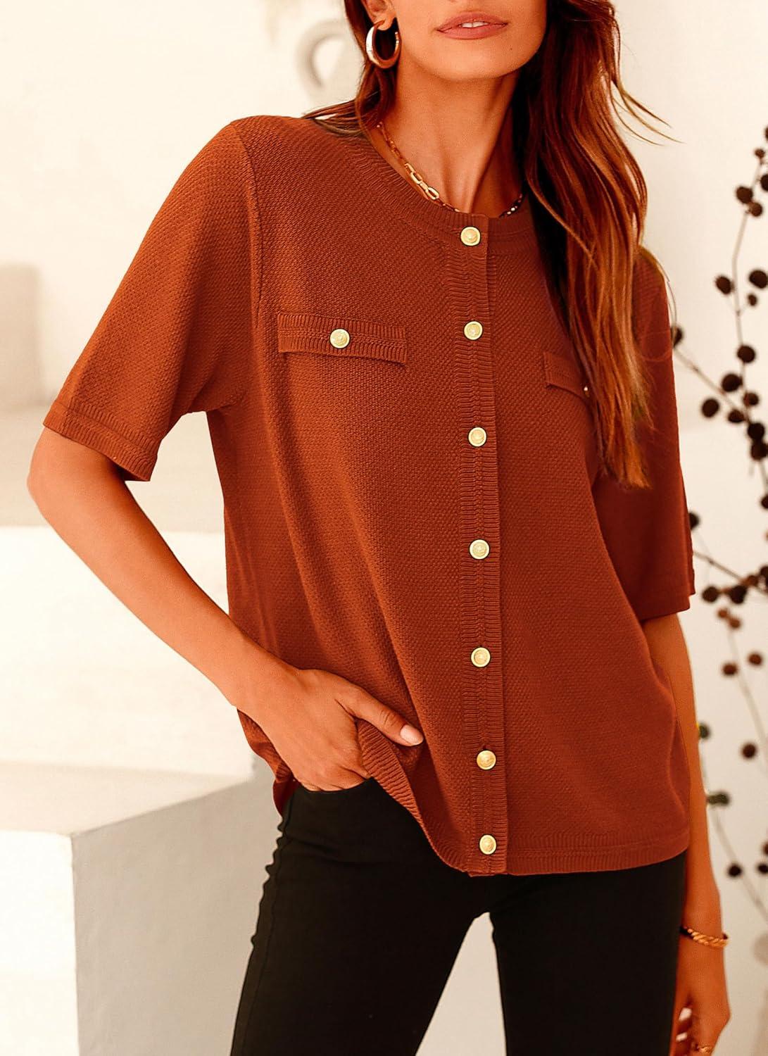 PRETTYGARDEN Women's Summer Button Down Shirts Casual Short Sleeve Crew Neck Ribbed Knit Blouse Top Cardigans(Brick Red)
