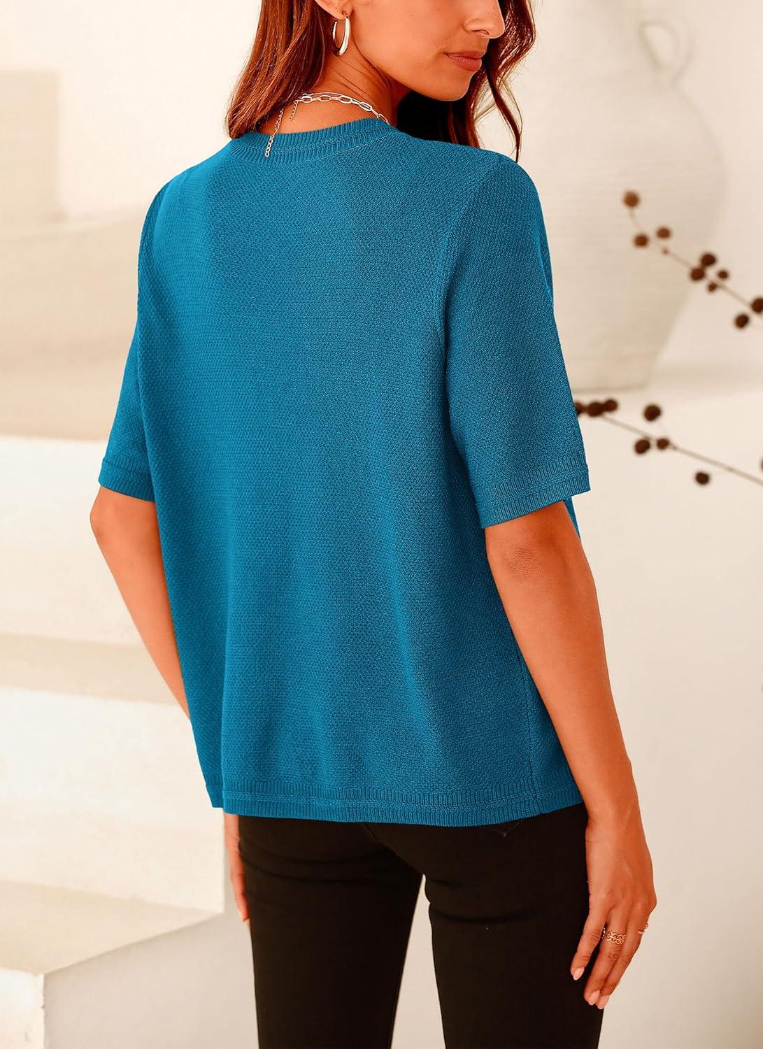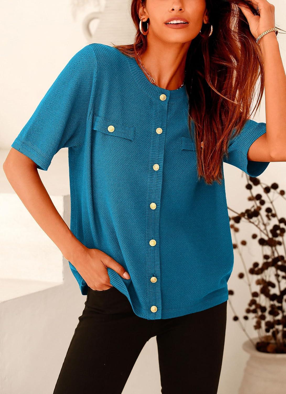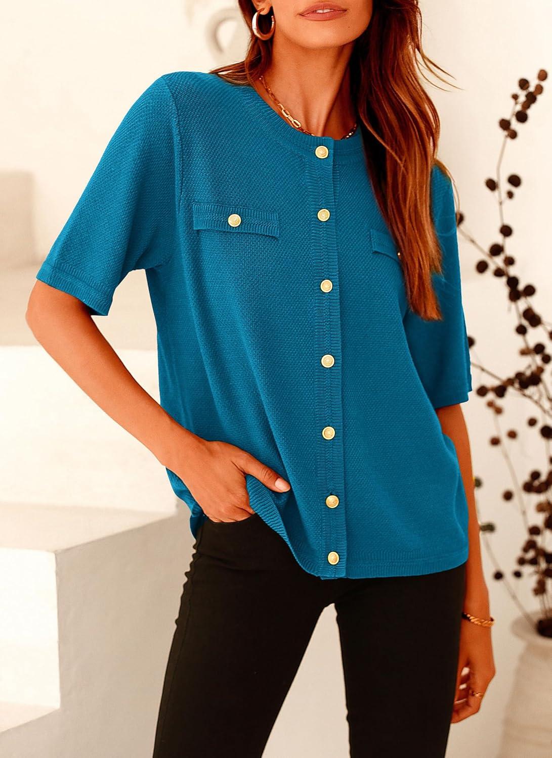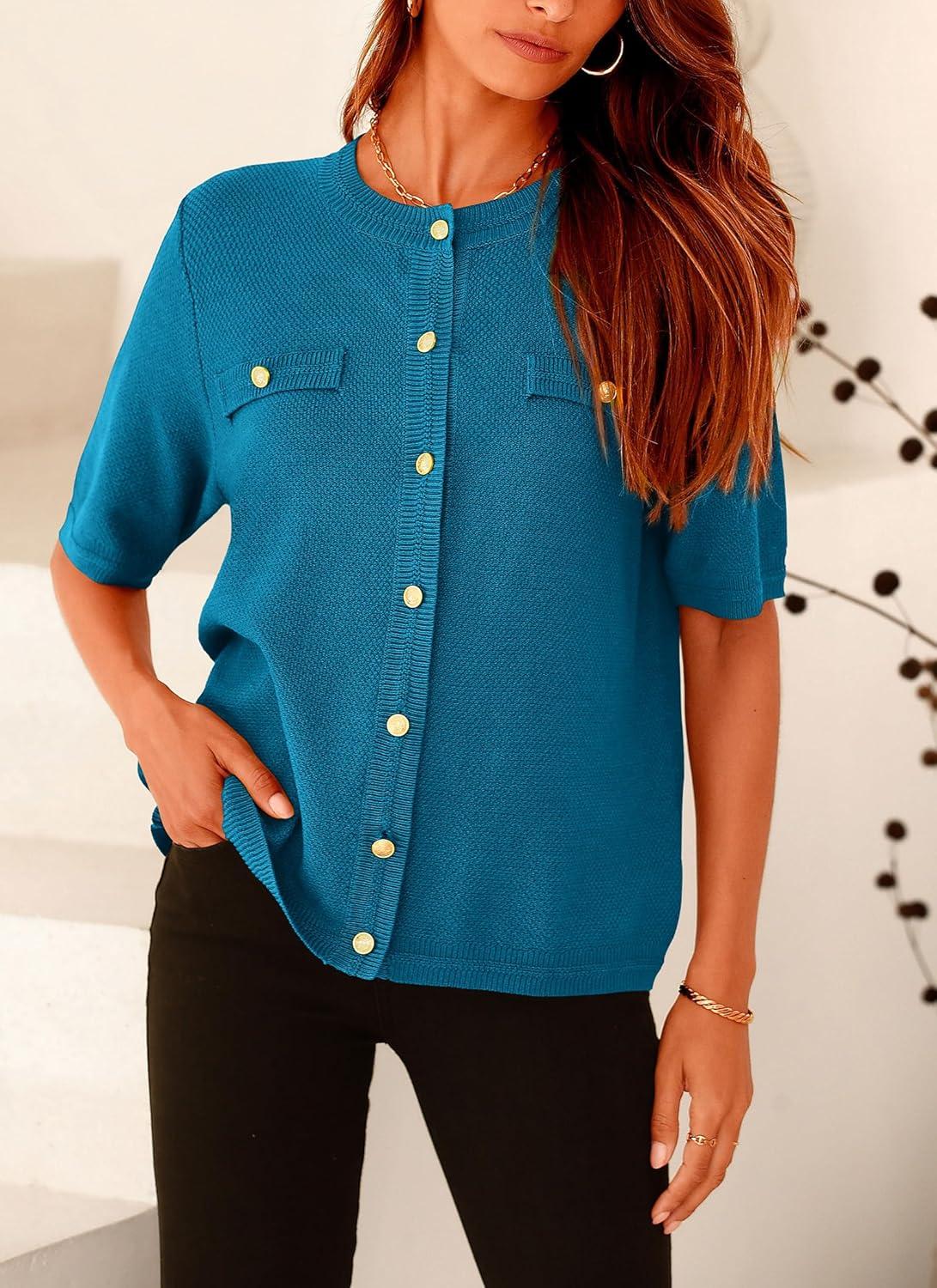 PRETTYGARDEN Women's Summer Button Down Shirts Casual Short Sleeve Crew Neck Ribbed Knit Blouse Top Cardigans(Cyan)