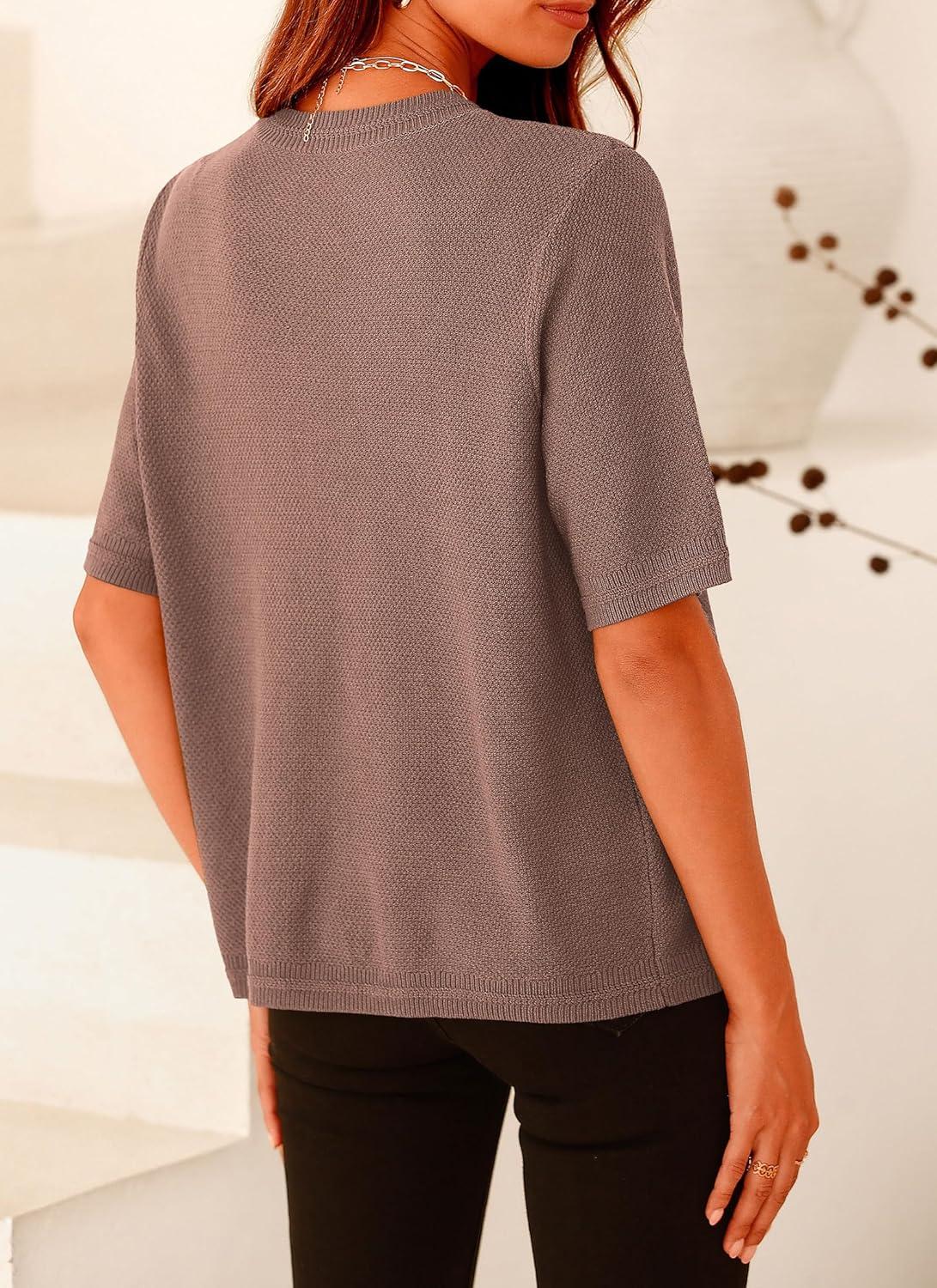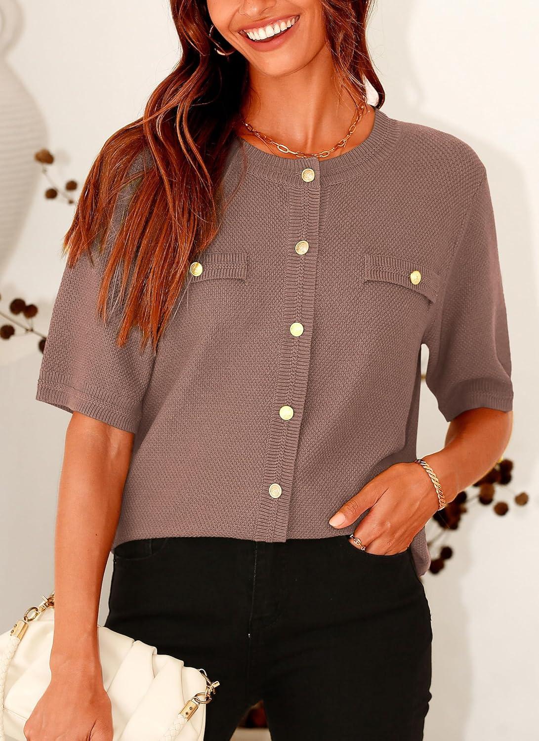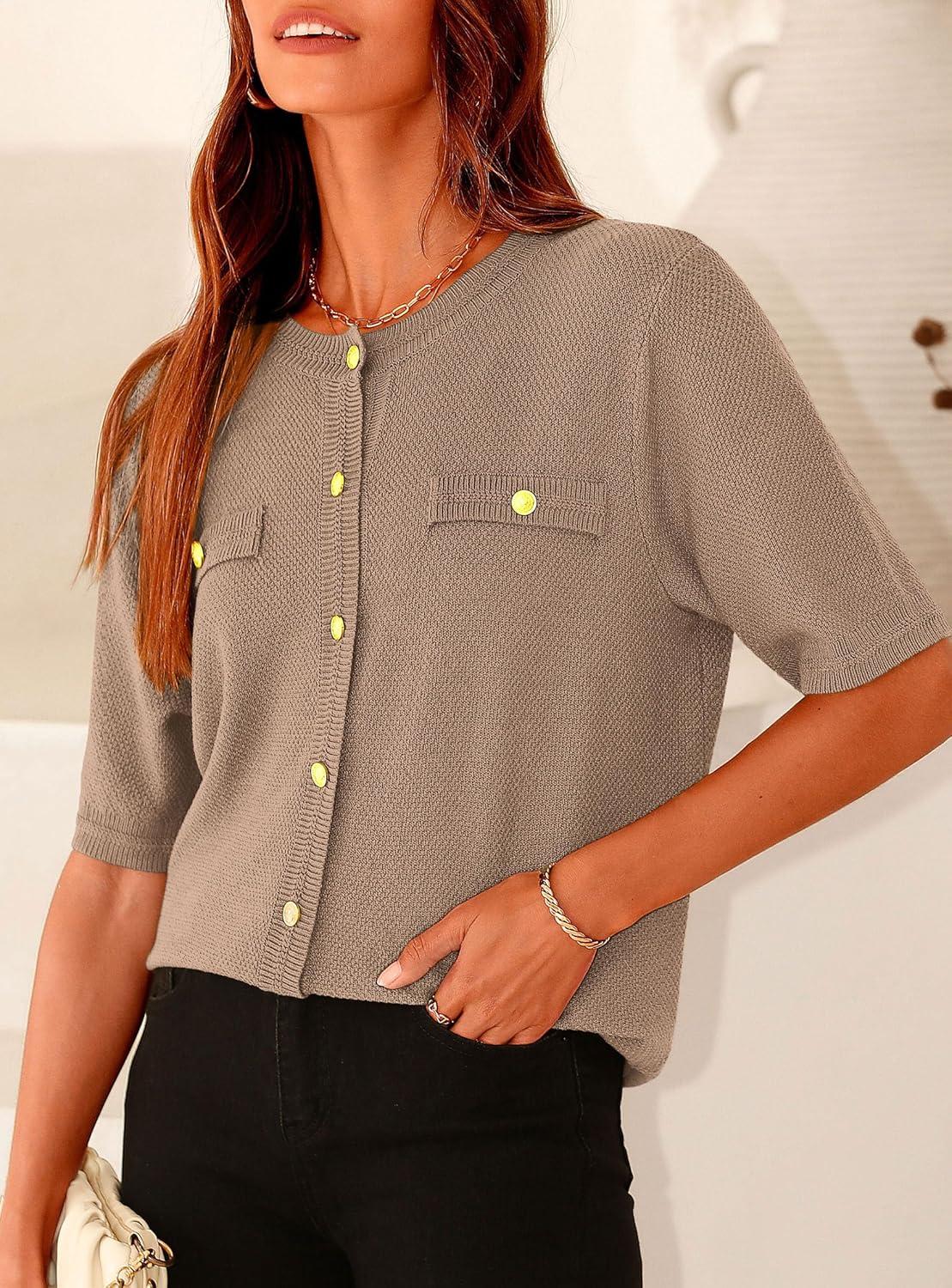 PRETTYGARDEN Women's Summer Button Down Shirts Casual Short Sleeve Crew Neck Ribbed Knit Blouse Top Cardigans(Khaki)