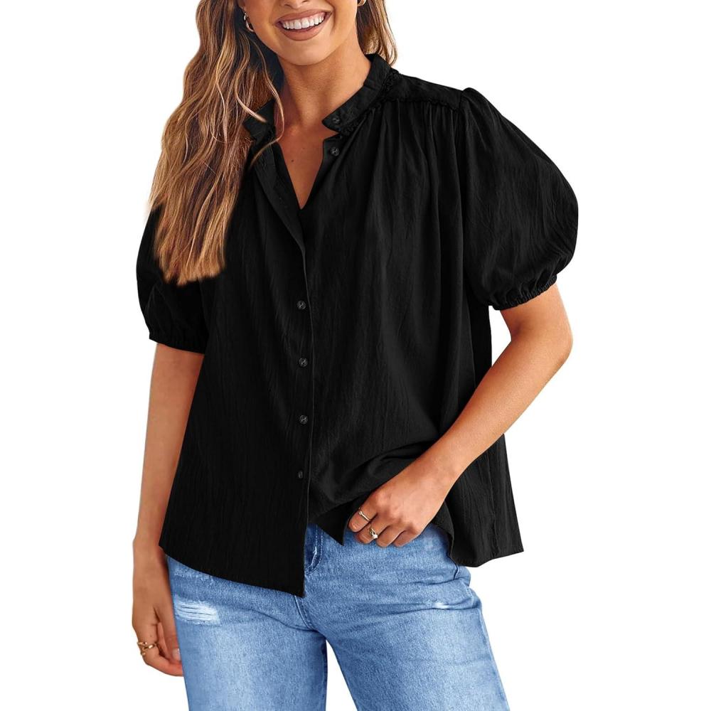 PRETTYGARDEN Women's Summer Button Down Shirts Short Lantern Sleeve V Neck Cotton Cute Dressy Casual Ladies Tops Blouses(Black)
