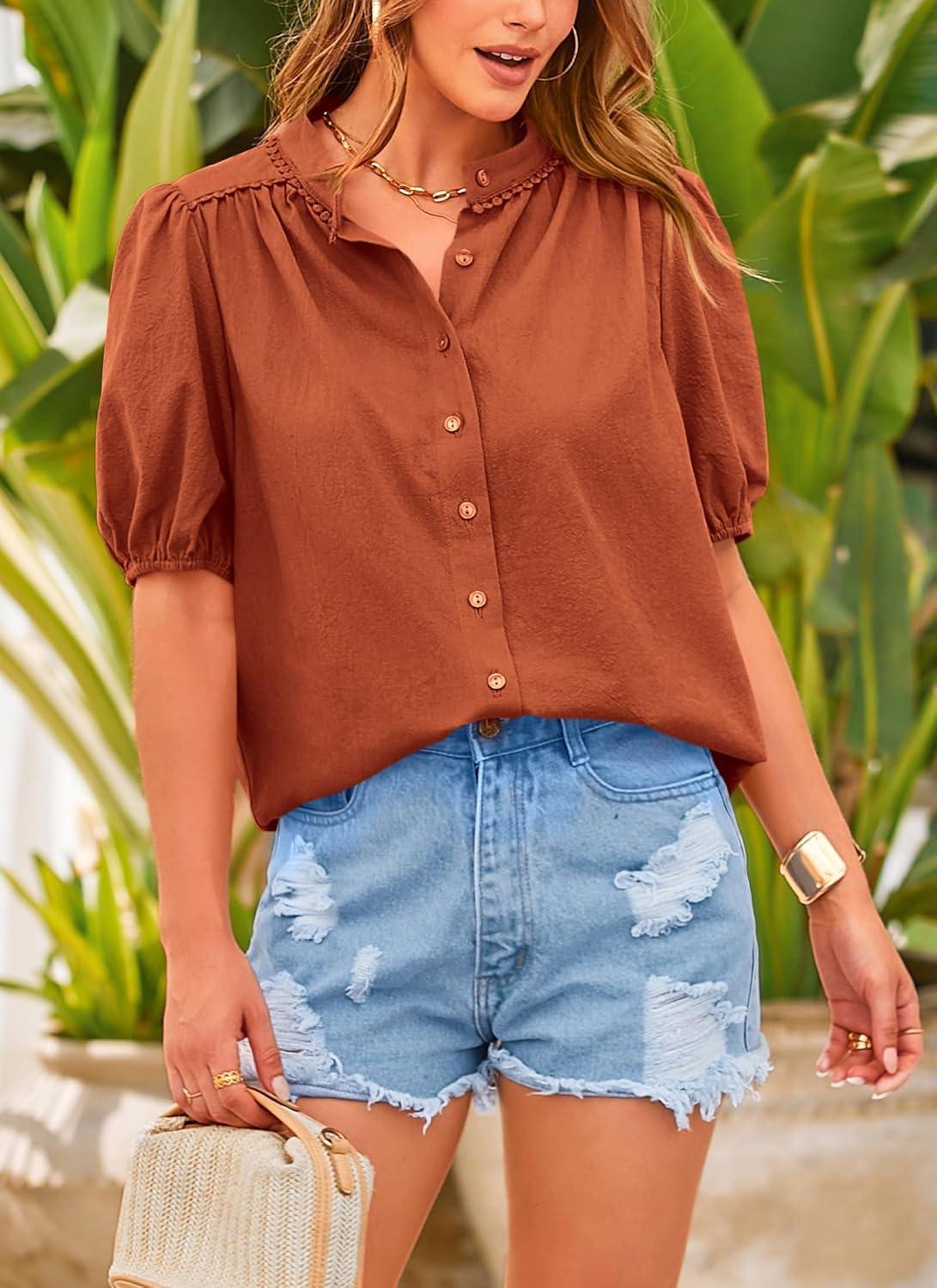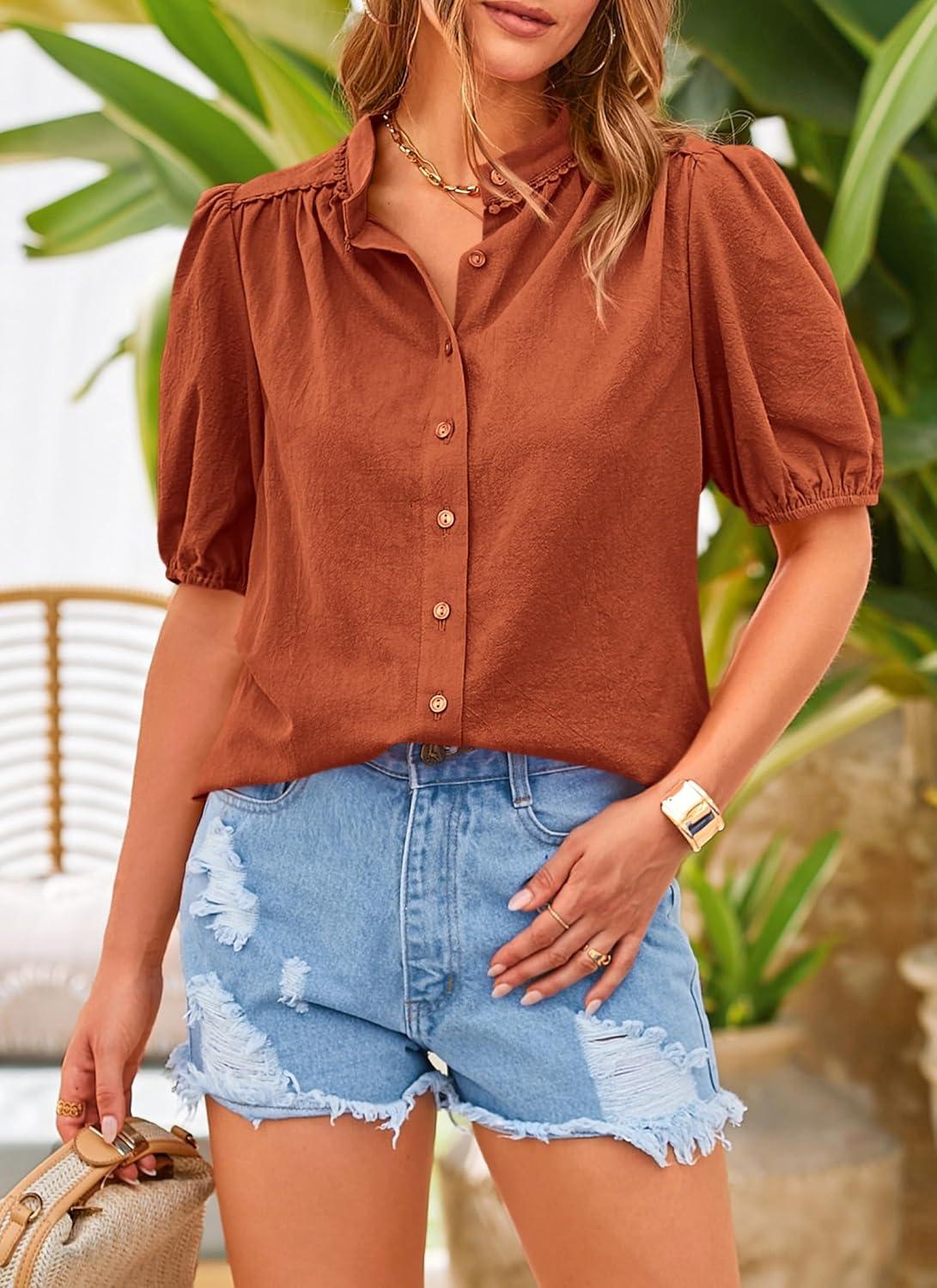 PRETTYGARDEN Women's Summer Button Down Shirts Short Lantern Sleeve V Neck Cotton Cute Dressy Casual Ladies Tops Blouses(Brick Red)