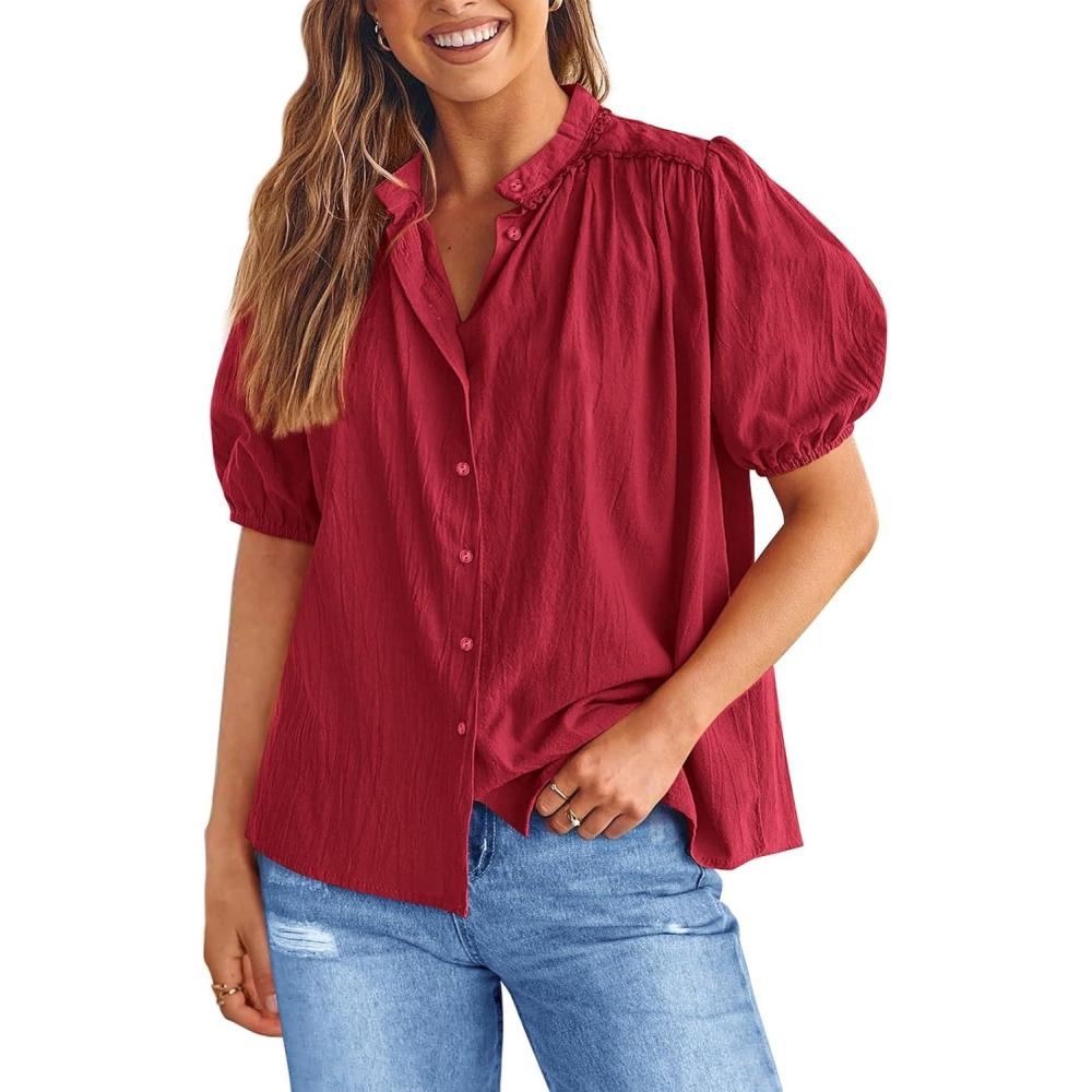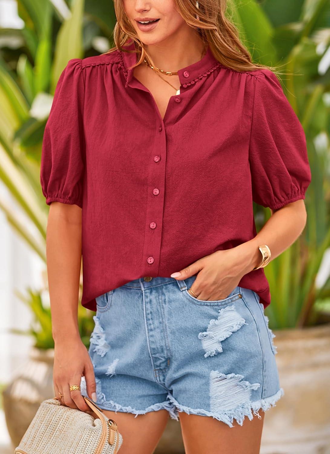 PRETTYGARDEN Women's Summer Button Down Shirts Short Lantern Sleeve V Neck Cotton Cute Dressy Casual Ladies Tops Blouses(Dark Red)
