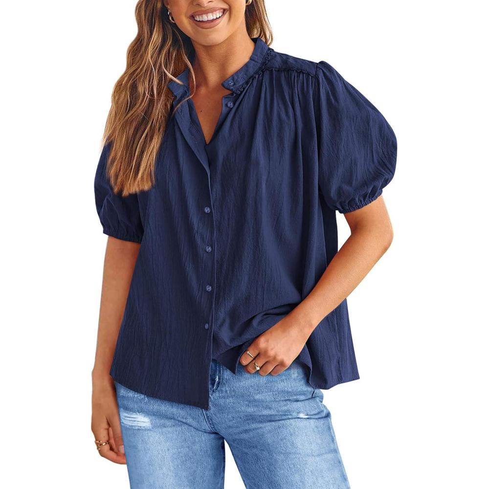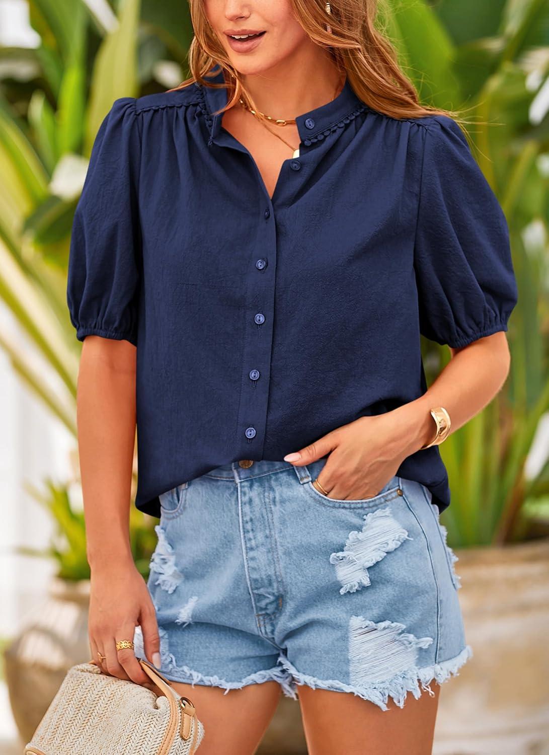 PRETTYGARDEN Women's Summer Button Down Shirts Short Lantern Sleeve V Neck Cotton Cute Dressy Casual Ladies Tops Blouses(Navy)
