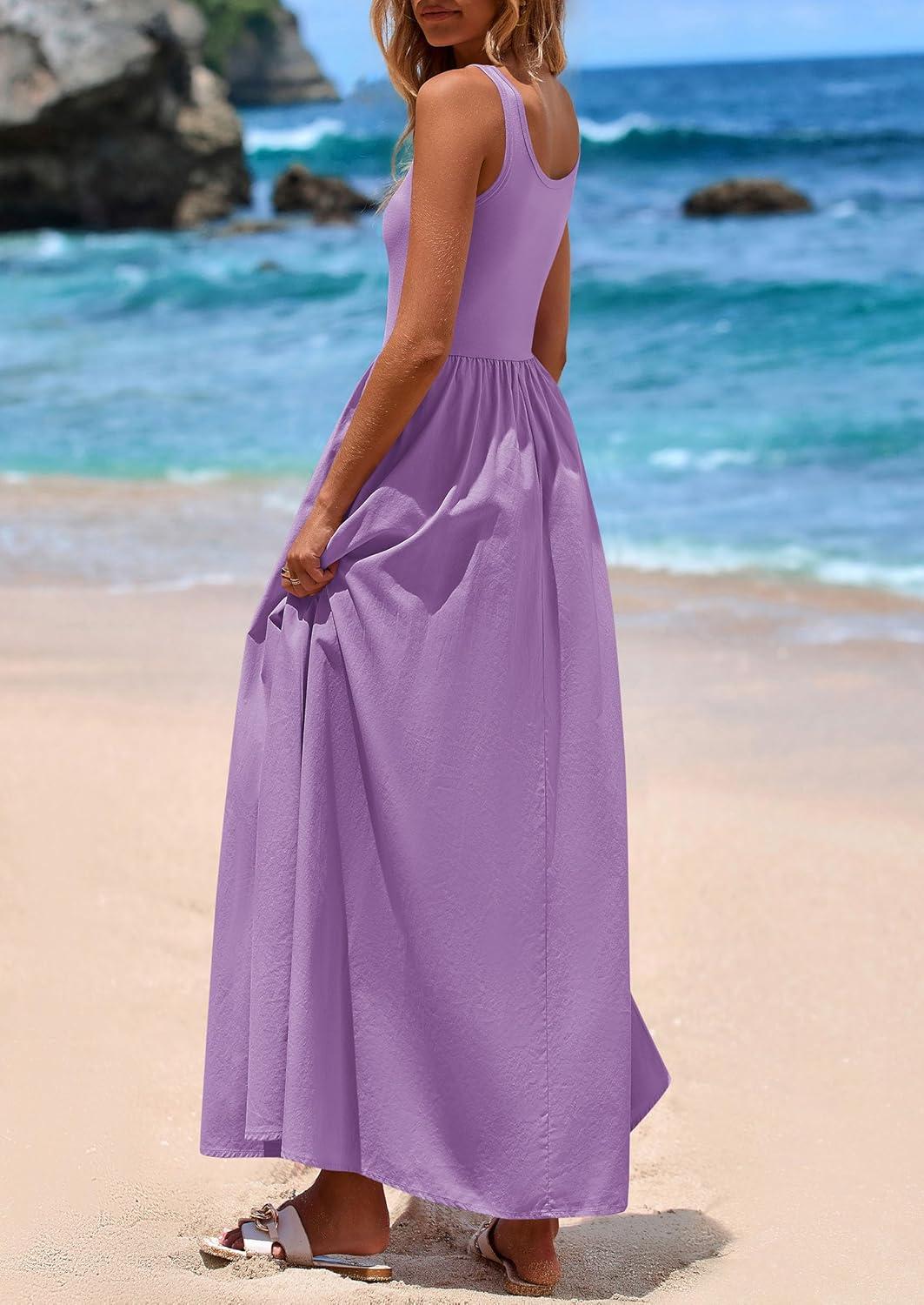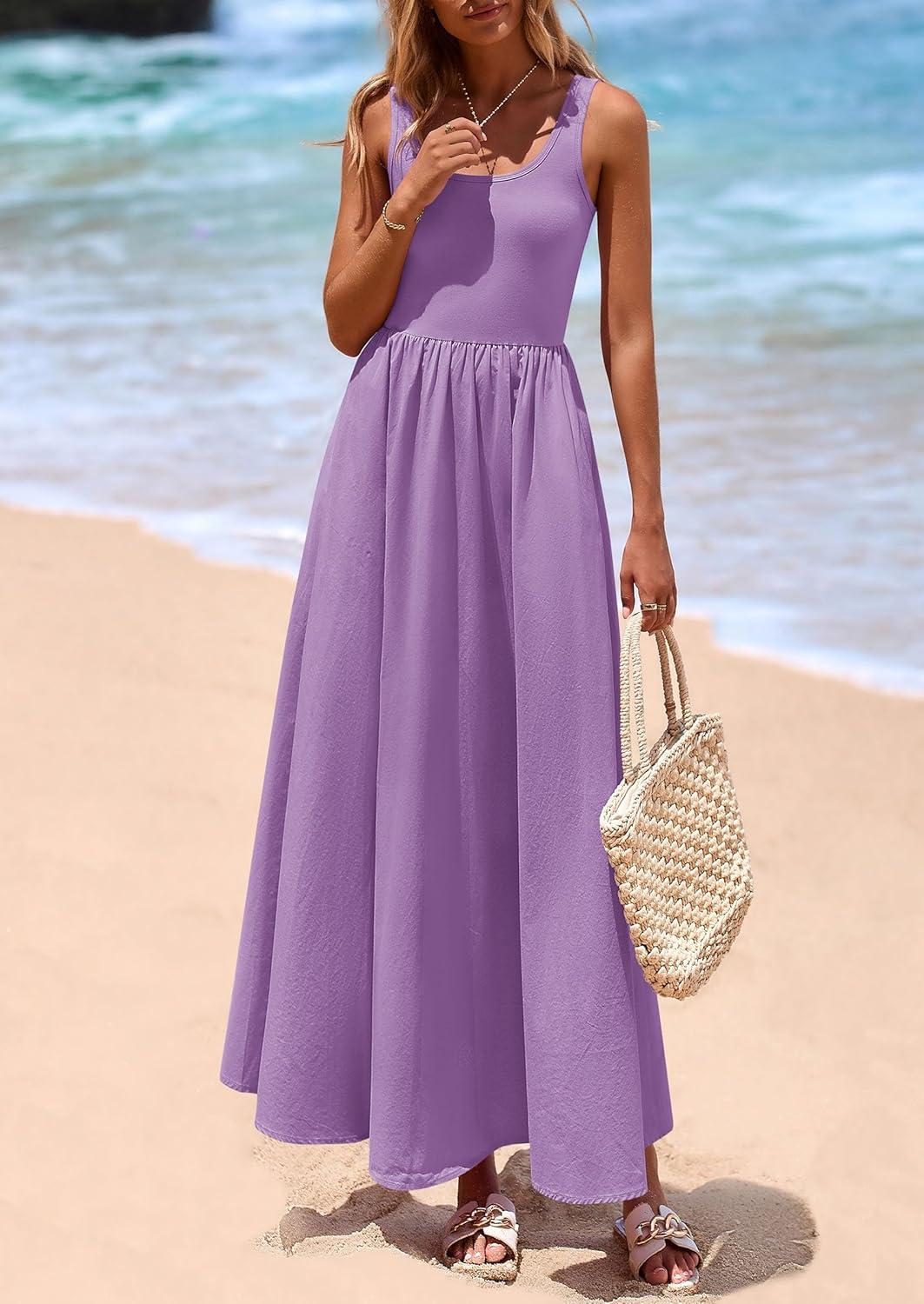 PRETTYGARDEN Womens Summer Casual Scoop Neck Sleeveless Long Dresses Tank Top Patchwork Aline Swing Maxi Dress with Pockets(Purple)