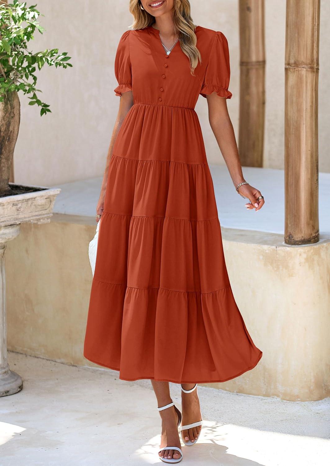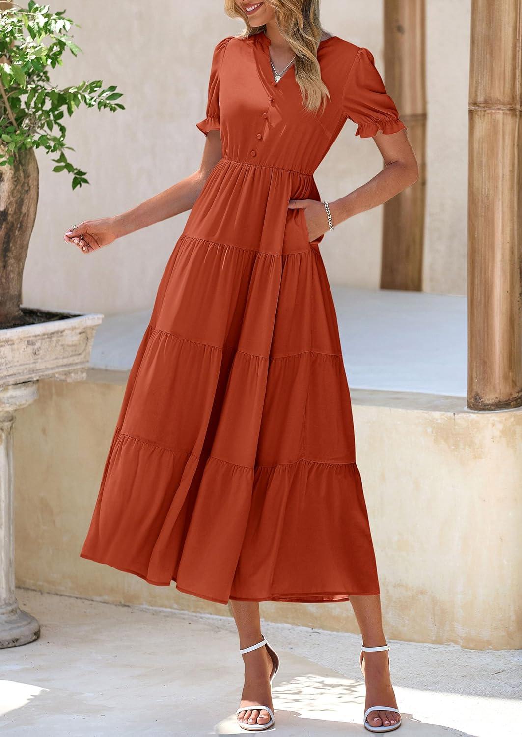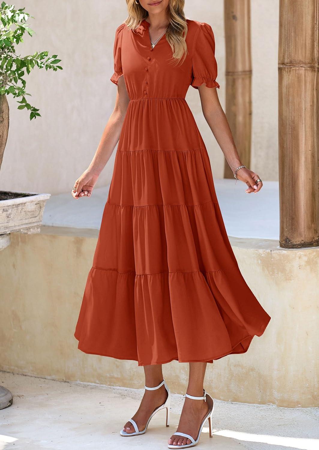 PRETTYGARDEN Women's Summer Casual Short Sleeve V Neck Midi Dresses 2025 Spring A-line Tiered Wedding Guest Dress(Brick Red)