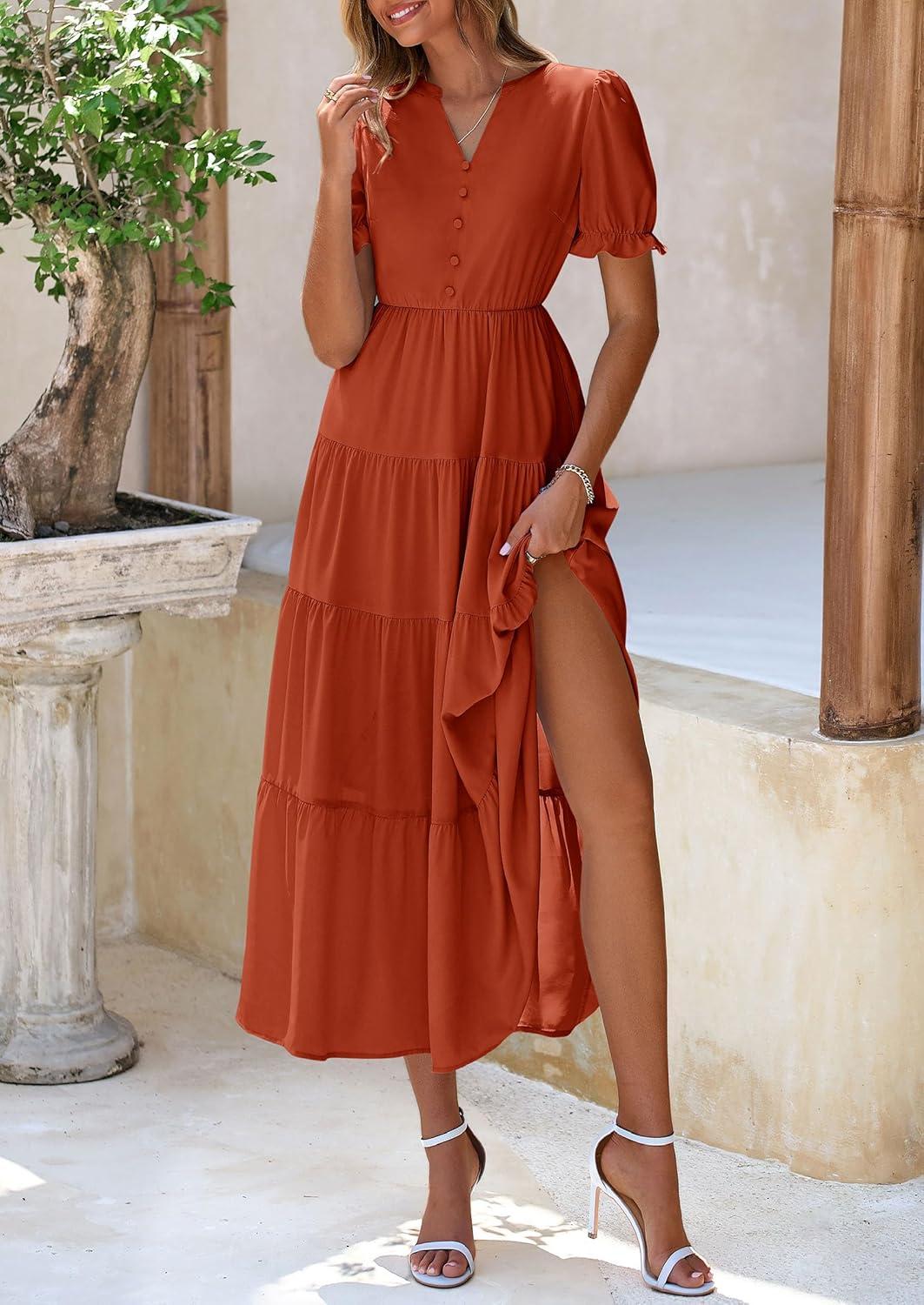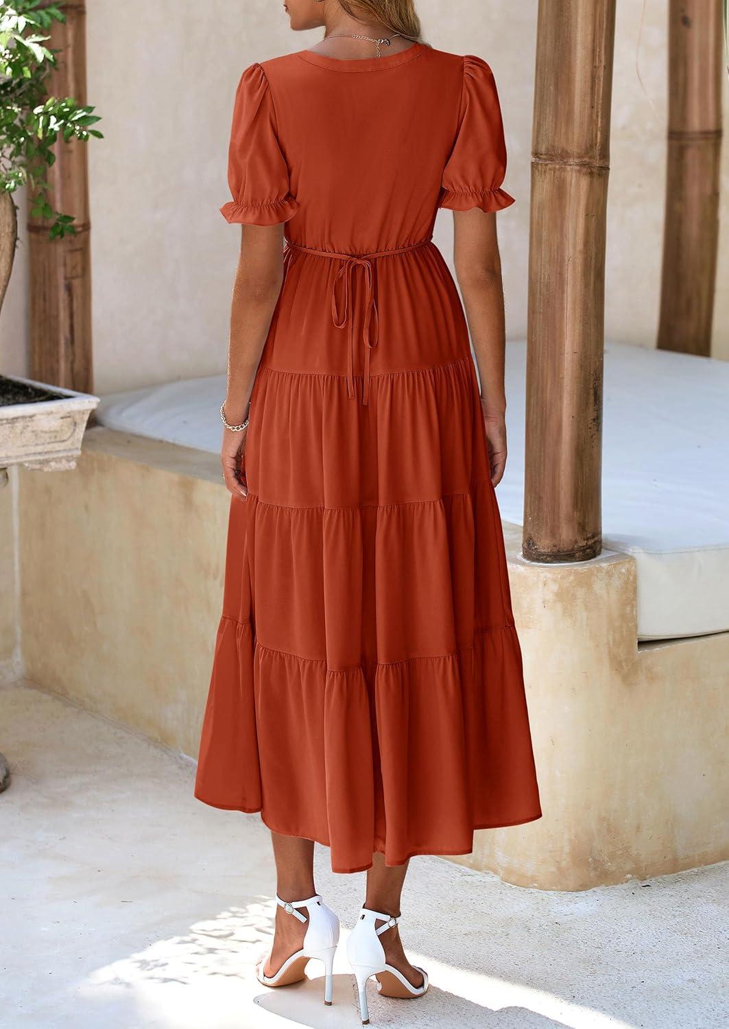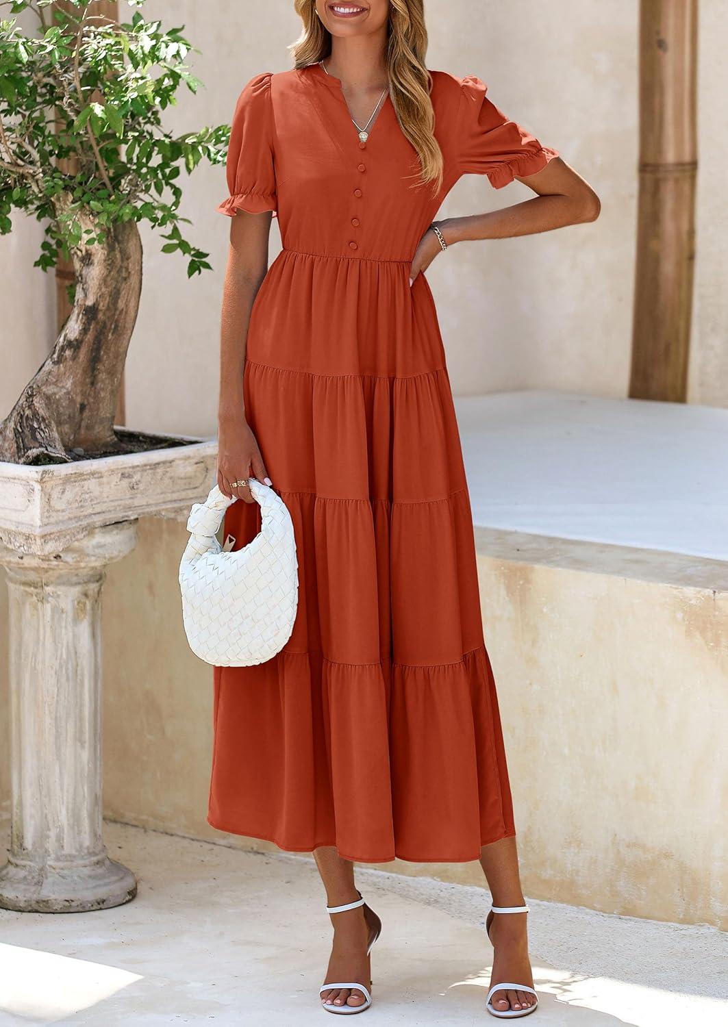 PRETTYGARDEN Women's Summer Casual Short Sleeve V Neck Midi Dresses 2025 Spring A-line Tiered Wedding Guest Dress(Brick Red)
